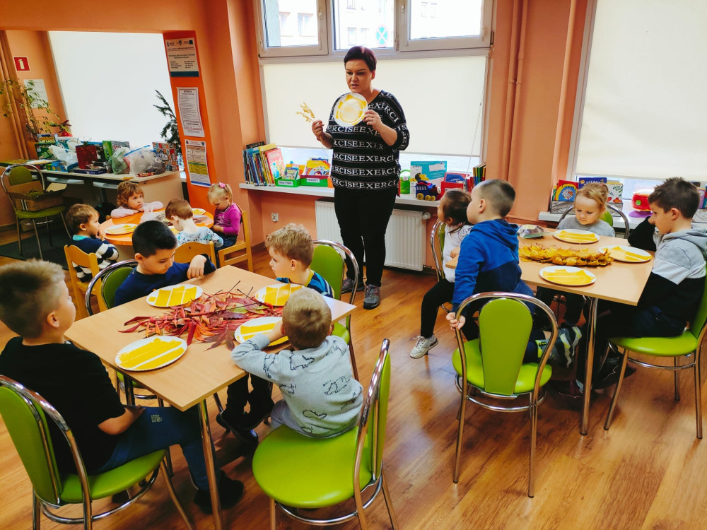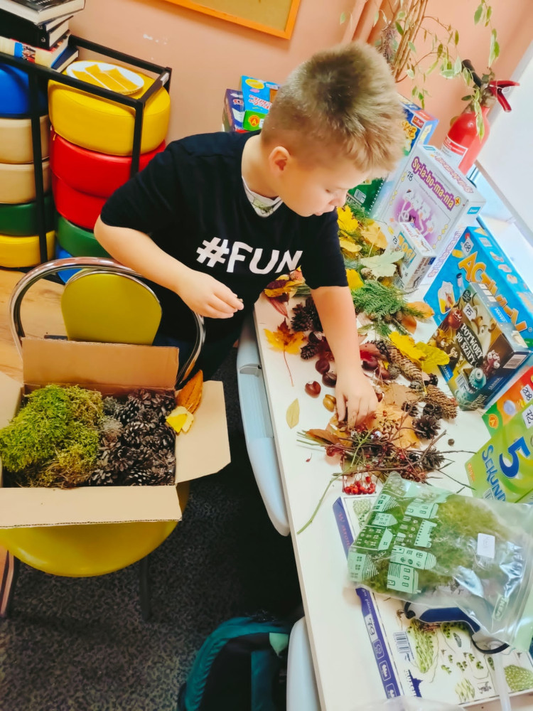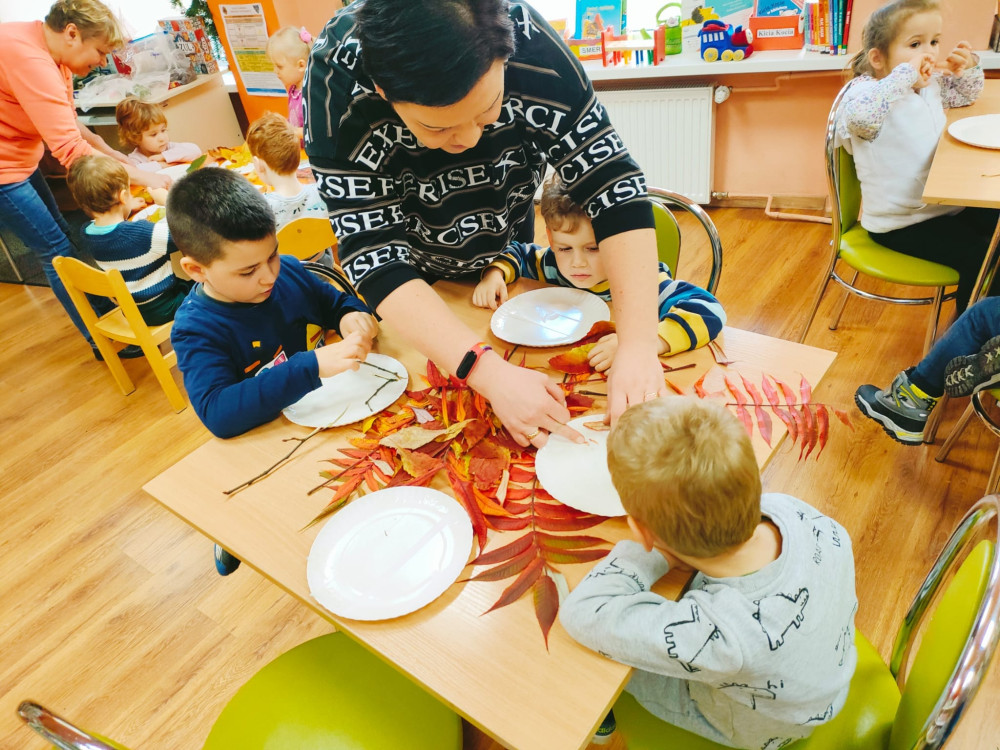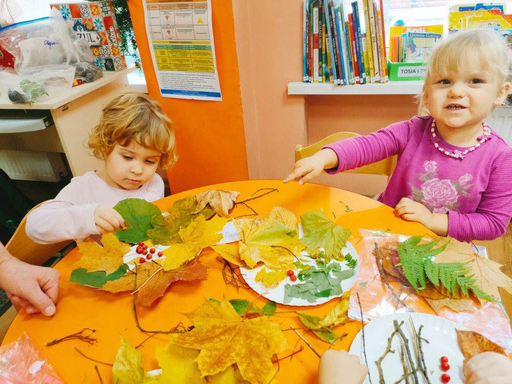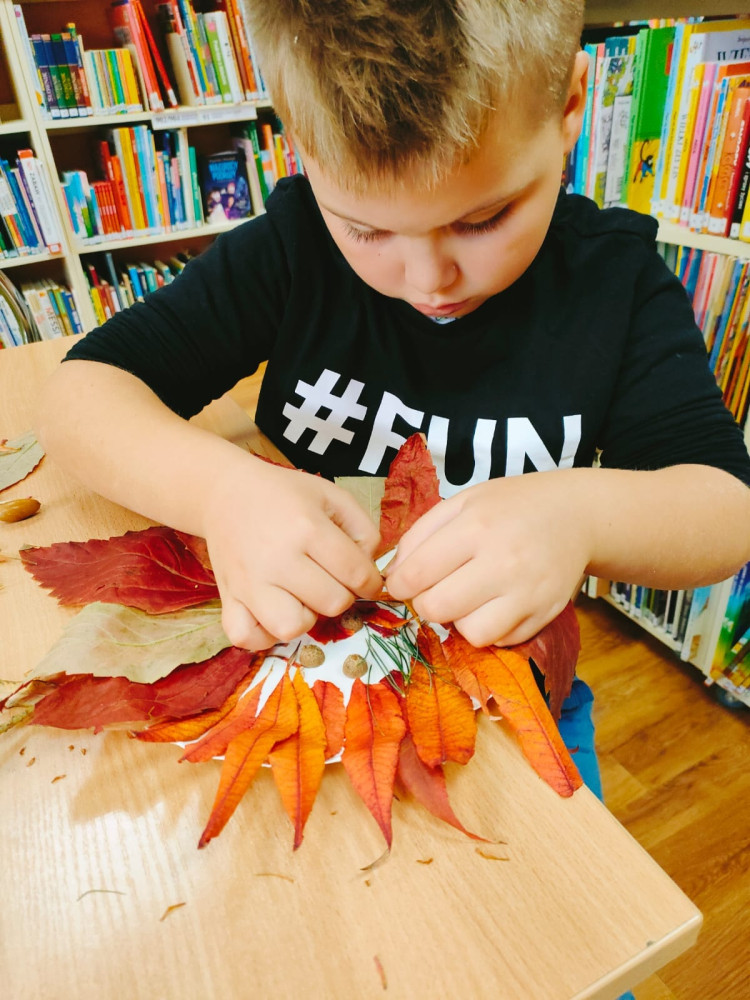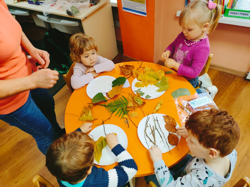Wykorzystując dary jesieni przyniesione przez dzieci, wspólnie wykonaliśmy portret Lwa. Wykorzystując liście, kasztany, szyszki i inne skarby, udało się nam wykonać podobiznę króla zwierząt.