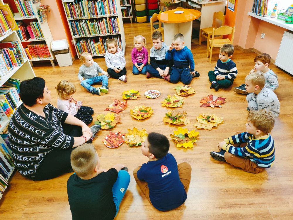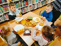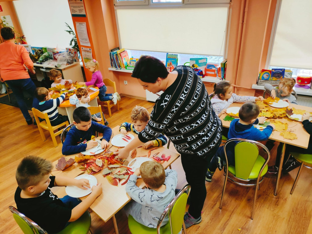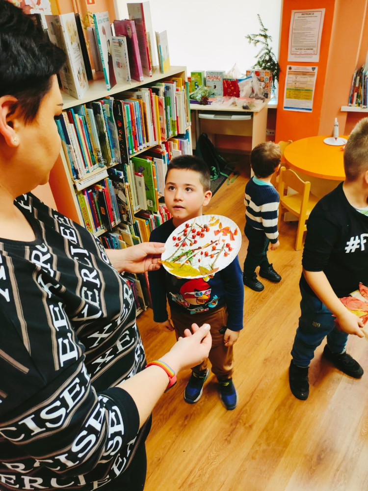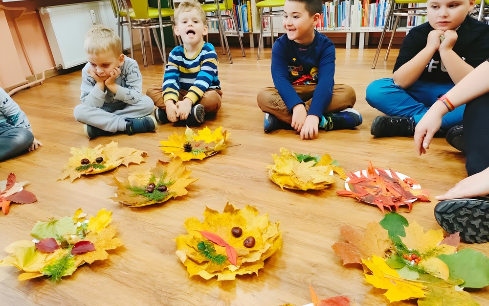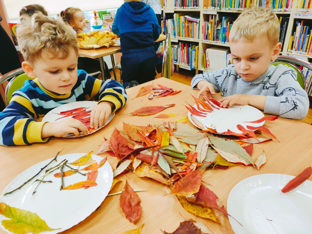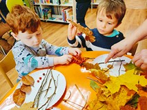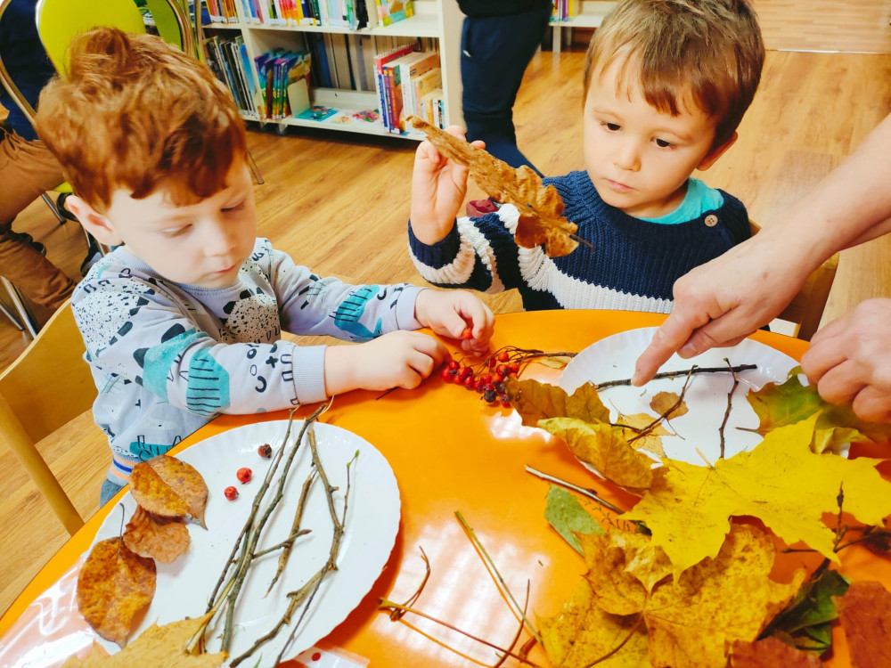 Wykorzystując dary jesieni przyniesione przez dzieci, wspólnie wykonaliśmy portret Lwa. Wykorzystując liście, kasztany, szyszki i inne skarby, udało się nam wykonać podobiznę króla zwierząt.