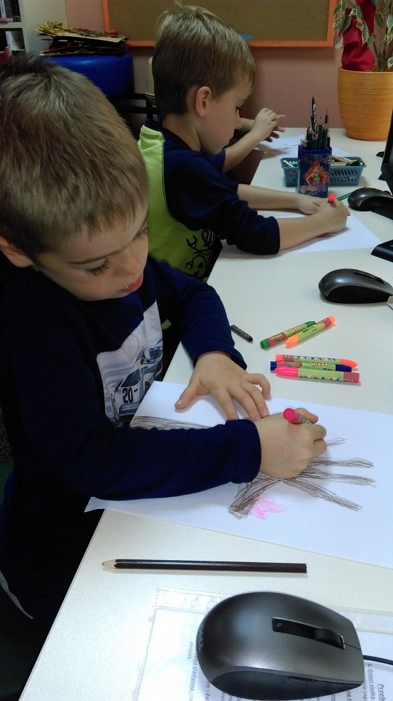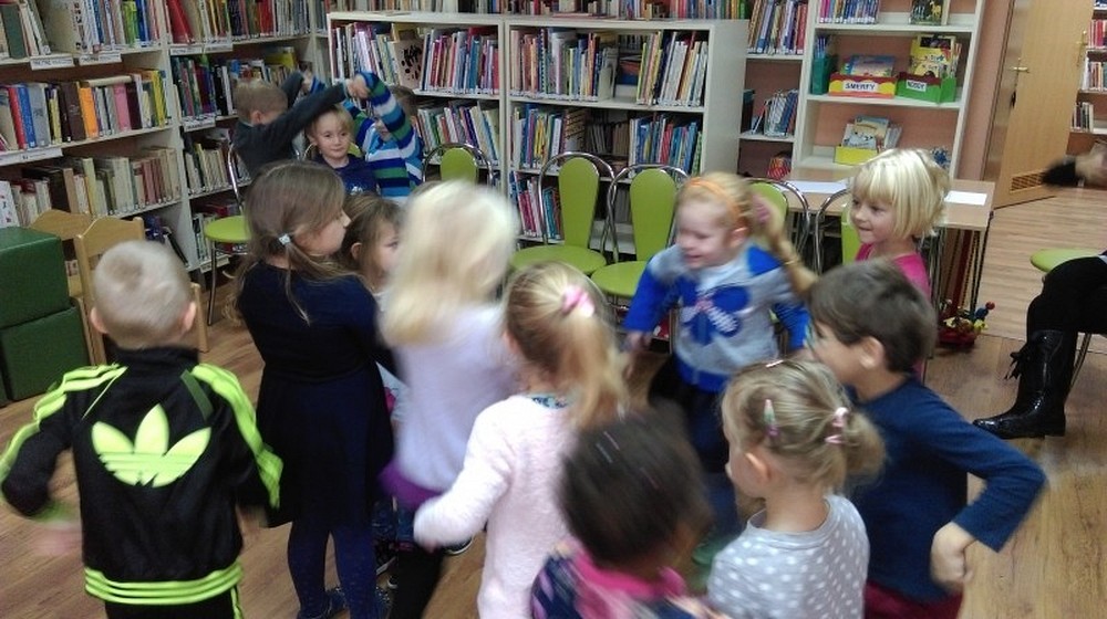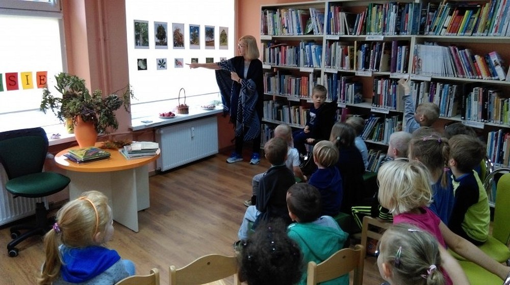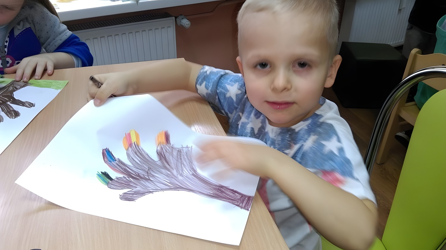 W piękny jesienny dzień przybyły do nas pięcioletnie przedszkolaki z zaprzyjaźnionego przedszkola Happy Days. Dzieci wysłuchały pięknego opowiadania pt. „Jesień liścia Jasia", opowieści o życiu i przemijaniu dla małych i dużych. Podczas pogadanki dzieci miały zadanie rozpoznać niektóre gatunki drzew, liści i ich owoców. Spotkanie zaowocowało wykonaniem jesiennej pracy przez dzieci, a na koniec bawiliśmy się w „Kasztanki".