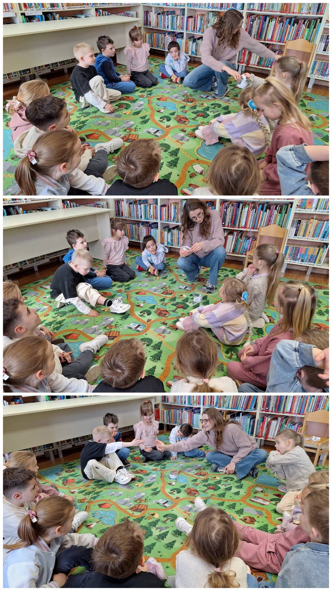 Następnie przedszkolaki brały udział w zabawach i zagadkach związanych z treścią opowiadania. Dużo radości przyniosła gra w „głuchy telefon”, podczas której dzieci mogły sprawdzić, jak łatwo zmienia się przekazywana informacja – co wywołało wiele śmiechu i pozytywnych emocji.