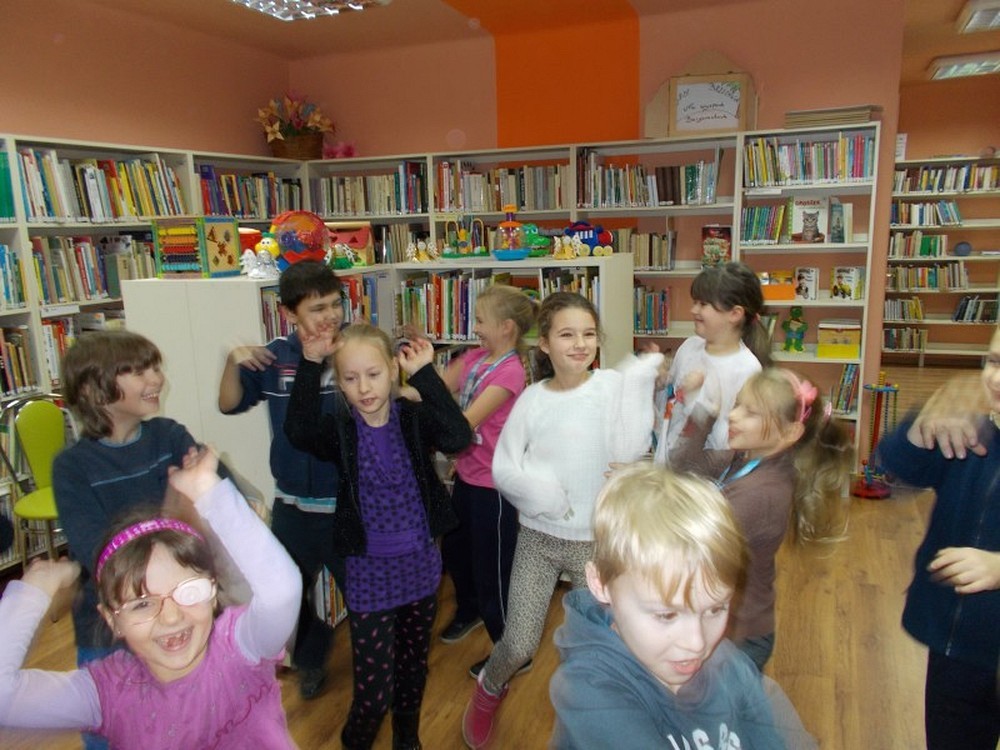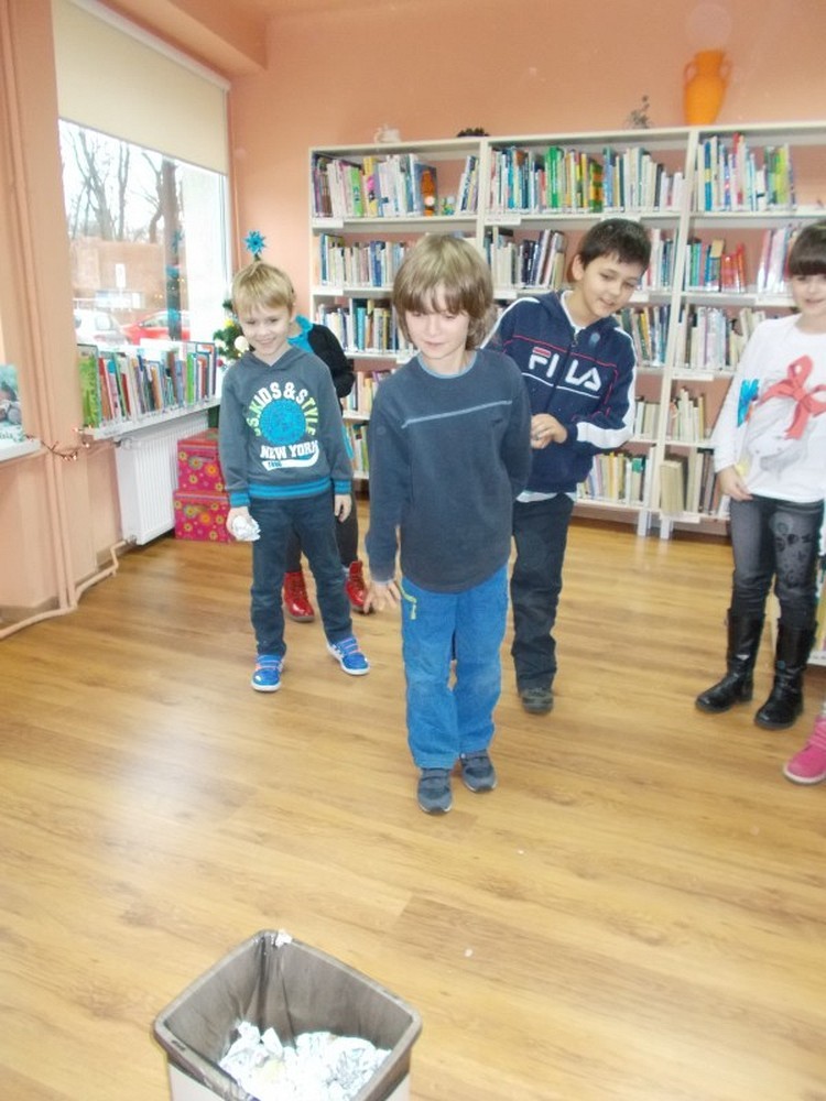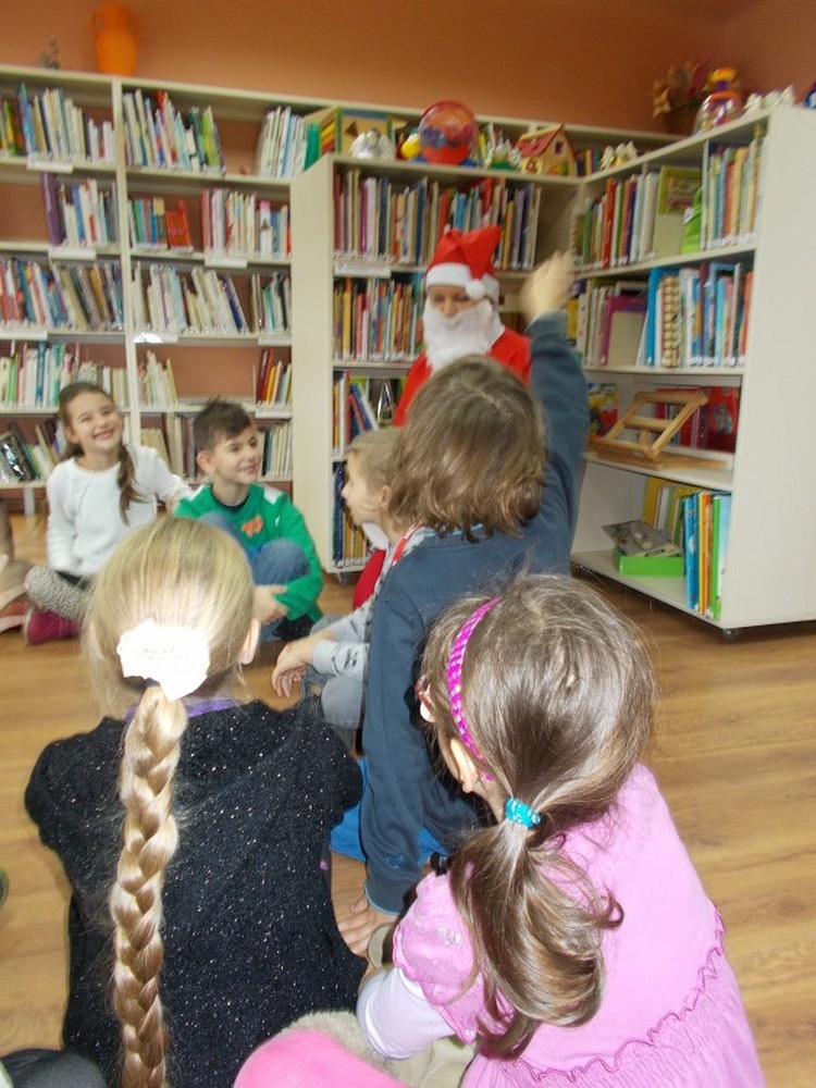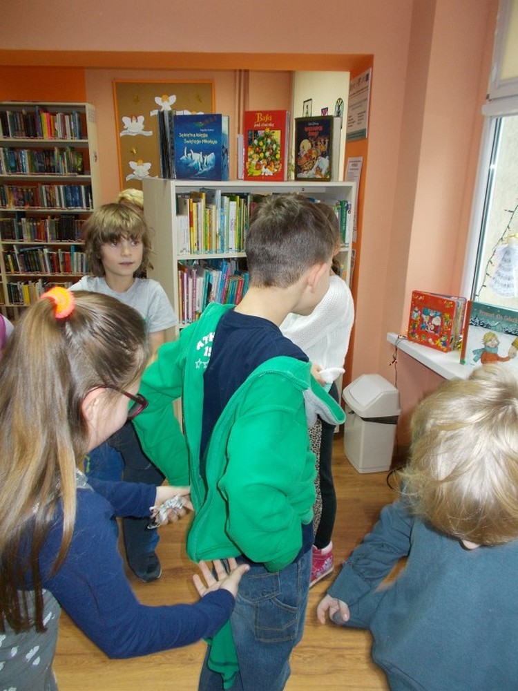 Uczniowie klasy II Szkoły Podstawowej nr 6, wierzą że Święty Mikołaj przynosi prezenty. Aby je zdobyć nasz biblioteczny Mikołaj przygotował dla nich zadania. Dzieci wykonywały je sprawnie i z dużym entuzjazmem. A to musiały zaśpiewać, potem zatańczyć, ułożyć rozsypankę, rzucić celnie kulką do kosza, założyć na lewą stronę bluzkę i wiele, wiele innych czasem nawet śmiesznych zadań. Na zakończenie było najtrudniejsze, bo gdzie w bibliotece Mikołaj schował worek z prezentami? Może w jakiejś książce?