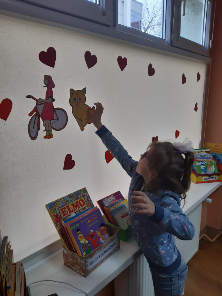 Podczas spotkania dzieci obejrzały i wysłuchały opowiadania "Rower Walentynki", dobrze zapamiętały kolejność osób i zwierzątek wsiadających na rower i aktywnie uczestniczyły w zabawach proponowanych przez bibliotekarkę.