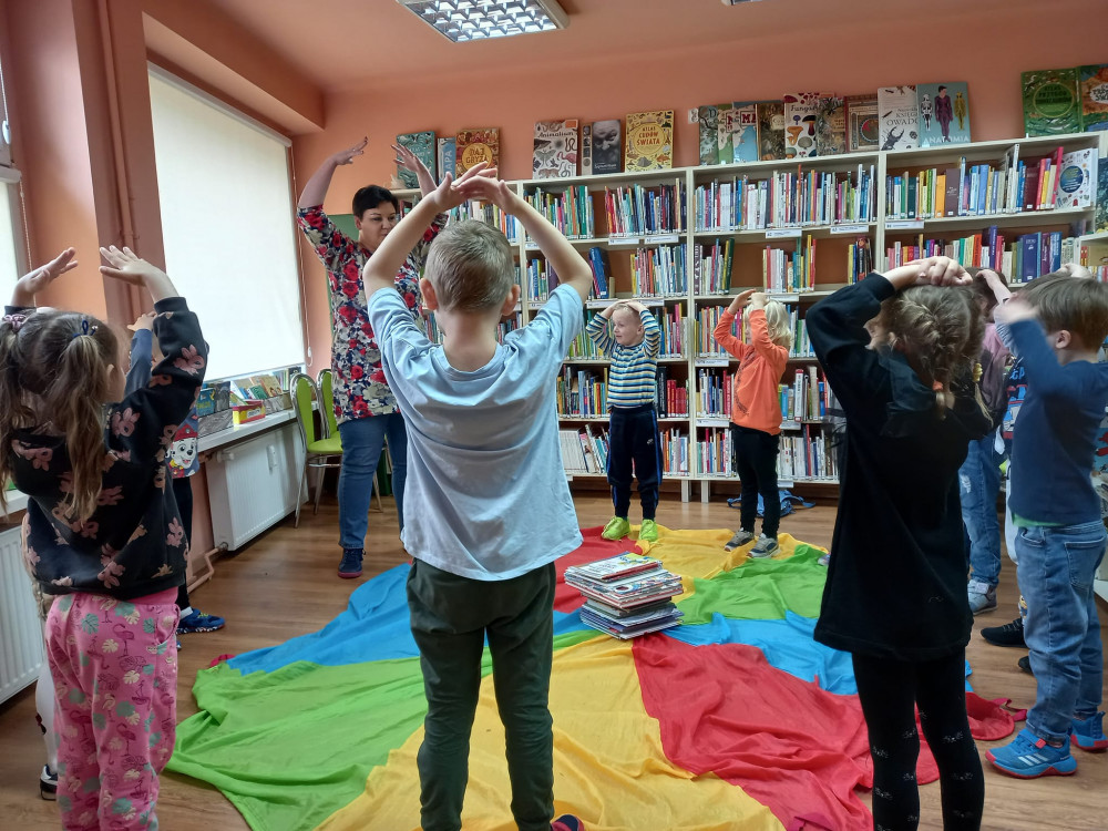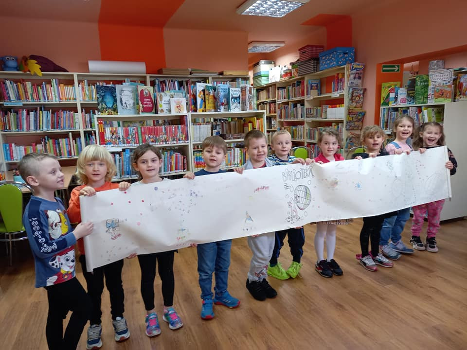 W trakcie spotkania i małej zabawnej gimnastyki, dzieci wykonały dłuuuugą laurkę dla książek na całym świecie.