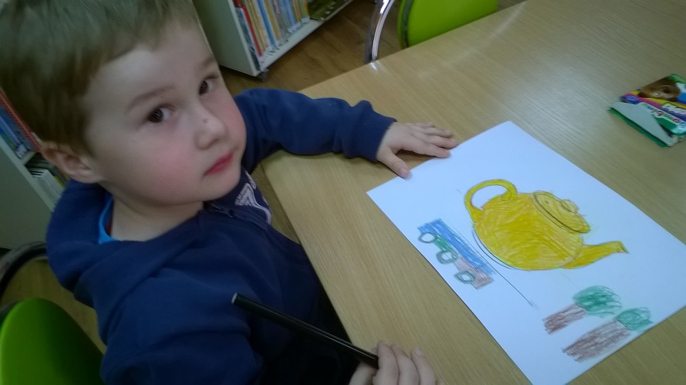 Dzisiaj odwiedziła nas, po raz pierwszy, grupa 5-latków z Przedszkola nr 10 w Koszalinie. Dzieci zapoznały się z zasadami korzystania z biblioteki oraz z ciekawym księgozbiorem. Z uwagą wysłuchały opowiadania o przygodach czajniczka i Bianki z opowiadania „Czajniczek” Watanabe Etsuko, następnie pięknie pokolorowały czajniczek. Był też czas na zabawę z kolorową chustą animacyjną, a na zakończenie dzieci otrzymały zakładki do książek.
