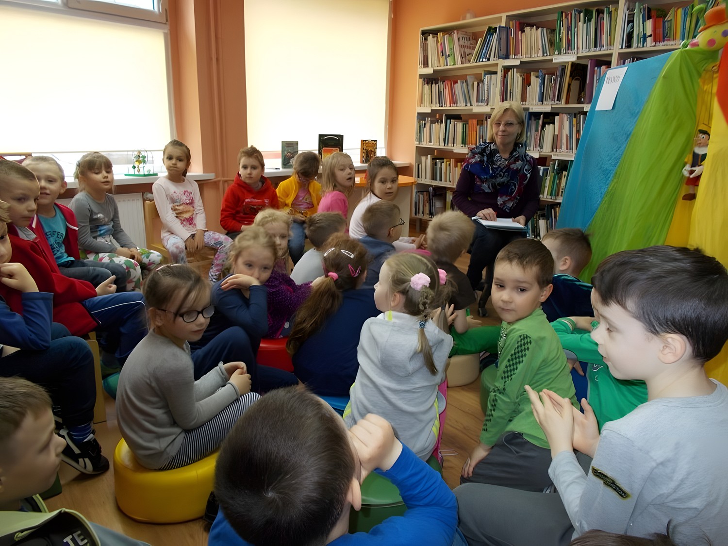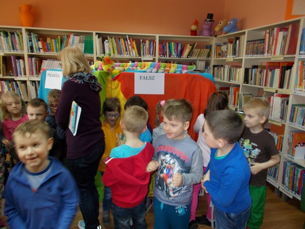 Dnia 20 kwietnia przybyły do nas, na kolejne spotkanie z bajką, „Pszczółki" z Przedszkola nr 10 w Koszalinie. Dzieci miały okazję zapoznać się z książkami, w których sprawdza się powiedzenie że „Kłamstwo ma krótkie nogi". Przedszkolaki z uwagą wysłuchały również bajki o kłamczuchu – drewnianym pajacyku i jego przygodach, by następnie poprawnie rozwiązywać proponowane zagadki.