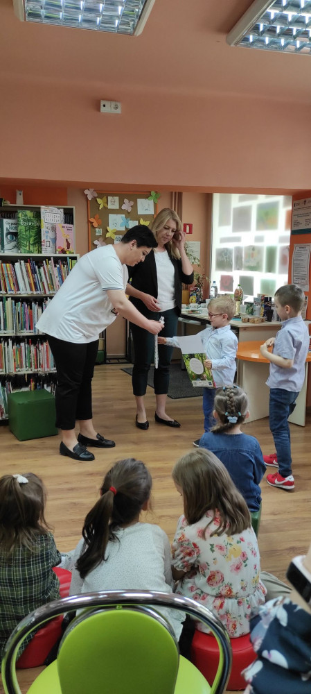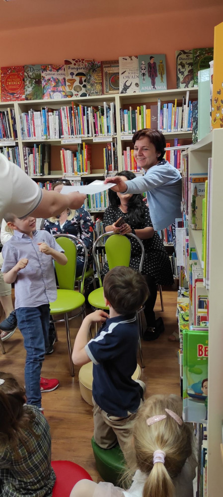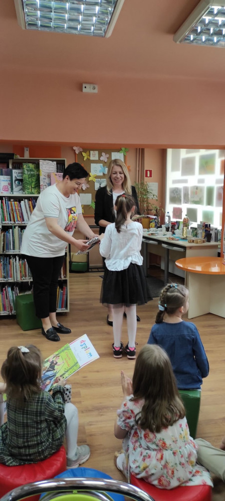 Na zakończenie spotkania dzieci otrzymały nagrody w postaci książek i gadżetów bibliotecznych z rąk Pani Dyrektor Koszalińskiej Biblioteki Publicznej Beaty Sawy- Jovanowskiej.