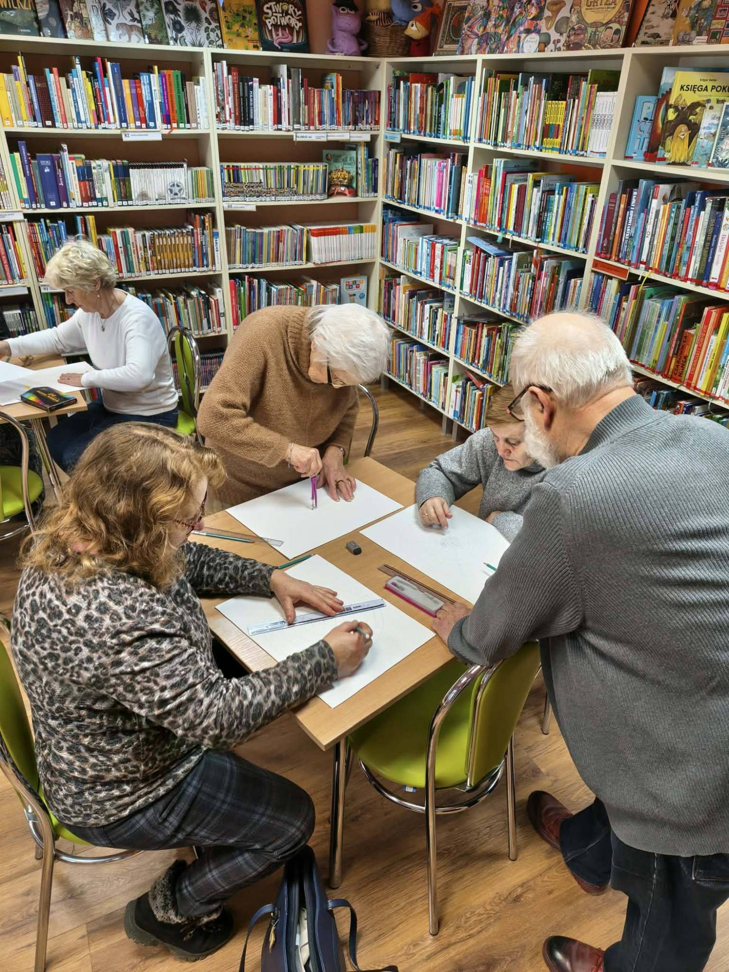 Grupa seniorek z Klubu Osiedlowego "Kanion" pod "okiem" Waldemara Jarosza oraz nasi czytelnicy uczestniczyli w warsztatach mandalowych w naszej filii.