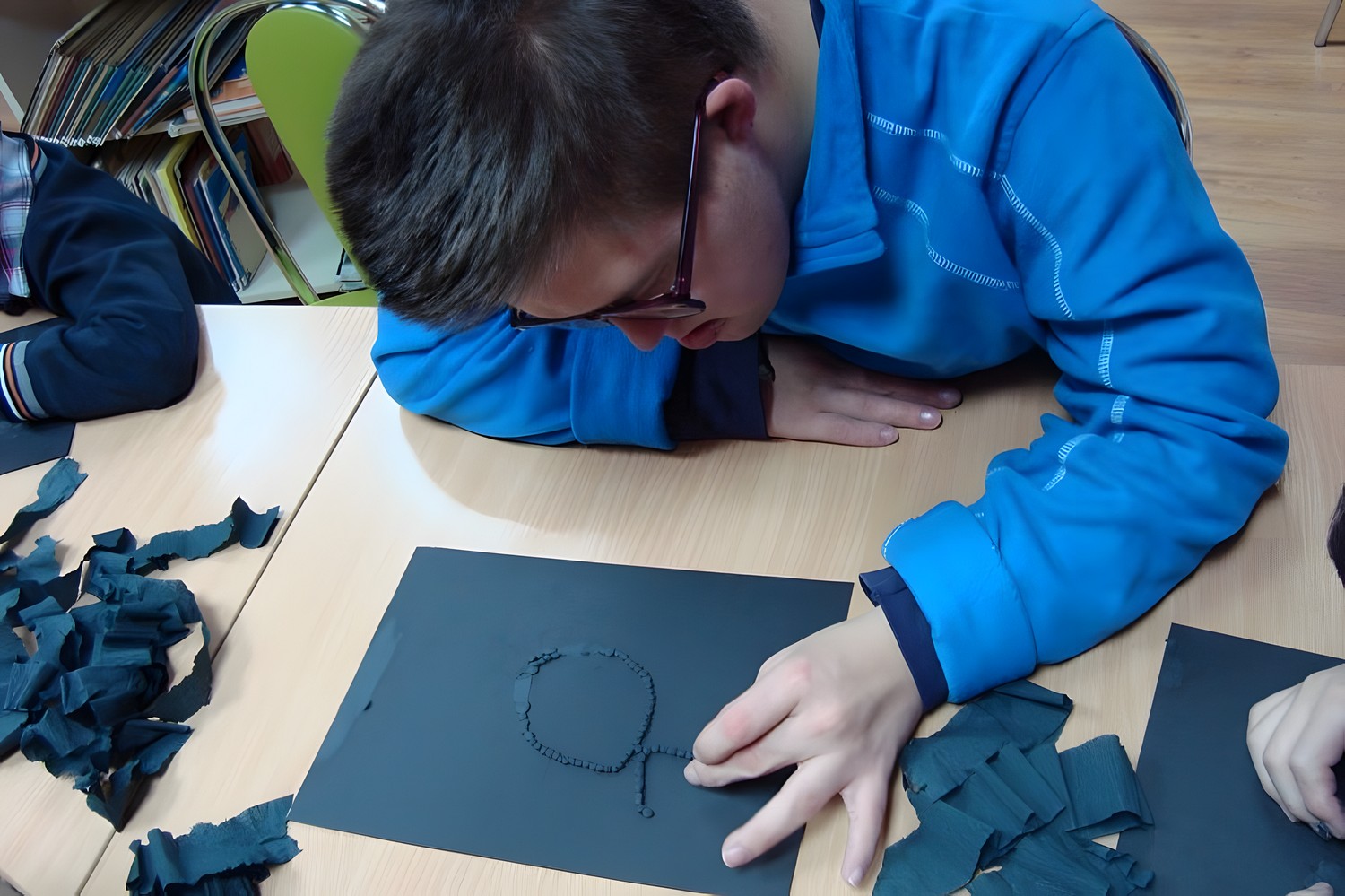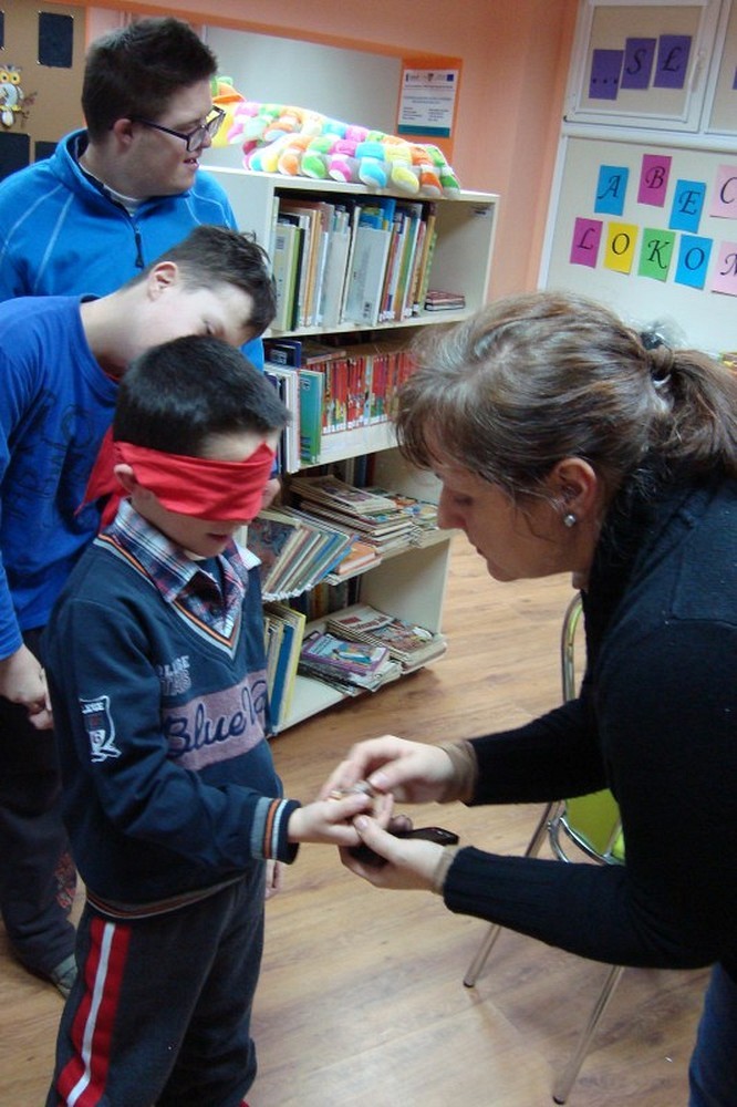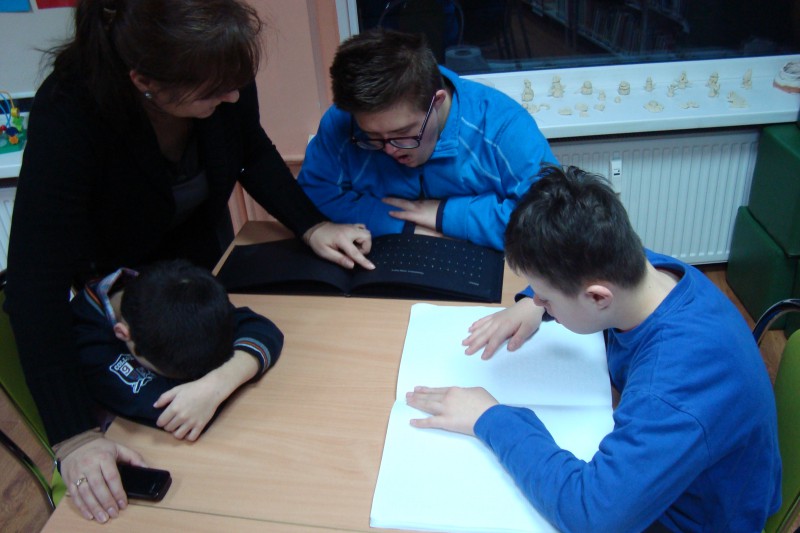 Chłopcy zamknęli oczy, uruchomili swoją wyobraźnię i wszystkie pozostałe zmysły. Przede wszystkim dotyk. Wczuli się w postać osoby niewidomej. Czarne strony tej książki mają nadrukowane wypukłe, wyczuwalne pod opuszkami palców ilustracje na przykład liście lub spadające krople deszczu. Od razu ujawniło się, jak niesprawny mamy dotyk, jak niewiele potrafimy rozpoznać pod palcami...