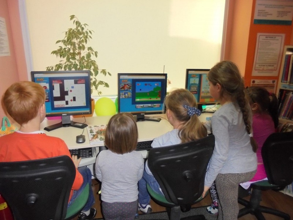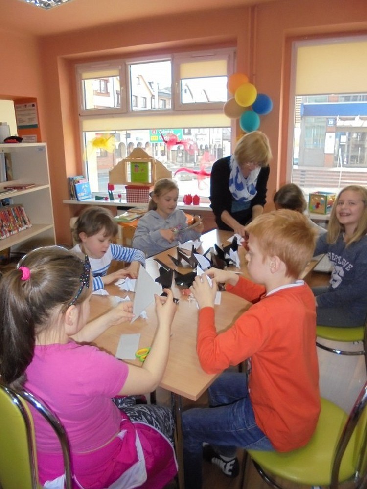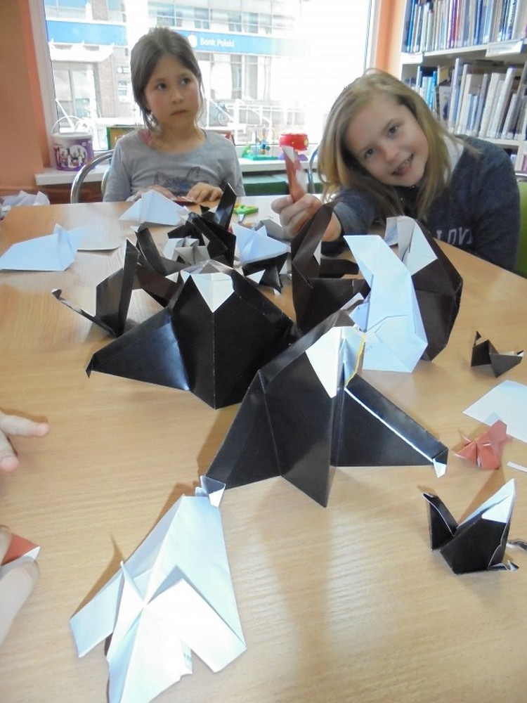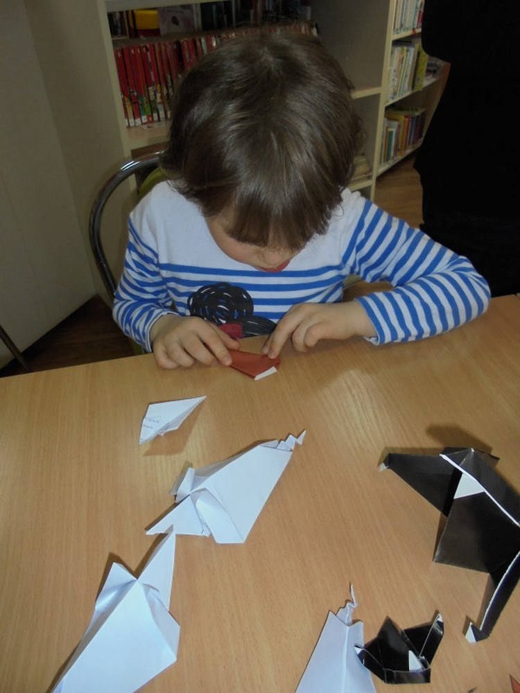 Czekając na zajęcia starsze dzieci relaksują się przy grach komputerowych, rodzice odpoczywają, a najmłodsi świetnie bawią się naszymi zabawkami. Kolejne spotkanie z orgiami, tym razem składaliśmy zakładki, myszki i zakonnice. Składanie papieru idzie dzieciom coraz lepiej.