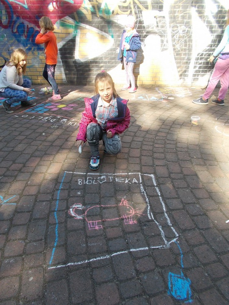Nasze dzieci lubią u nas się spotykać, lubią też nasze wspólne zabawy. Tym razem, z uwagi na ciepłą wiosenną pogodę, spotkanie odbyło się częściowo w bibliotece i w plenerze. Dzieci radośnie się bawiły, wykonały też laurkę dla swojej ulubionej biblioteki, tworzyliśmy również listę na wakacyjne zajęcia.