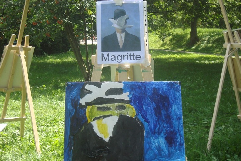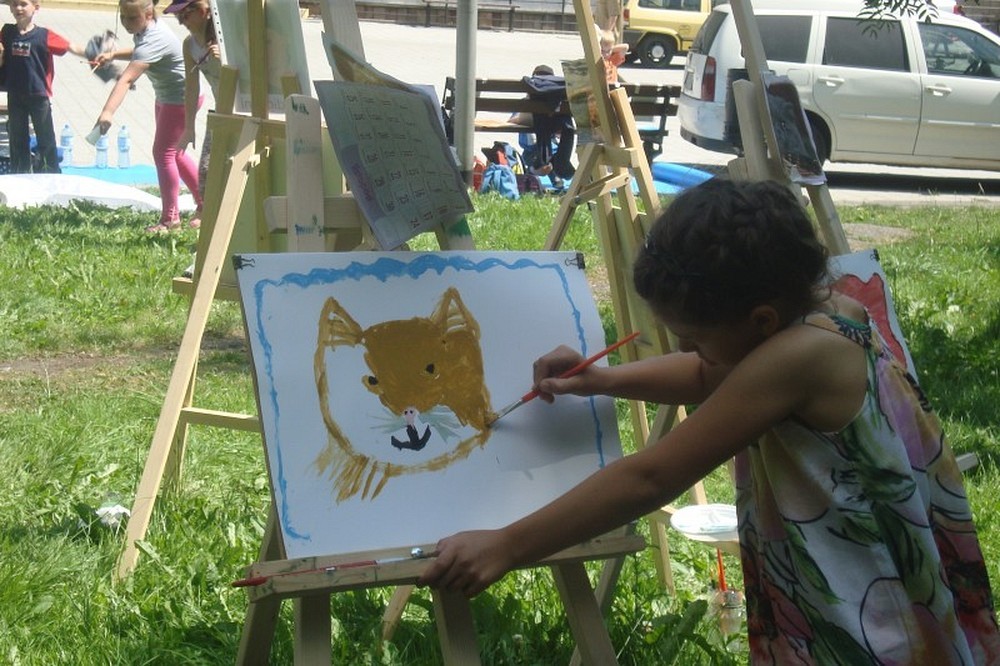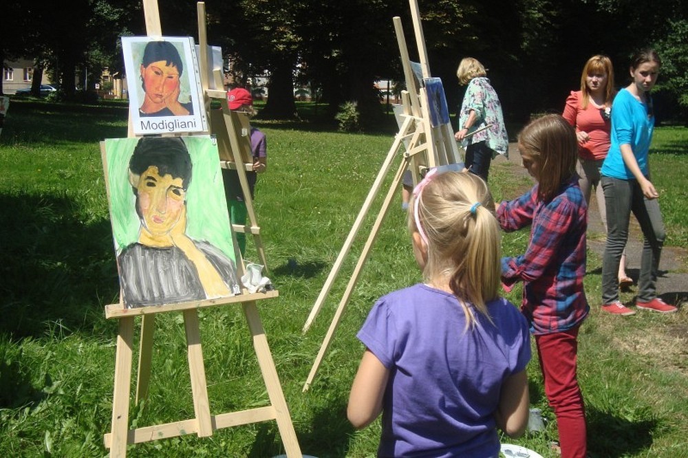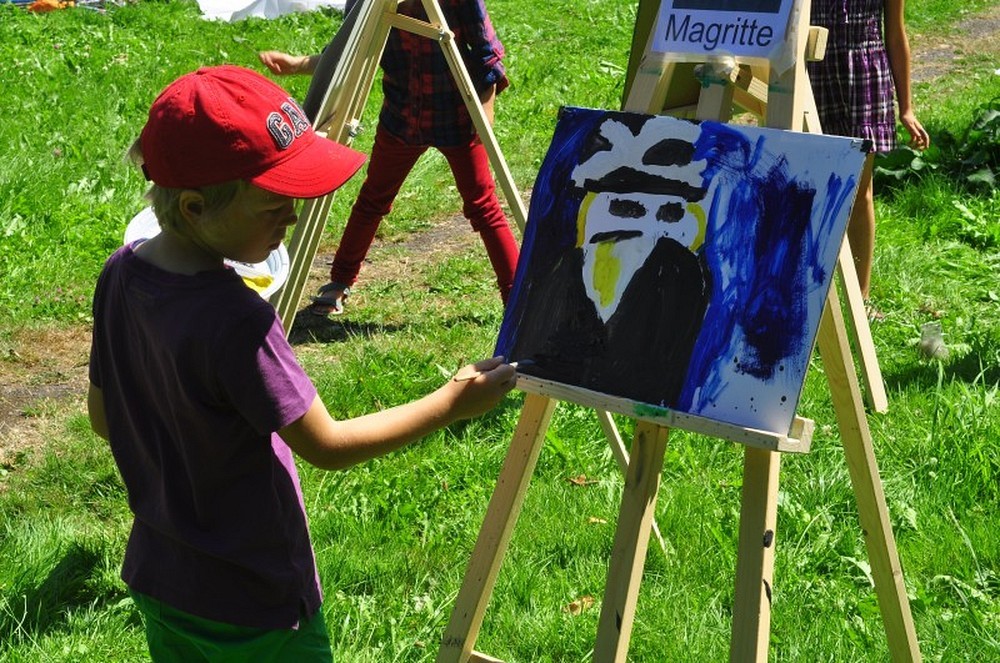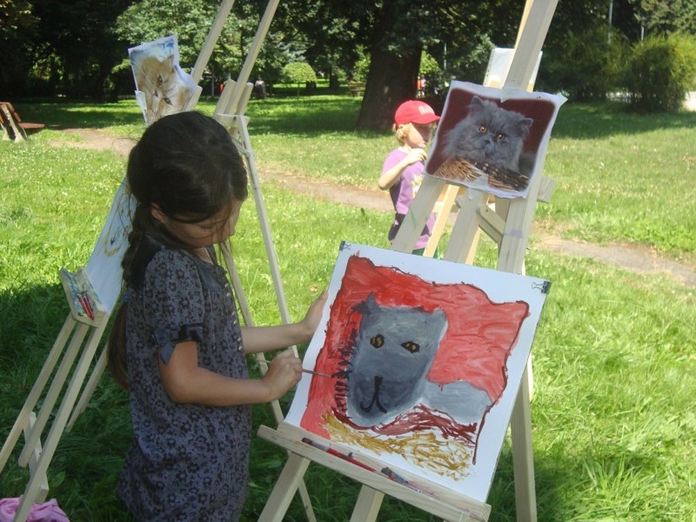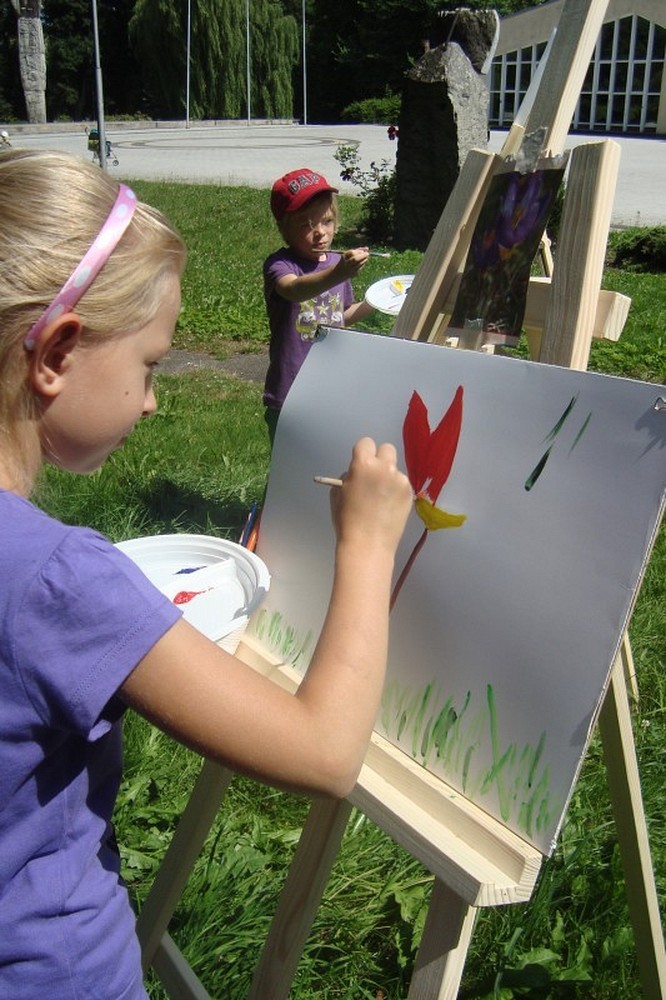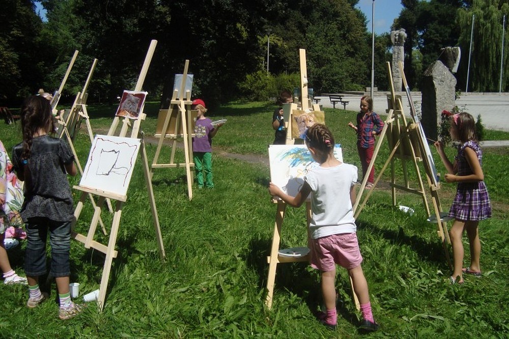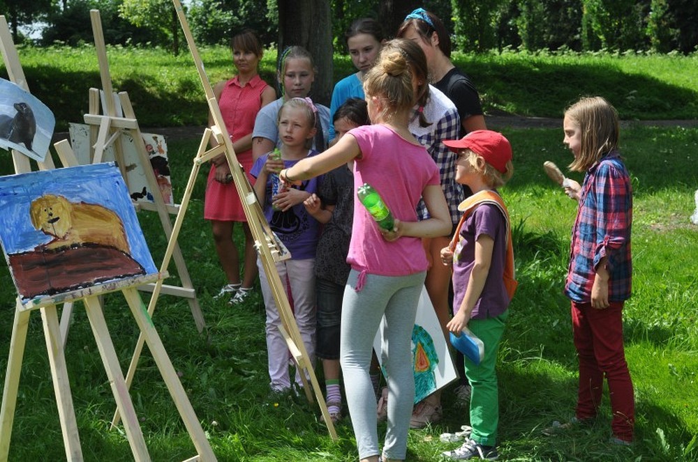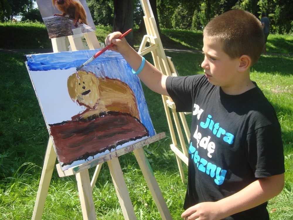 Okolice parku przy Koszalińskiej Bibliotece Publicznej były miejscem warsztatów plastycznych prowadzonych, dla naszych dzieci, przez artystę - Witka Michonia. Dzieci pod okiem pedagoga wzięły pędzle w dłoń i farby były wszędzie - i na kartce i na nosie. Plener i profesjonalizm pana Witka sprawiły, że dzieci stały się malarzami, czego efektem były większe i mniejsze arcydzieła.