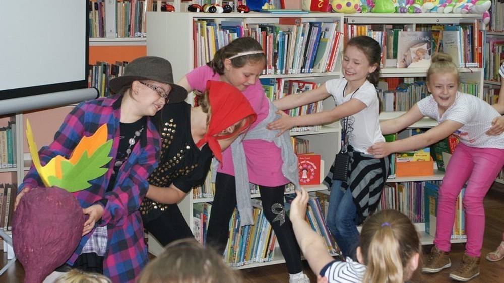 6 czerwca uczennice ze Szkoły Podstawowej nr 9 odwiedziły naszą bibliotekę i zapoznały się z twórczością Juliana Tuwima. Zasadziły rzepkę w ogrodzie, odnalazły okulary Pana Hilarego oraz wyruszyły w podróż lokomotywą. Uczennice wzięły udział w inscenizacji "Spóźnionego słowika", która przerodziła się w wesołą i pełną śmiechu zabawę.