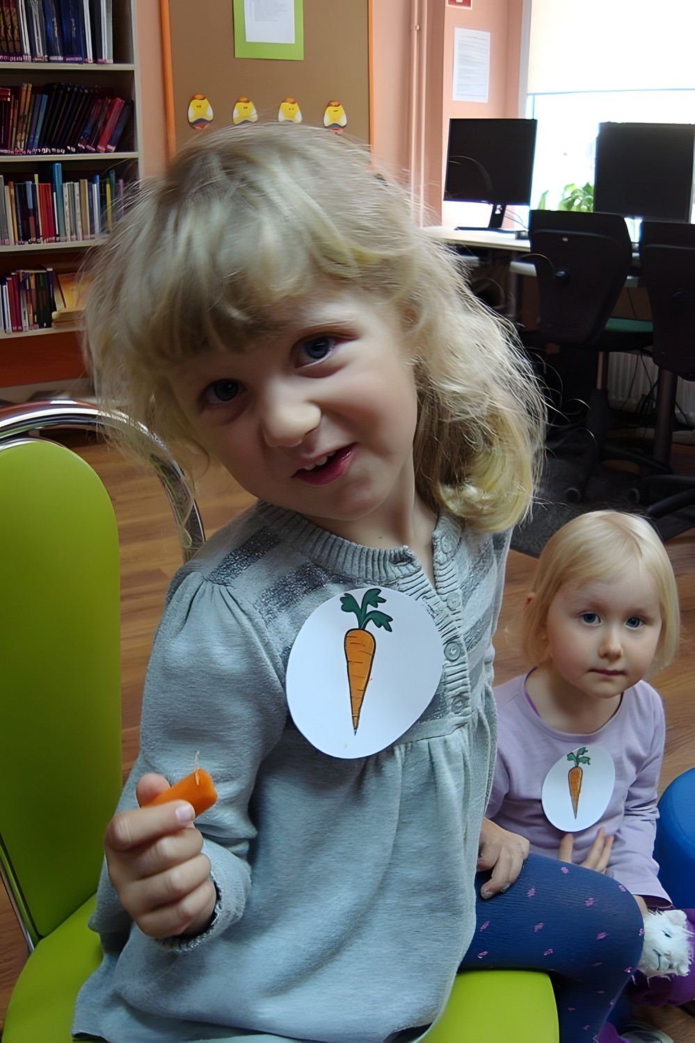 „Warzywa” to kolejny wiersz Tuwima, który "Biedronki" poznały podczas wizyty 13 maja. Tuwimowe warzywa były pretekstem do rozmowy o zdrowym odżywianiu. Dzieci stwierdziły, że marchewkę to najlepiej chrupać w bibliotece i to na surowo.
