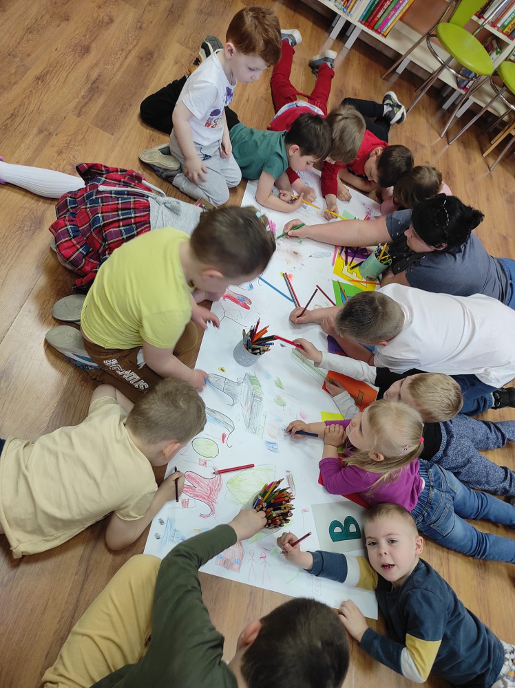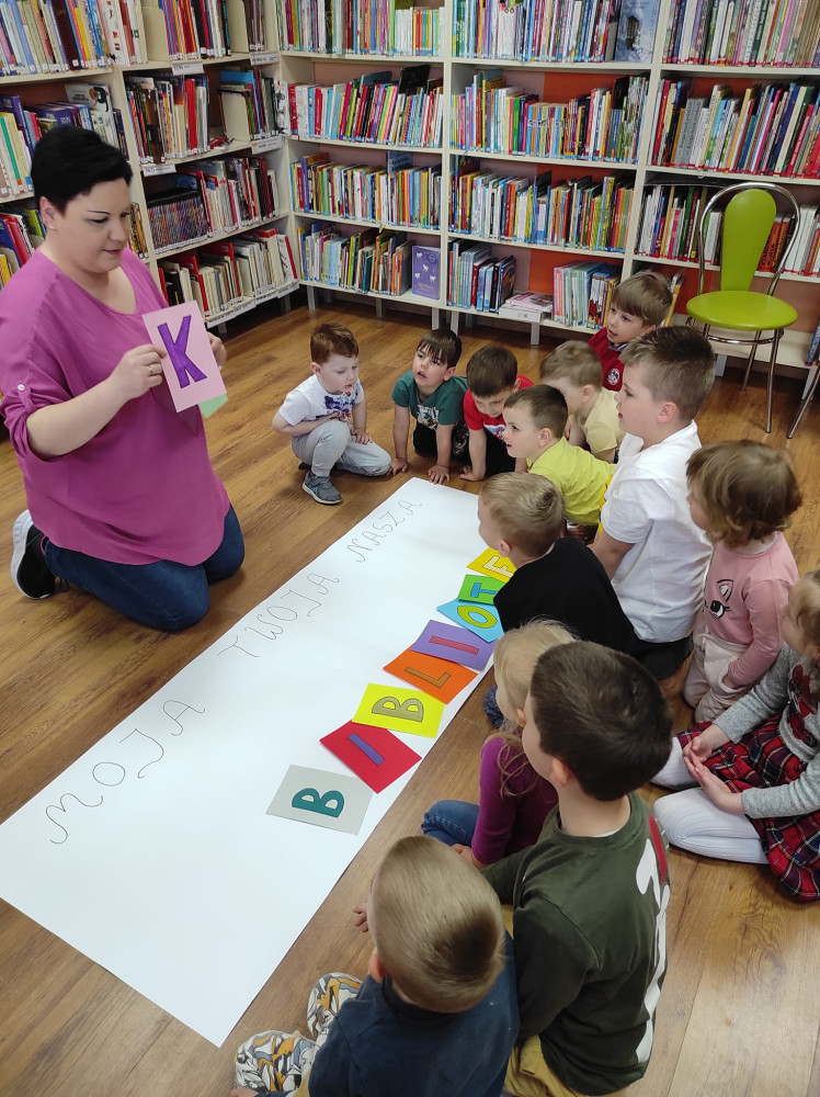 Z tej okazji wspólnie z bibliotekarkami, przedszkolaki wykonały plakat z hasłem Tygodnia Bibliotek "Moja, Twoja, Nasza -BIBLIOTEKA".