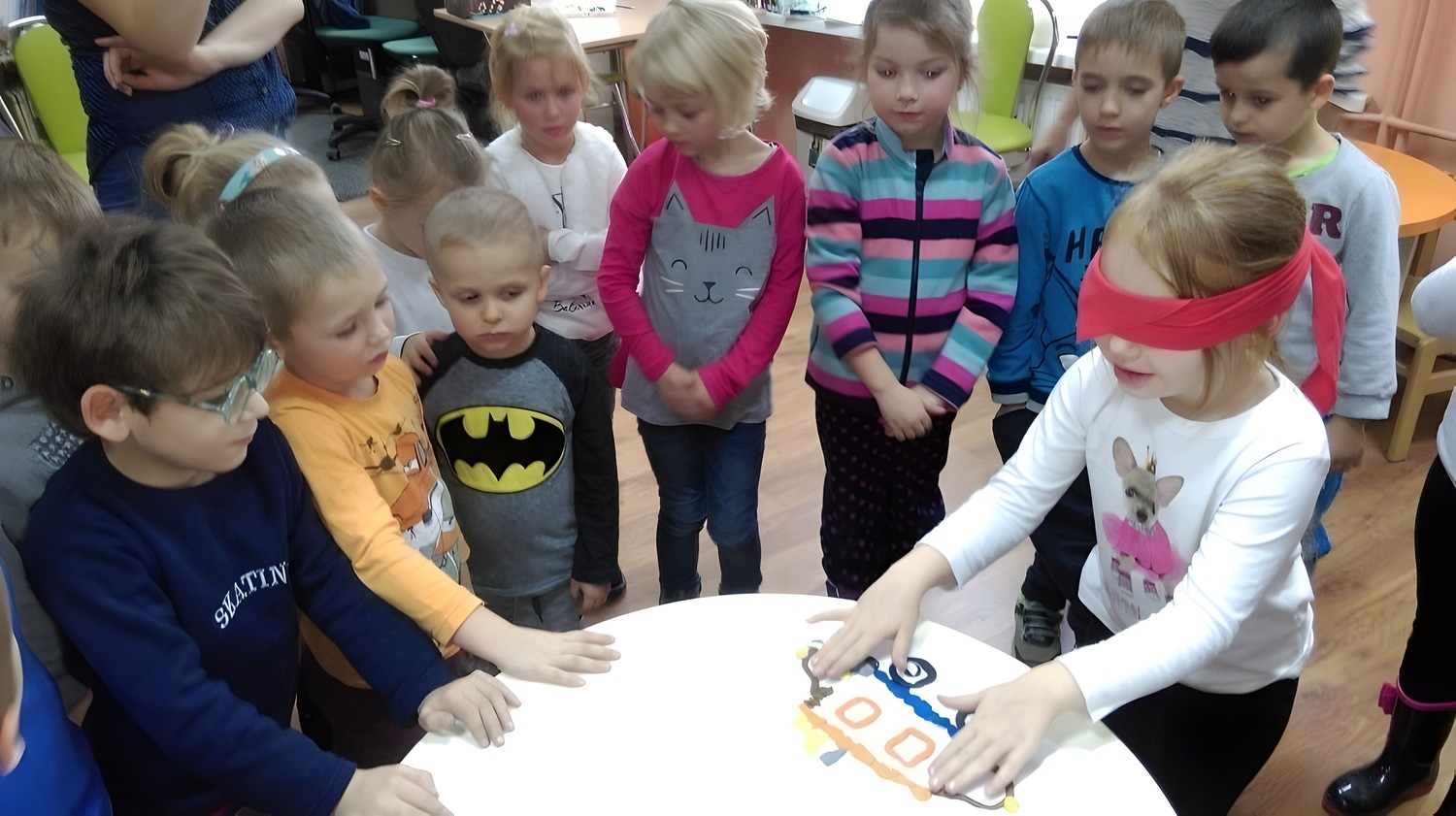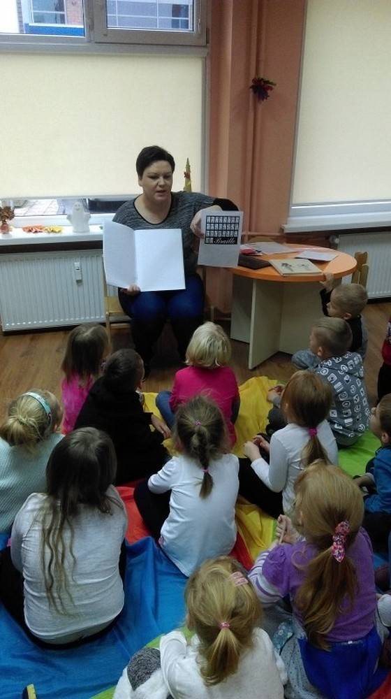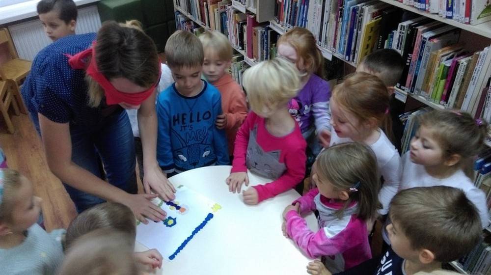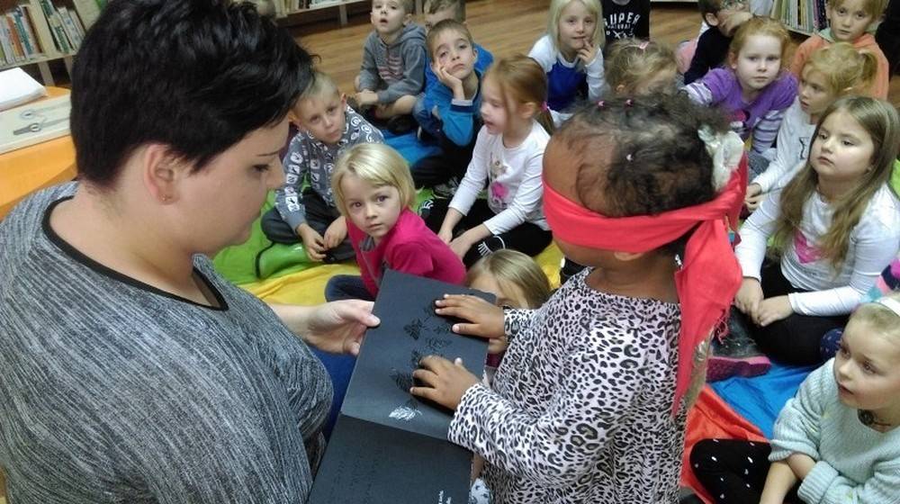 Tygryski z Przedszkola Happy Days, odwiedziły naszą bibliotekę i na spotkaniu zapoznały się z książką Iwony Chmielewskiej „Oczy" i zastanawiały się do czego służą nam oczy? Jak to jest być osobą niewidomą? Poprzez zabawę i zgadywanki dzieci mogły wczuć się w osobę niewidomą i próbowały odgadywać swoje prace plastyczne oraz rysunki z książek przystosowanych dla osób niewidomych.
