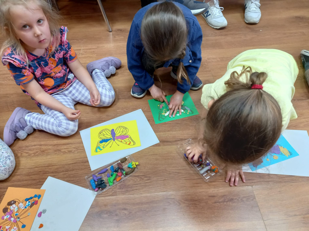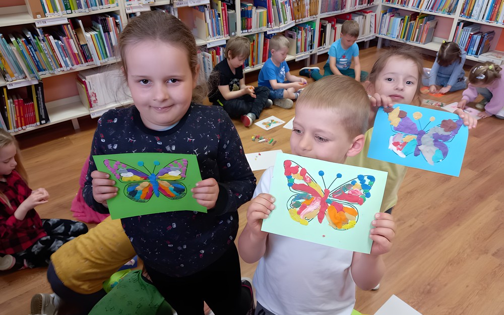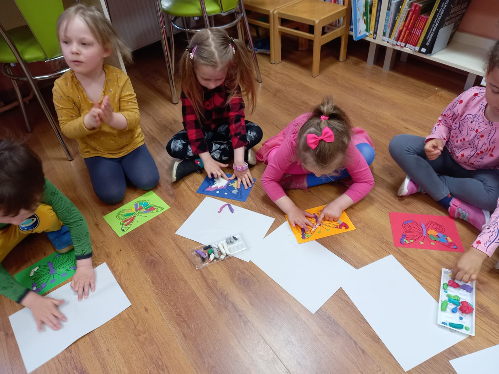 Przedszkolaki z dużą wiedzą o tym jak powstaje motyl, wykonały piękne i kolorowe prace plastyczne z motylem w tle.