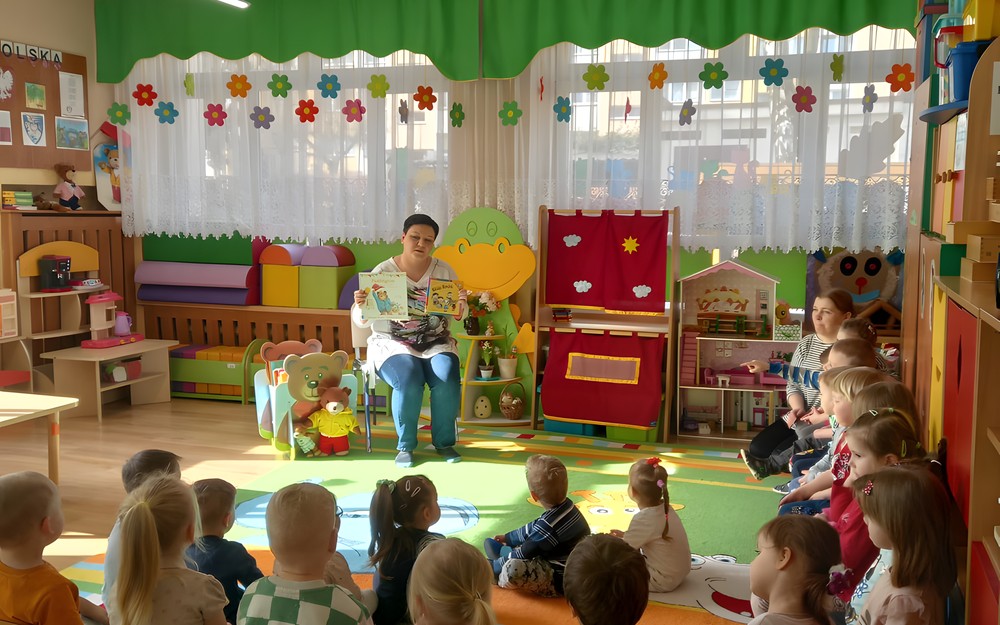 Dzieci wysłuchały opowiadania o "Misiu Paddingtonie i jajkach wielkanocnych" oraz "Kicia Kocia w przedszkolu".