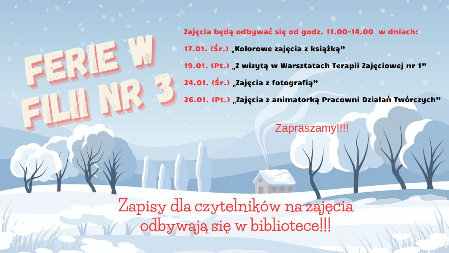 Zapraszamy do zapisów na zajęcia zimowe w bibliotece dzieci w wieku 8-12 lat. Zajęcia będą odbywać się od godz. 11.00-14.00 w dniach: