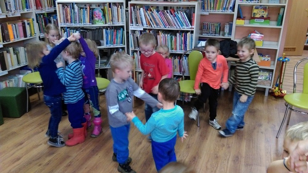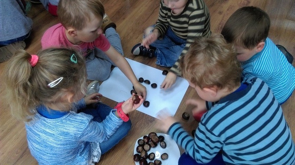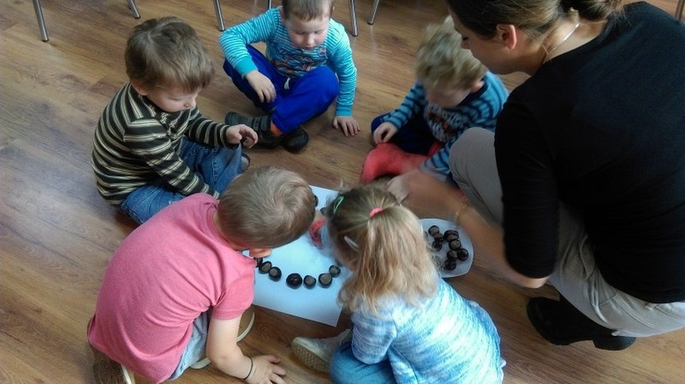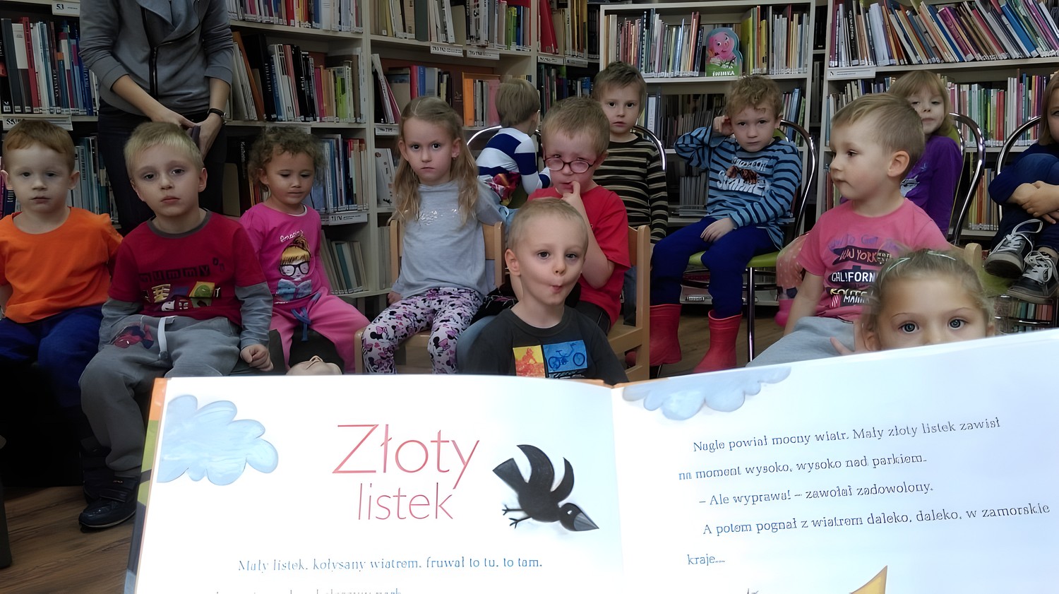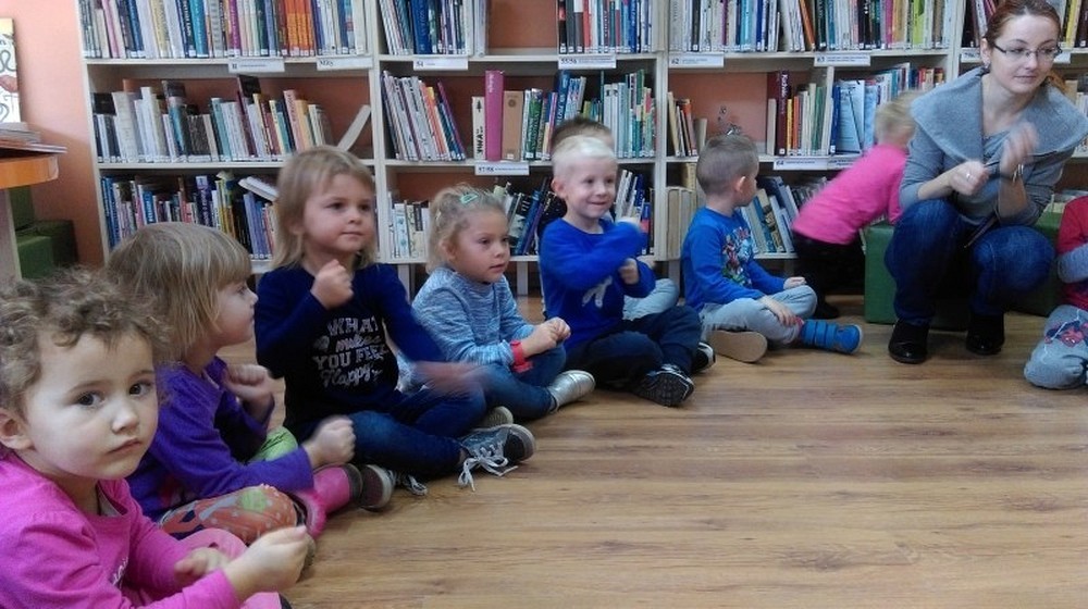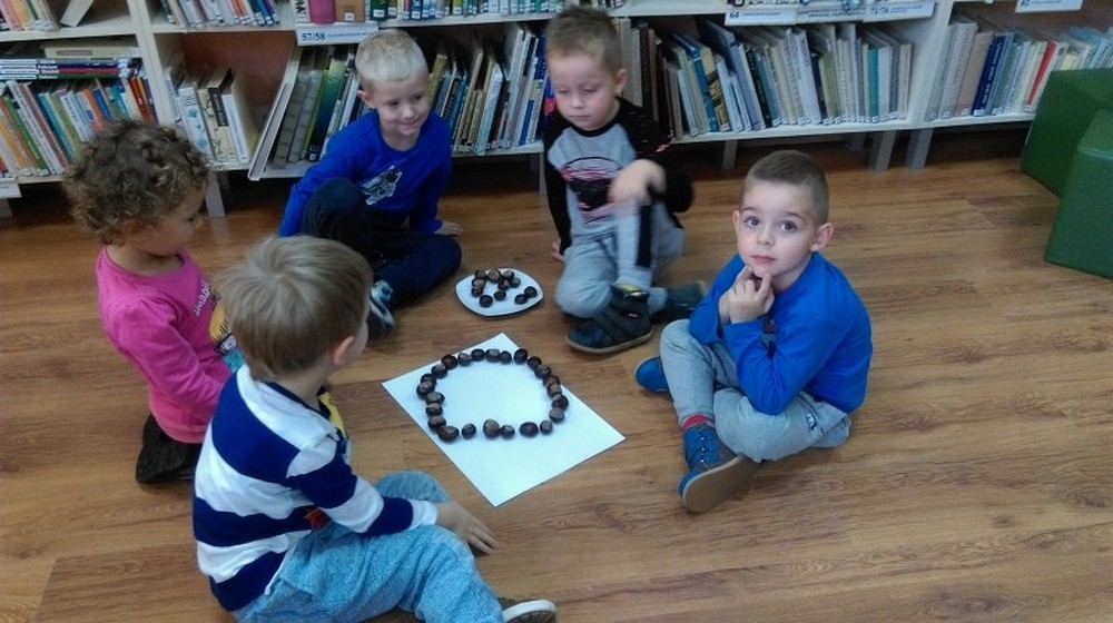 W słoneczny jesienny dzień przybyły do nas czteroletnie „Motylki" z Przedszkola Happy Days. Dzieci wysłuchały opowiadania o „Złotym liściu" Krasnoludka Bajkodłubka i rozmawialiśmy o tym jak zmienia się przyroda, gdy nadchodzi jesienna pora. Nie zabrakło chwili na zabawę w „Kasztanki" oraz „Dyrygenta". Pod koniec spotkania dzieci miały zadanie, aby z darów jesieni ułożyć różne kształty np. słonko, koło czy kwadrat. Dzieci świetnie sobie poradziły z tym zadaniem, a nagrodą był słodki poczęstunek.