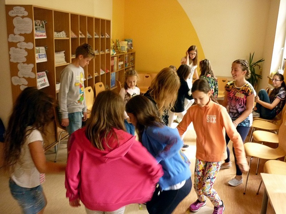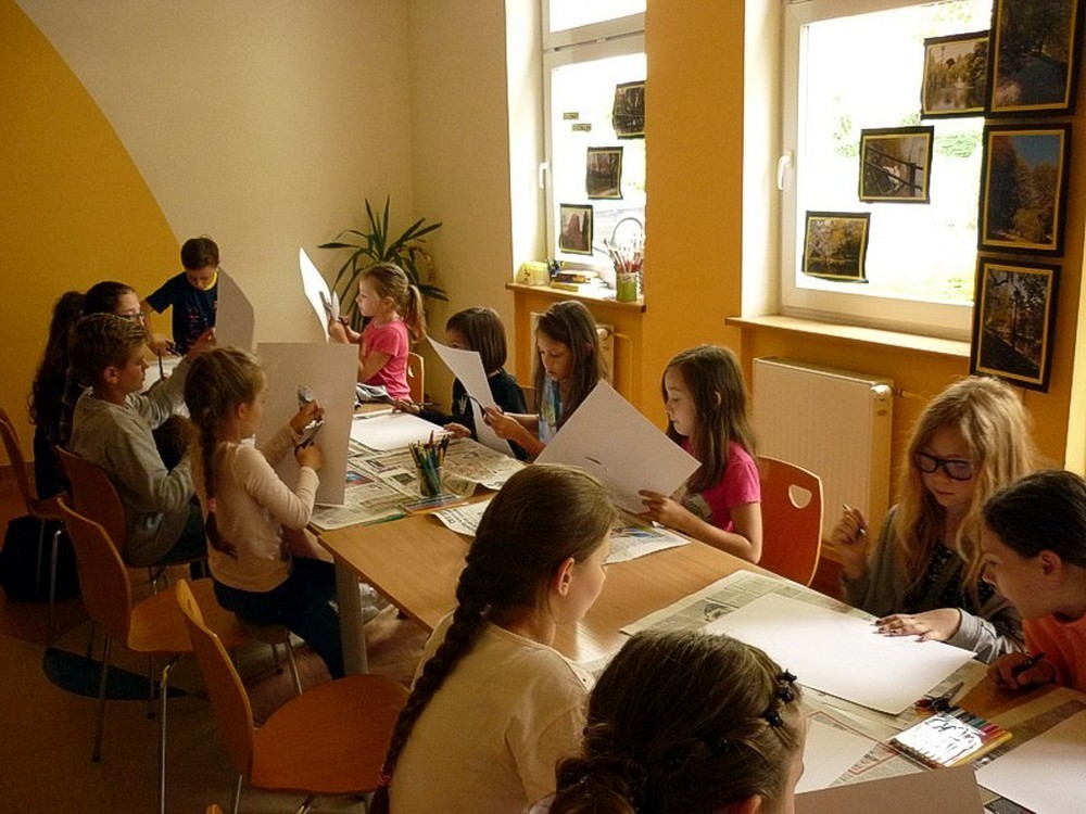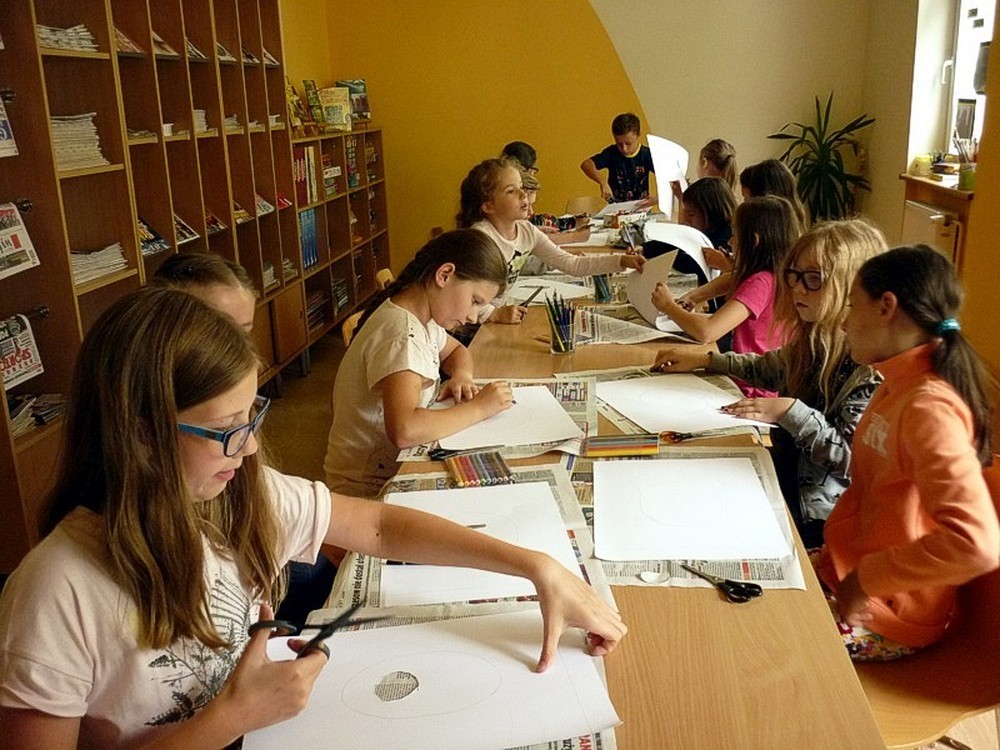Pierwszy dzień WAKACJI W BIBLIOTECE upłynął nam bardzo szybko. Po zaliczeniu obowiązkowego szkolenia z ABC BIBLIOTEKOMANIAKA, bawiliśmy się wesoło. Repertuar zabaw integracyjnych był ciekawy i różnorodny. Następnie w skupieniu wysłuchaliśmy aż dwóch rozdziałów bestsellera BIBLIOTEKA PANA LEMONCELLA (Ch. Grabenstein) i popracowaliśmy kreatywnie. Każdy stworzył oryginalną kartkę z podróży - gigantyczną i dziurawą.