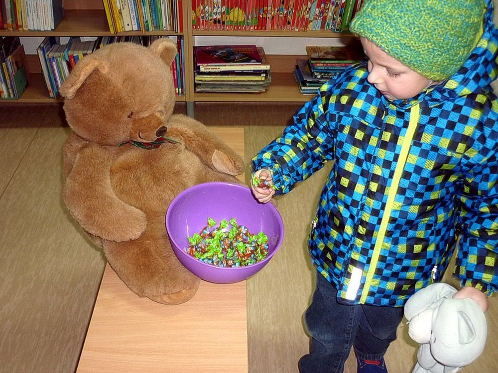 Na pożegnanie Miś Znajdek - jako gospodarz imprezy - poczęstował wszystkich cukierkami.