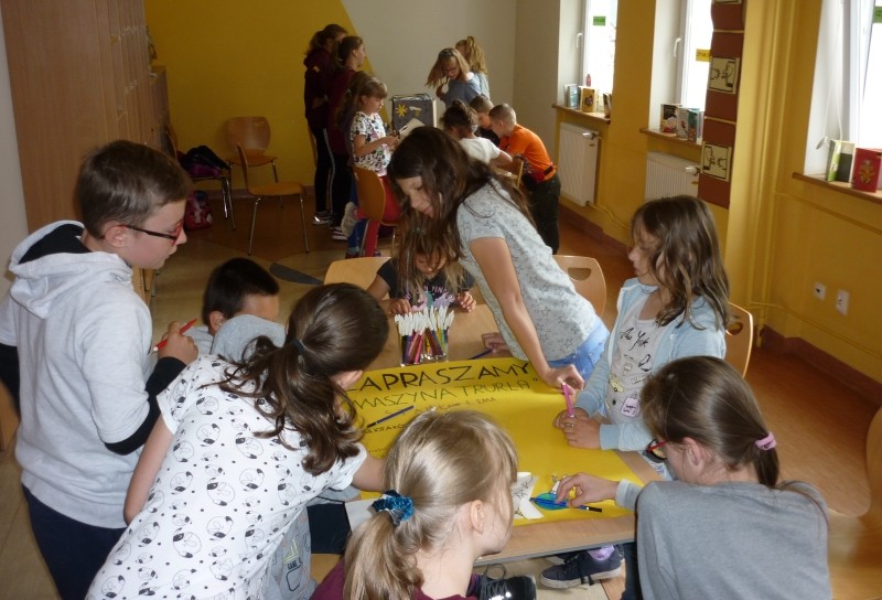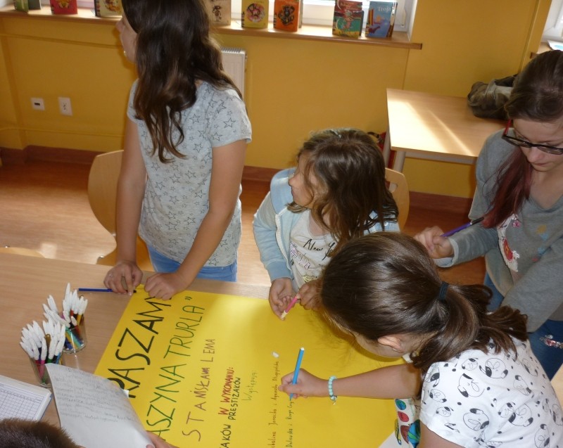 Program warsztatów składał się z gier i zabaw integracyjnych, elementarnych zadań aktorskich, ćwiczeń koordynacyjno-ruchowych i dykcyjnych oraz pracy nad tekstem literackim. Uczestnicy pod kierunkiem Pani Ewy, dokonali adaptacji tekstu prozatorskiego (opowiadanie St. Lema pt. MASZYNA TRURLA) na potrzeby inscenizacji - czego wynikiem był krótki scenariusz etiudy teatralnej.