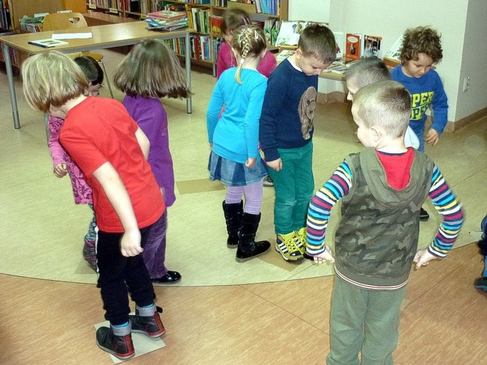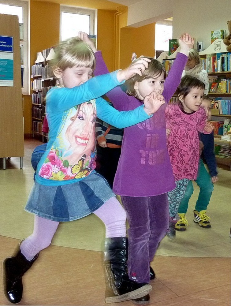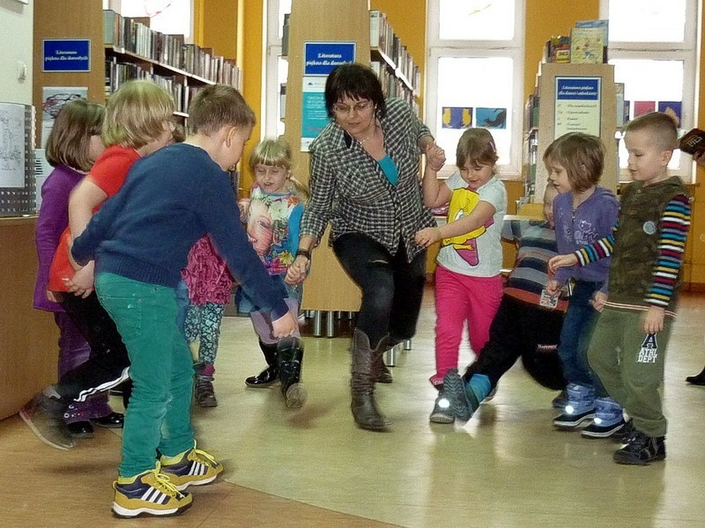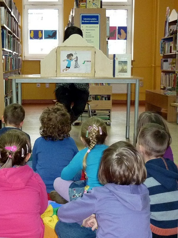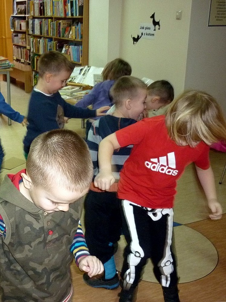 Dzieci przybyły do biblioteki w deszczowy czwartek (3 marca), by wysłuchać naszej adaptacji przygód pluszowej maskotki, w teatrzyku kamishibai. Apetyt na czytanie starałyśmy się rozbudzić również poprzez prezentację literatury dziecięcej, luźno powiązanej z hasłem zajęć. Wisienką na torcie stały się - jak zwykle - dynamiczne zabawy z "brykaniem" w tle, i kolorowanka, będąca ilustracją do książki.
