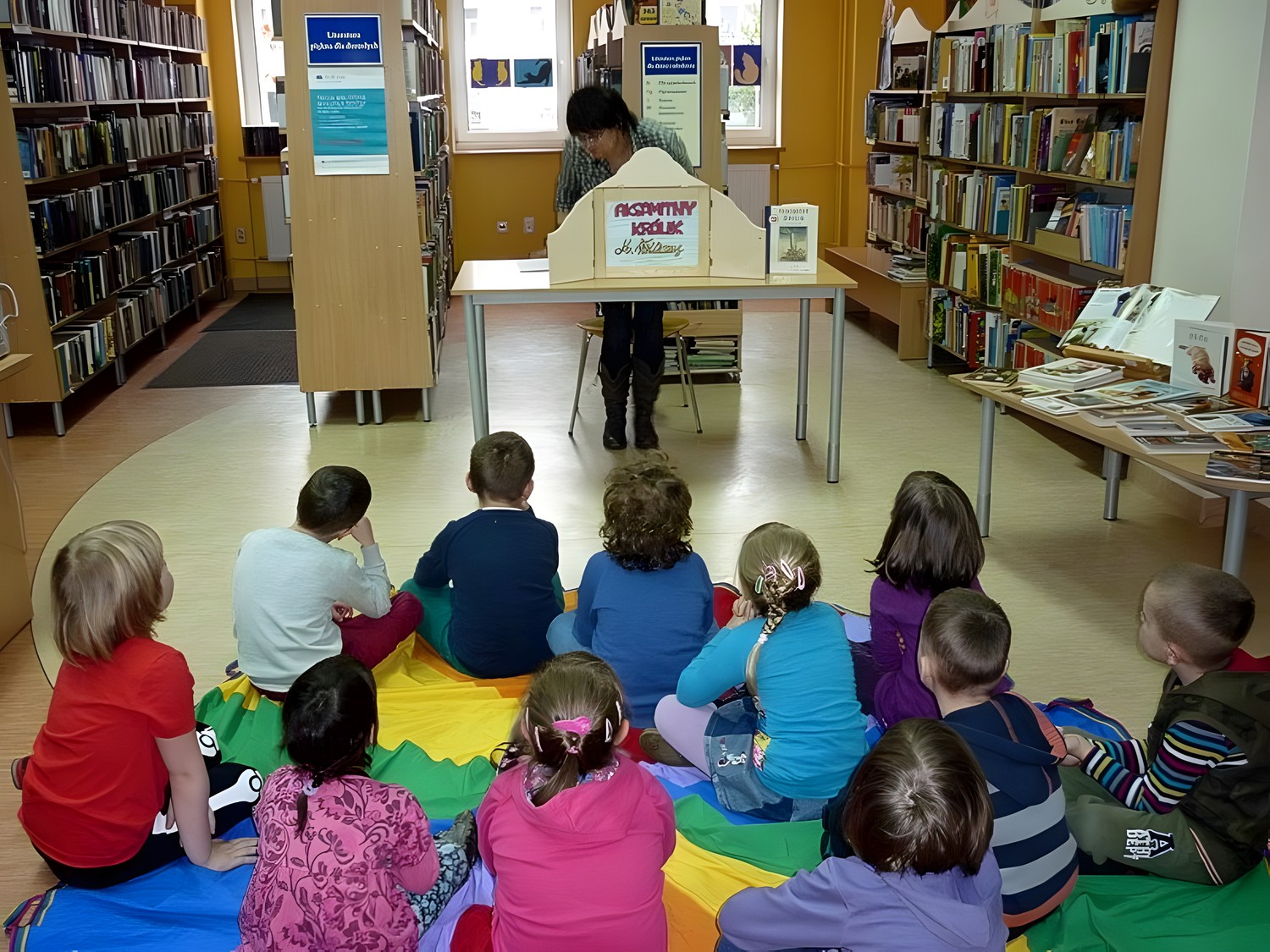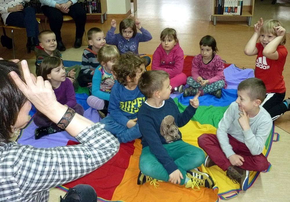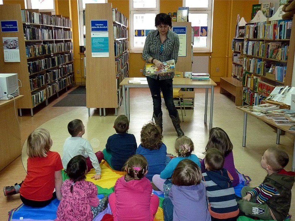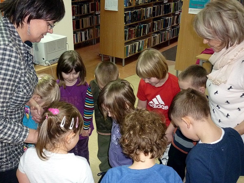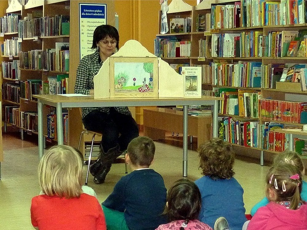 Dzieci przybyły do biblioteki w deszczowy czwartek (3 marca), by wysłuchać naszej adaptacji przygód pluszowej maskotki, w teatrzyku kamishibai. Apetyt na czytanie starałyśmy się rozbudzić również poprzez prezentację literatury dziecięcej, luźno powiązanej z hasłem zajęć. Wisienką na torcie stały się - jak zwykle - dynamiczne zabawy z "brykaniem" w tle, i kolorowanka, będąca ilustracją do książki.
