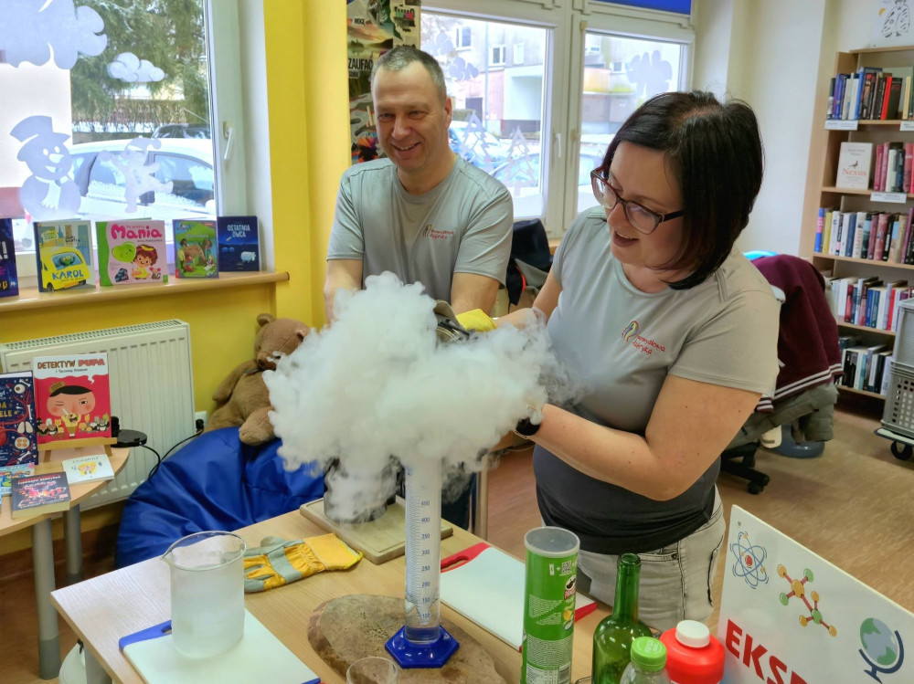 "Czary mary więcej pary!" - tym magicznym zaklęciem zakończyliśmy tegoroczne ferie. Ale zanim to nastąpiło, zaprzyjaźniona od lat Pomysłowa Fabryka zapoznała nas z "zimną fizyką", czyli wszystkim co wiedzą o baaardzo niskich temperaturach. Czym tak właściwie jest ciekły azot (zwany przez niektórych "wściekłym"), czy bananem można wbić gwoździa i ile napompowanych balonów zmieści się do kapelusza? Jeśli jakość zajęć feryjnych mamy oceniać nie po tym jak zaczynamy, a jak kończymy - to na myśl przychodzi tylko jedno słowo: WIDOWISKOWO!