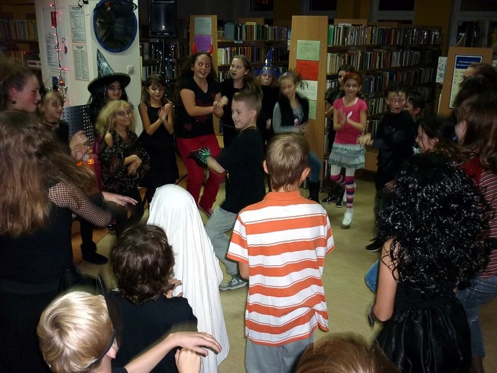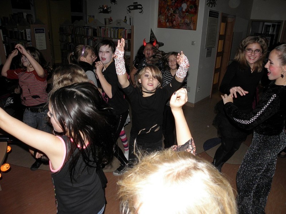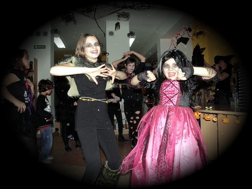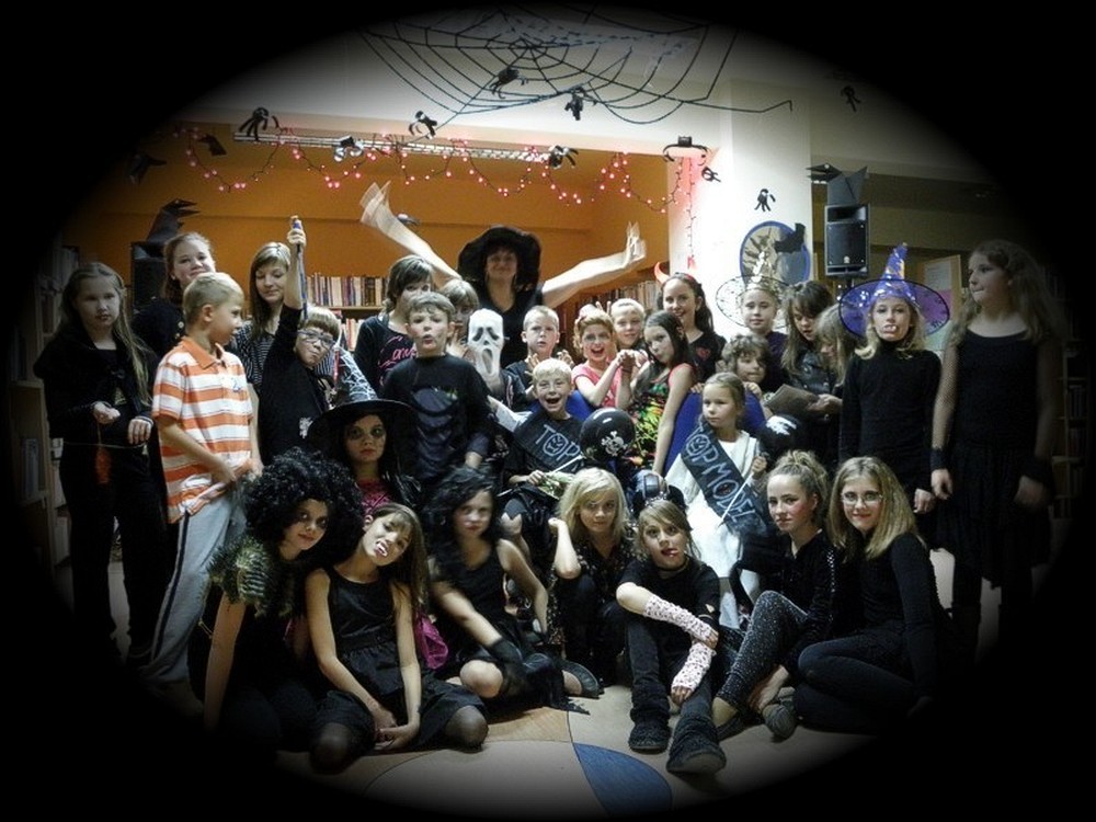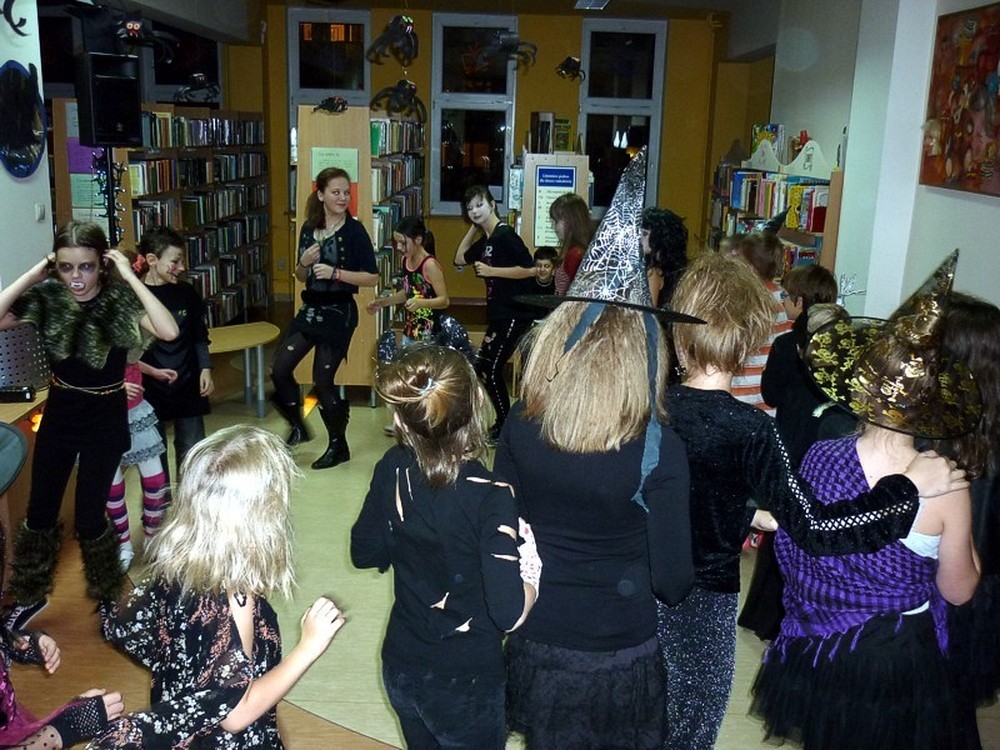 Po zmroku, z pobliskich domostw zaczęły ciągnąć do biblioteki różnej maści potwory. Przybyły, aby w blasku księżyca (i telewizyjnych fleszy) bawić się w rytm upiornej muzyki, którą ze swojej piekielnej konsoli "zapodała" czarownica Wioletycja. Zahipnotyzowane muzyką mroczne postaci, bez oporów podążały "Upiorną Aleją" wprost w objęcia szalonego rock'and'rolla. Rozedrgany tłum trudno było uspokoić, na szczęście pojawiły się mumie i powiodły barwny orszak na pokaz mody "Nie z tego świata". Tam obserwowane przez ogromne kruki, chętnie prezentowały swoje koszmarne atrybuty, byśmy mogli wyłonić z ich grona Top Modeli 2012 roku. Zmęczone, ale szczęśliwe - odpoczywały w blasku przerażających halloweenowych dyń i posilały się w "Barze Pod Upiorkiem". Impreza powoli zbliżała się do końca, a nasi goście niechętnie myśleli o powrocie do swoich zimnych, ciemnych i zatęchłych domostw... bo przecież tak trudno się rozstać...