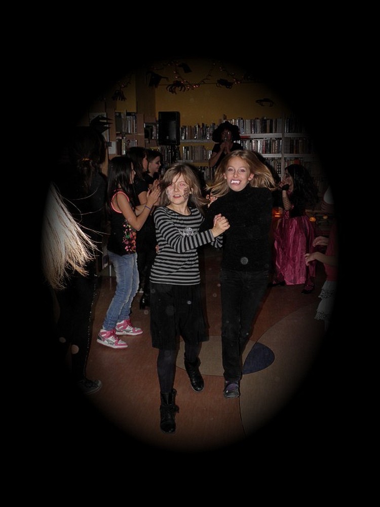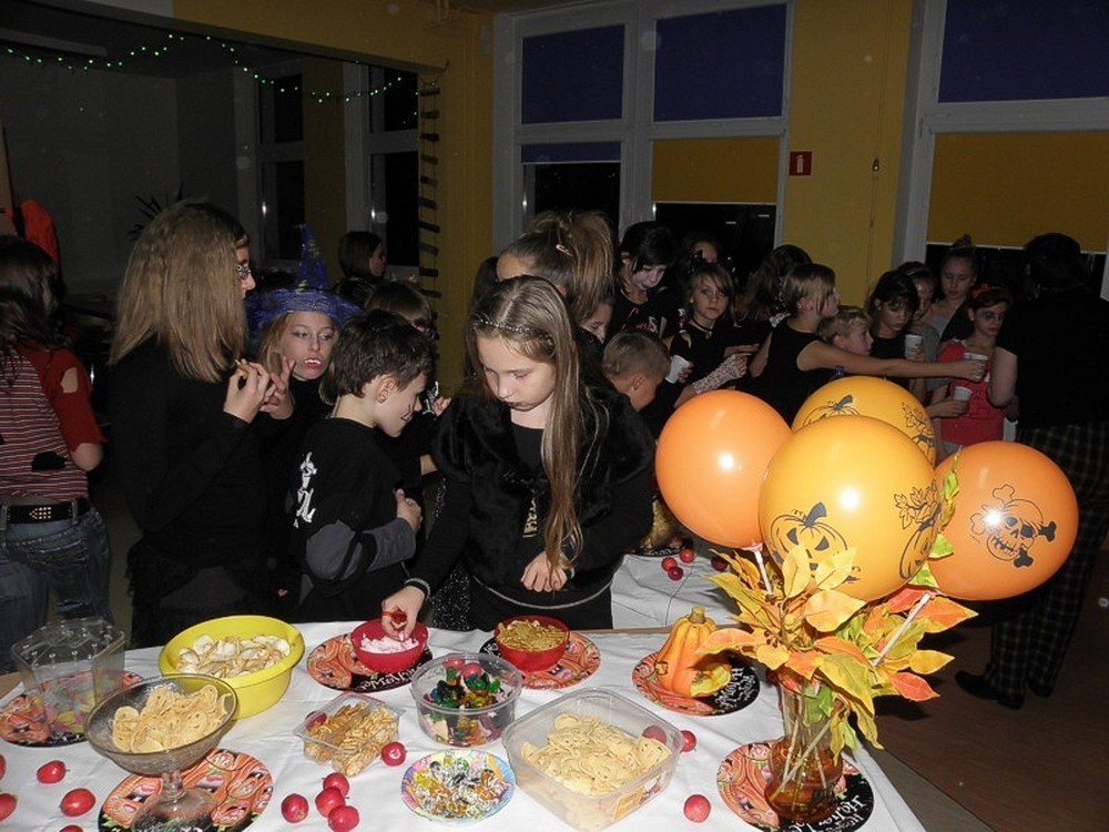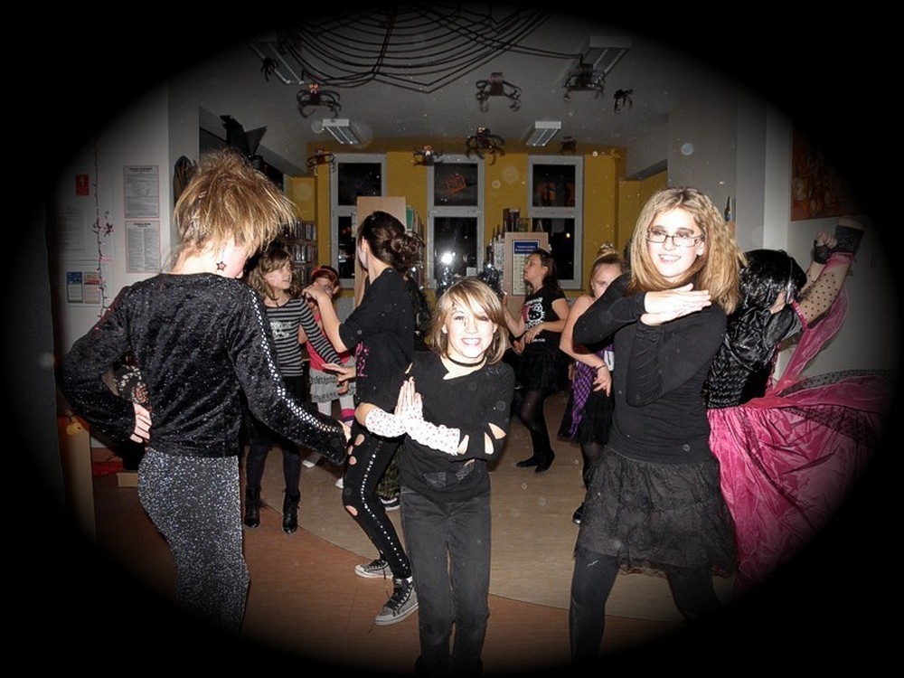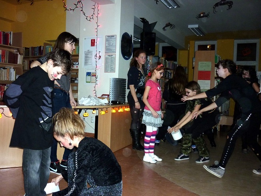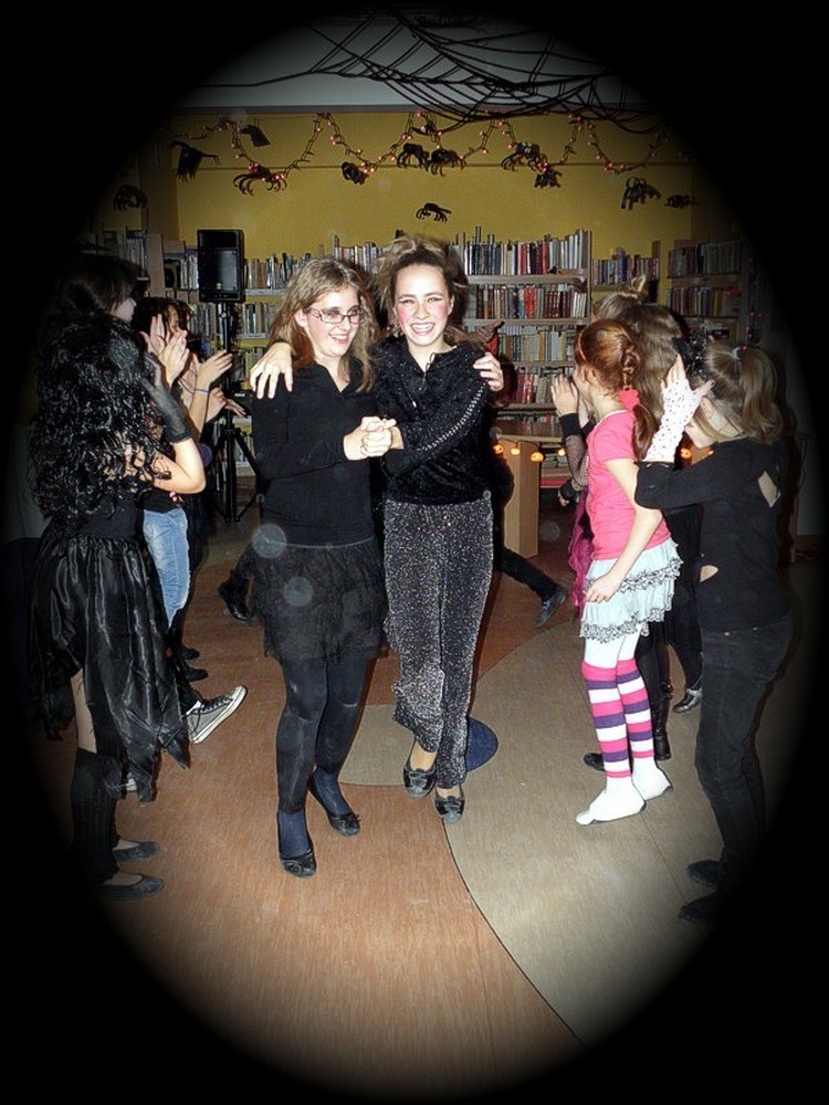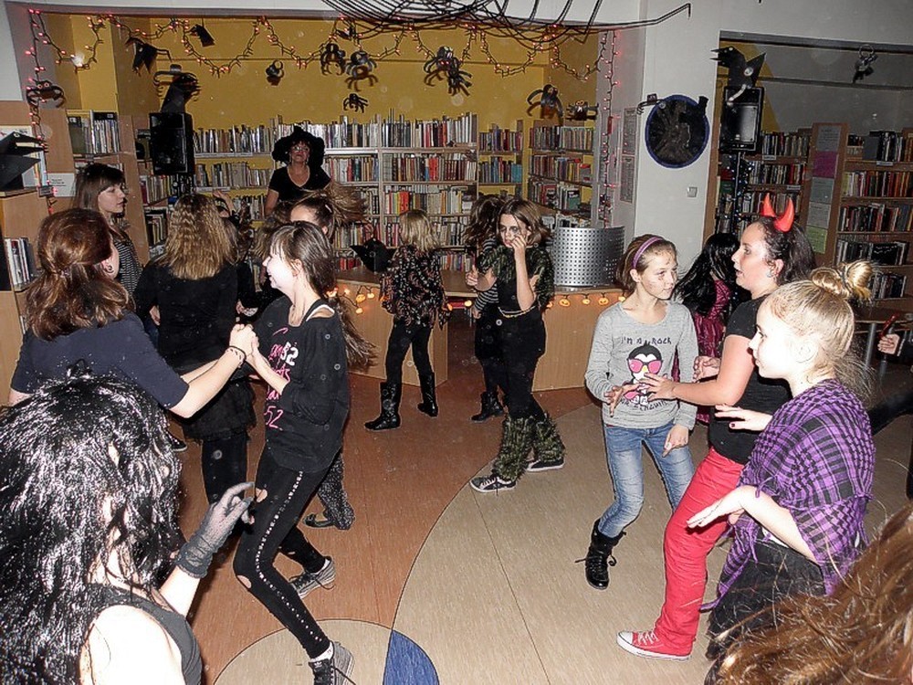 Po zmroku, z pobliskich domostw zaczęły ciągnąć do biblioteki różnej maści potwory. Przybyły, aby w blasku księżyca (i telewizyjnych fleszy) bawić się w rytm upiornej muzyki, którą ze swojej piekielnej konsoli "zapodała" czarownica Wioletycja. Zahipnotyzowane muzyką mroczne postaci, bez oporów podążały "Upiorną Aleją" wprost w objęcia szalonego rock'and'rolla. Rozedrgany tłum trudno było uspokoić, na szczęście pojawiły się mumie i powiodły barwny orszak na pokaz mody "Nie z tego świata". Tam obserwowane przez ogromne kruki, chętnie prezentowały swoje koszmarne atrybuty, byśmy mogli wyłonić z ich grona Top Modeli 2012 roku. Zmęczone, ale szczęśliwe - odpoczywały w blasku przerażających halloweenowych dyń i posilały się w "Barze Pod Upiorkiem". Impreza powoli zbliżała się do końca, a nasi goście niechętnie myśleli o powrocie do swoich zimnych, ciemnych i zatęchłych domostw... bo przecież tak trudno się rozstać...