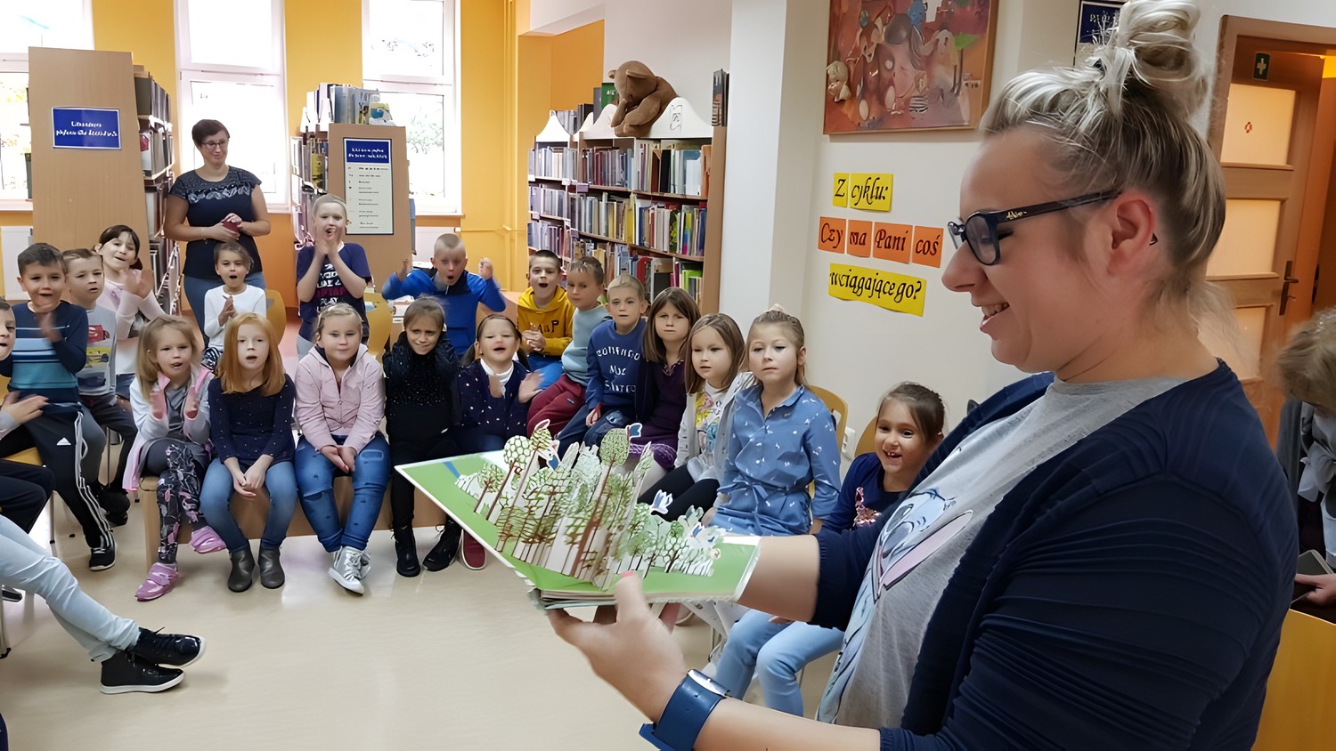 W środę - 9 października - gościłyśmy liczną grupę 7-latków ze świetlicy przy SP nr 18 w Koszalinie. Była to pierwsza wizyta dzieci w naszej bibliotece. Spotkanie rozpoczęliśmy od prezentacji najpiękniejszych książek - takich, które intrygują, bawią oraz inspirują. Prowadzące spotkanie - Wiola i Małgosia - z pełnym zaangażowaniem, wczuwając się w emocje postaci, przeczytały aż trzy historyjki (na wyraźne życzenie słuchaczy), z których KSIĄŻKA BEZ OBRAZKÓW (B.J. Novaka) okazała się prawdziwym hitem!