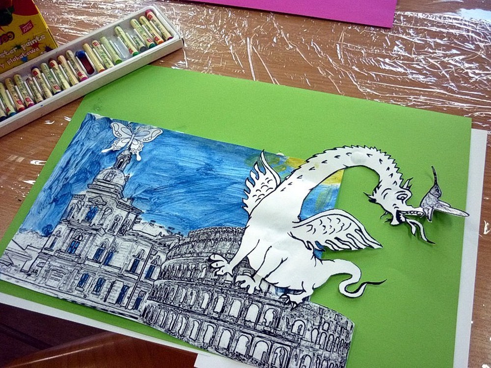 Na początek Pani Wiola opowiedziała nam historię Koszalina "ilustrowaną" pokazem multimedialnym, a następnie Panie Ewa i Maryla - podczas zajęć plastycznych - pomogły molikom zmienić najbardziej znane zakątki Koszalina w "raj".