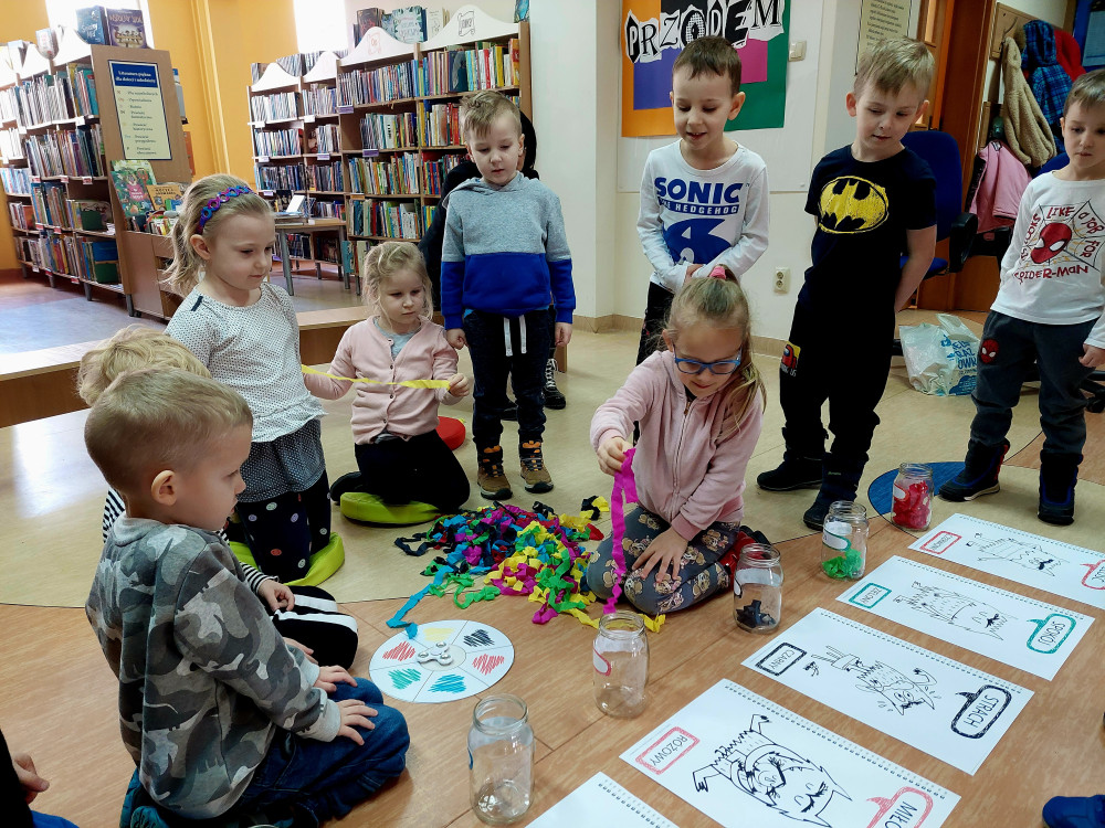 KOLOROWY POTWÓR zwabił do biblioteki aż trzy grupy przedszkolaków: Motylki z Przedszkola 35, Anglozuchy z Przedszkola 37 oraz Sportowców z Przedszkola 15. Sześciolatki i pięciolatki uczestniczące w zajęciach z KOLOROWYM POTWOREM, nauczyły się rozpoznawać, a także nazywać uczucia. Wszystkie splątane emocje zostały bezbłędnie uporządkowane w odpowiednich słoiczkach! Przedszkolaki zdradziły nam własne sposoby radzenia sobie z trudnymi uczuciami. To było dla nas wszystkich fascynujące i pouczające doświadczenie...