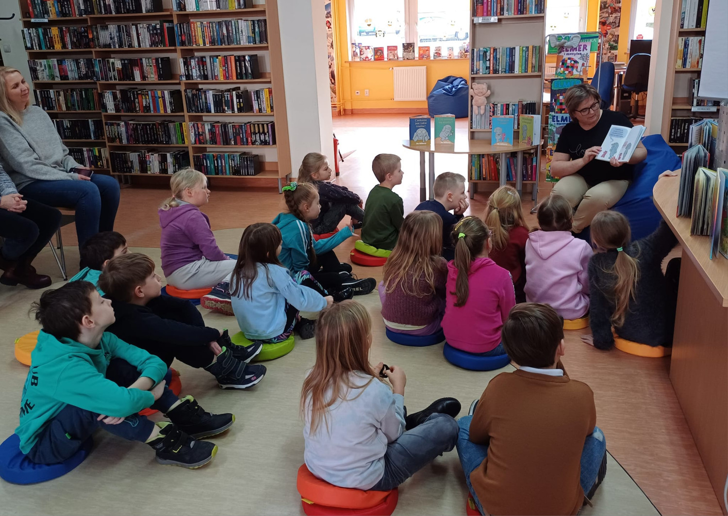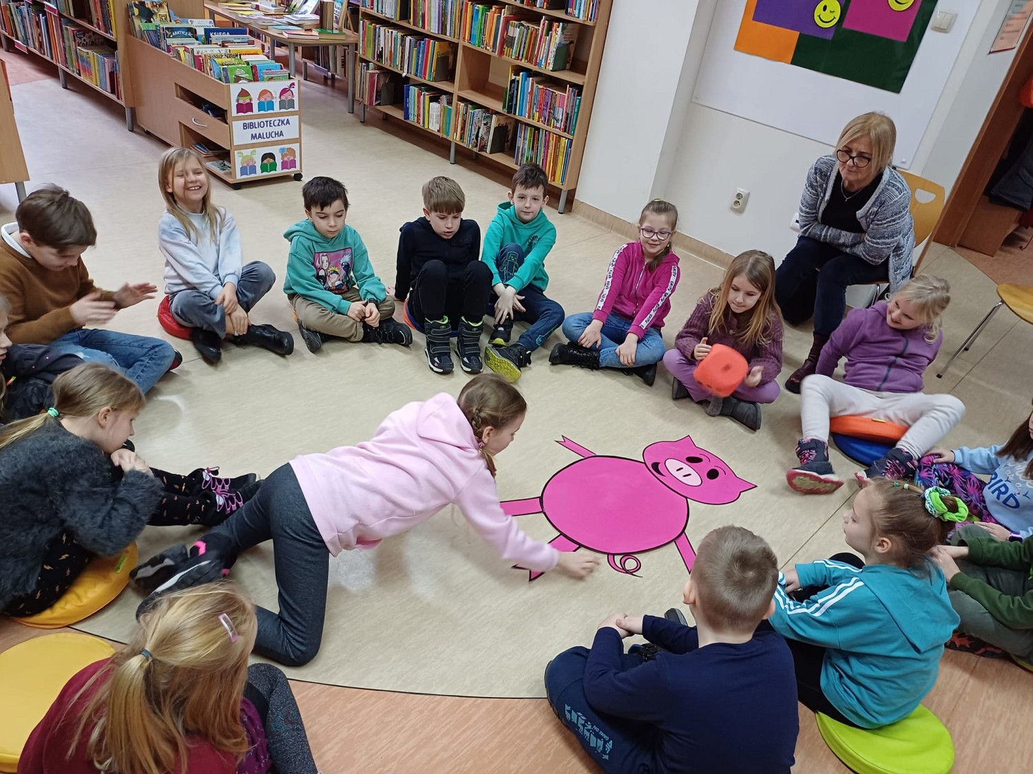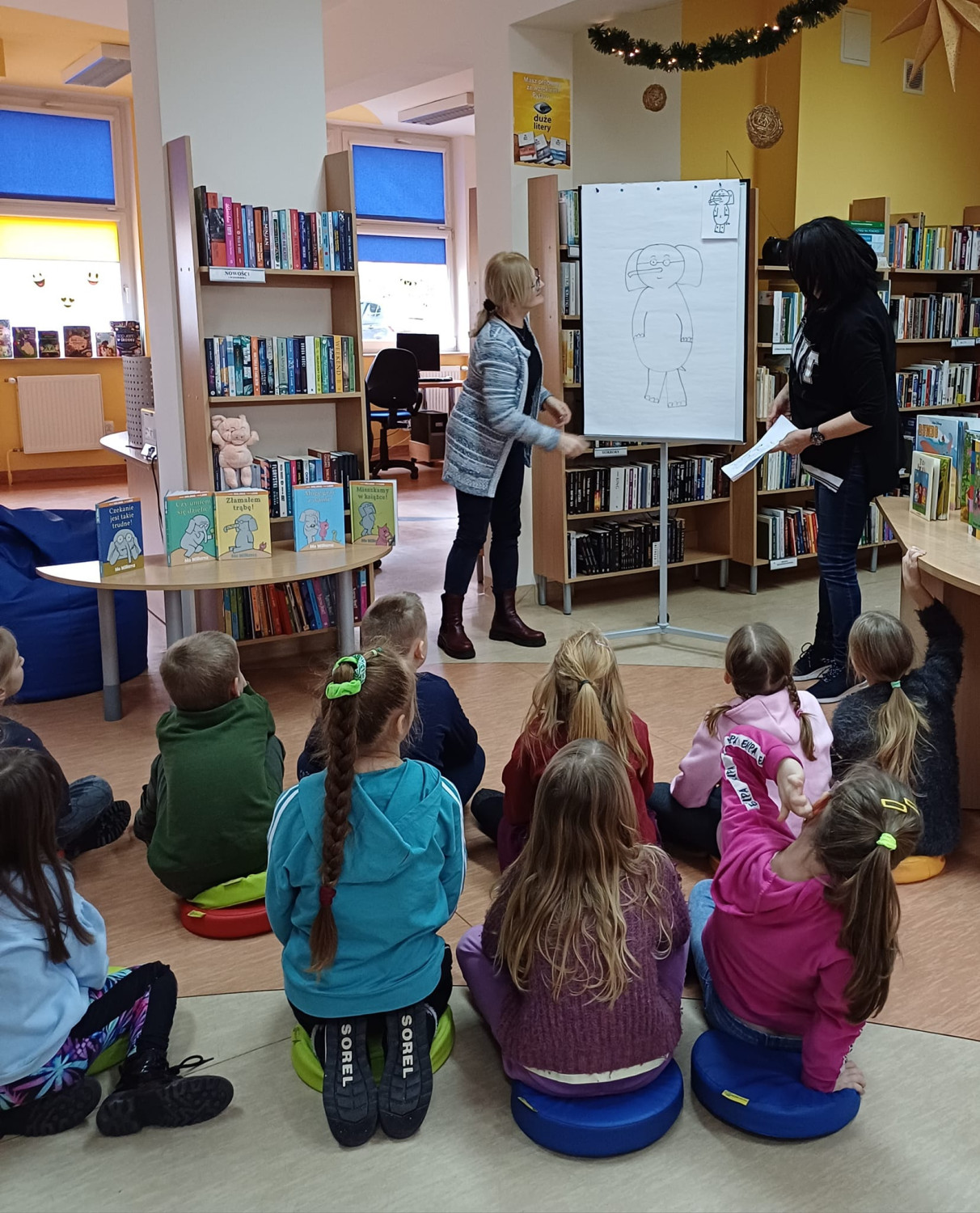 Spotkania ze Słoniem Leonem i Świnką Malinką w naszej bibliotece zawsze przeradzają się w maraton głośnego czytania oraz śmiechoterapię Naszym gościom ze świetlicy SP nr 18 w Koszalinie zabawna para przyjaciół, mieszkająca w książkach Mo Willemsa "zrobiła dzień" Oprócz głośnego czytania - które zajęło połowę czasu przeznaczonego na spotkanie - dzieci rozwiązały quiz, którego efektem był przecudowny portret Słonia Leona , ułożyły z elementów przesłodką postać Malinki oraz nauczyły świnkę cyrkowych akrobacji