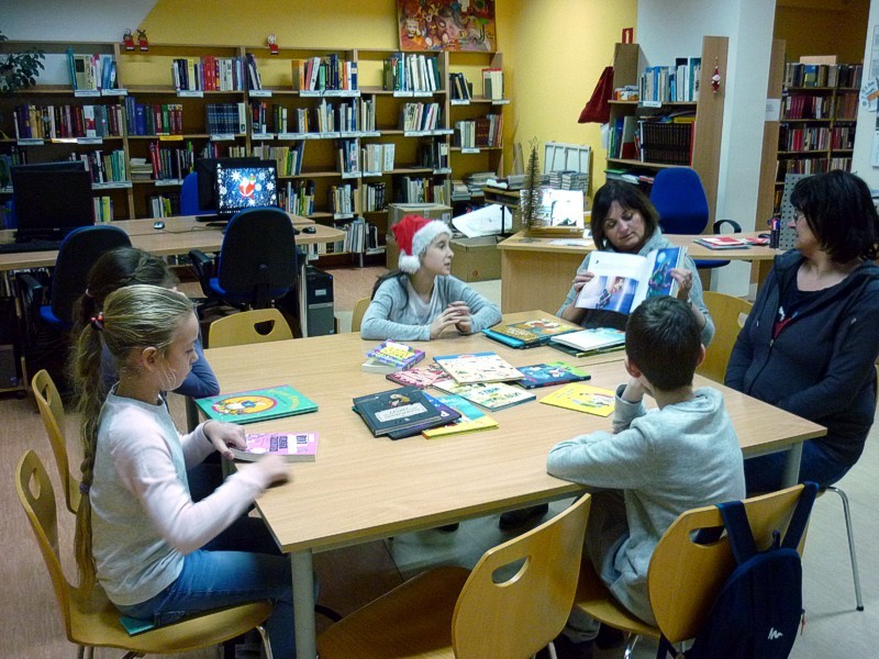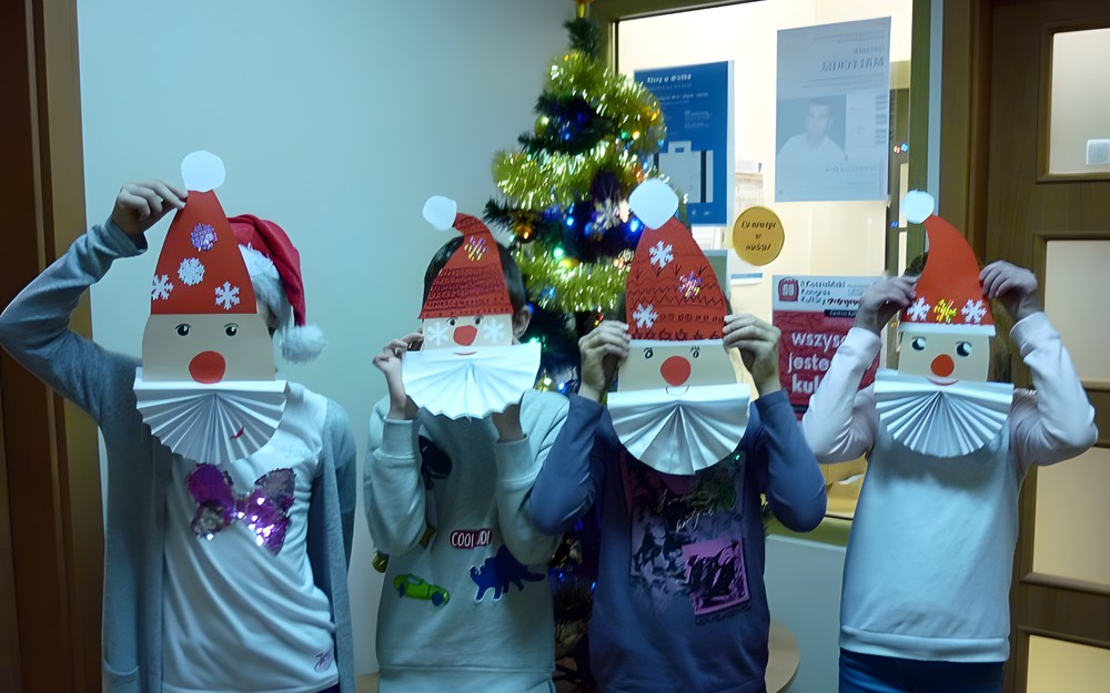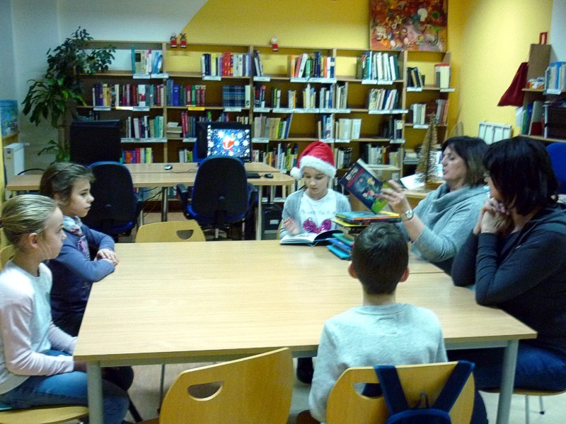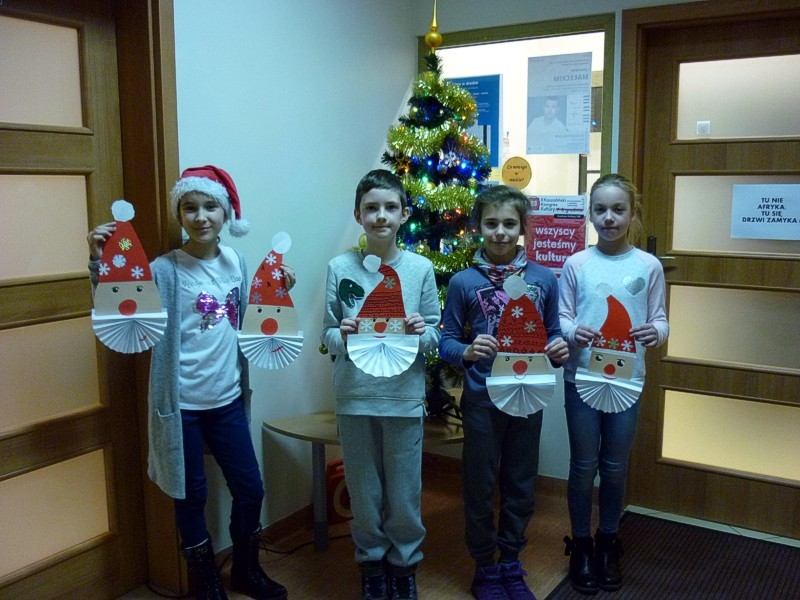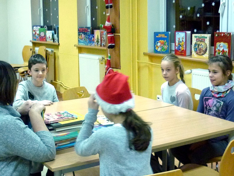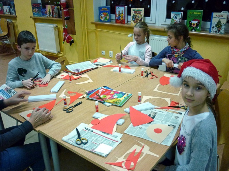 Na początek - przegląd nowości bibliotecznych wraz z zaklepywaniem wypożyczeń, a następnie głośne czytanie fragmentów GWIAZDKI NA ULICY SEZAMKOWEJ. Dla rozluźnienia, przeprowadziłyśmy TEST NA MIKOŁAJA, który wszyscy przeszli rewelacyjnie - na szczęście prowadzące nie musiały przeciskać się przez komin! Zajęcia plastyczne zapewniły nam chwilę wytchnienia, a jednocześnie dekorację domowych okien - papierowe Mikołaje wyszły pięknie!