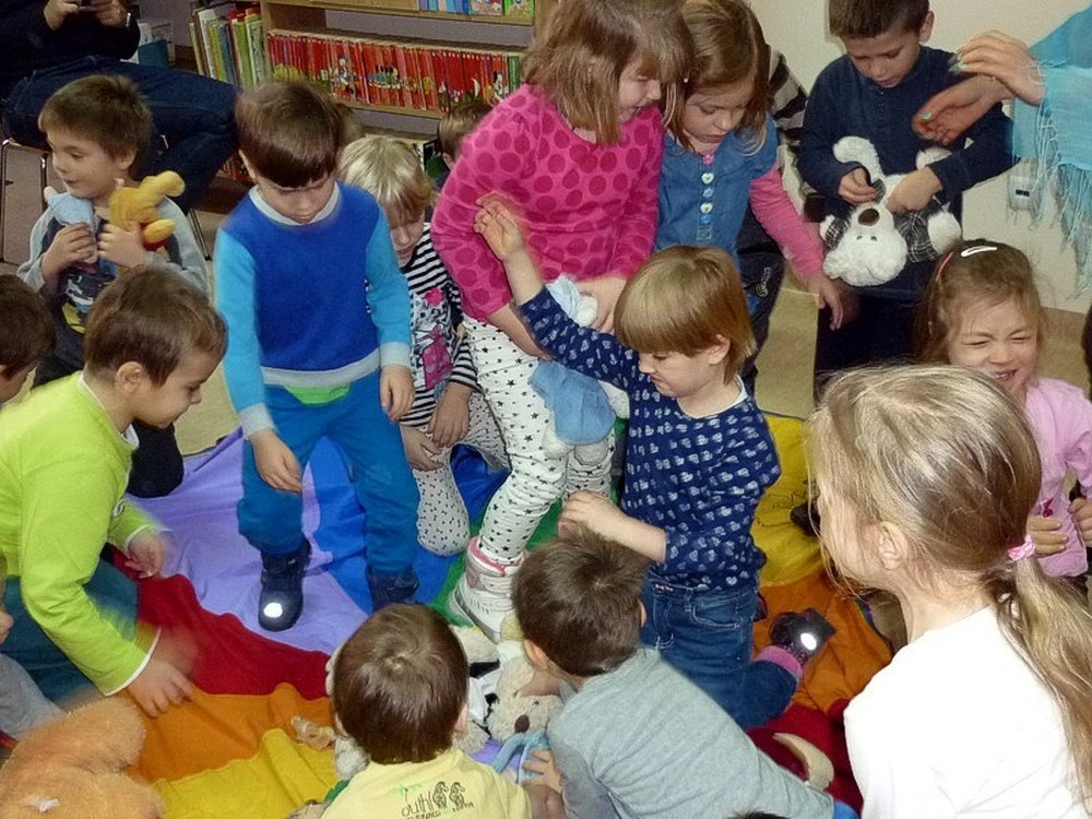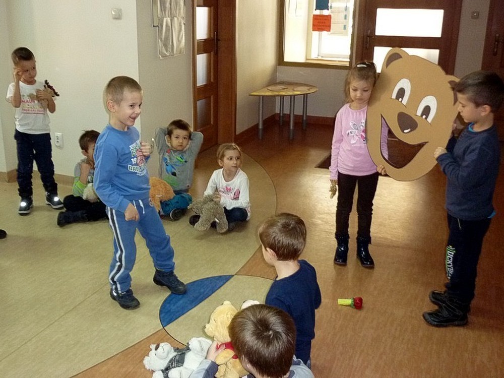 Muzyka, taniec i zabawy z chustą Klanzy, wyzwoliły w pięciolatkach ogromne pokłady energii. Ich dorośli opiekunowie też się z nami dobrze bawili, próbując karmić misia cebulką dymką! Ta śmieszna konkurencja od razu stała się hitem hitów.