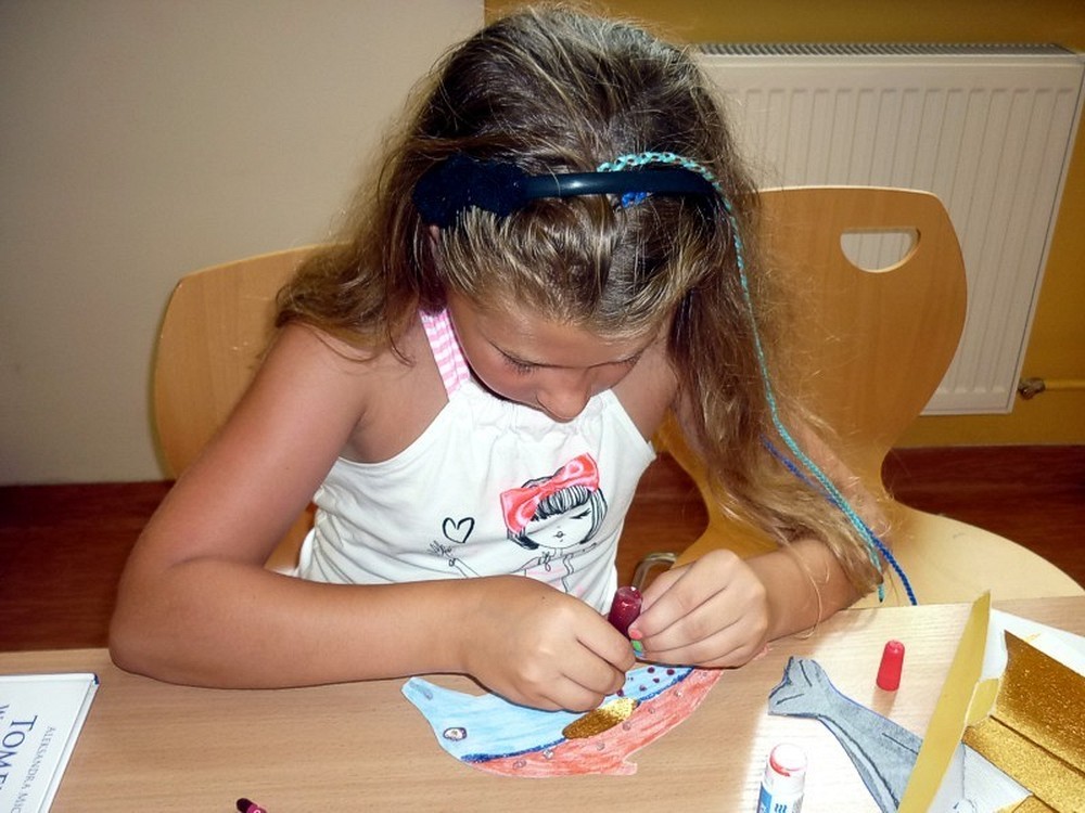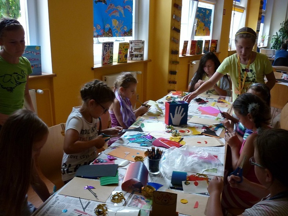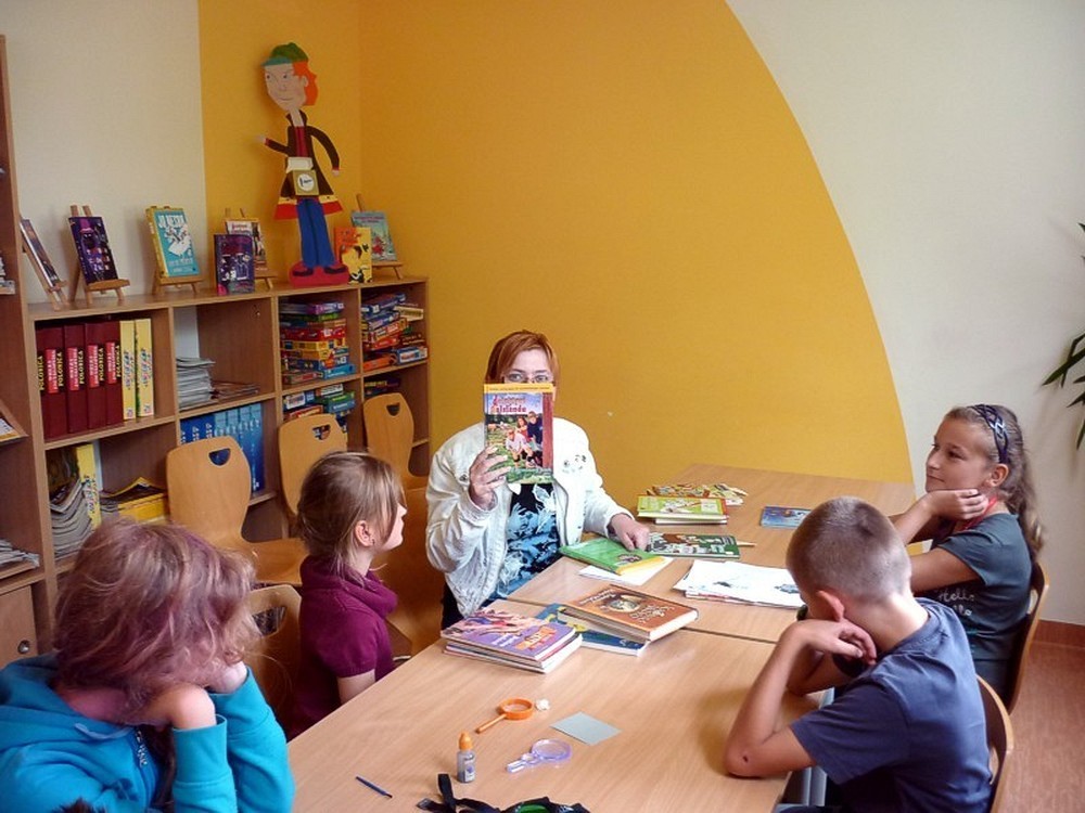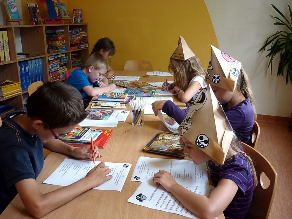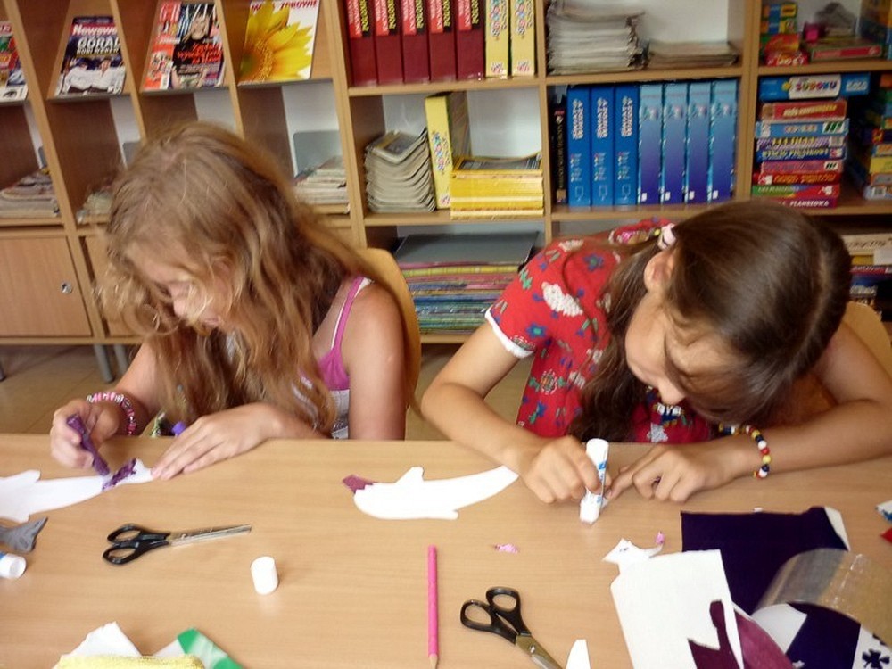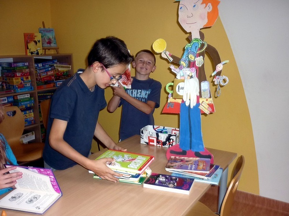 W każdy wtorek sierpnia, w czytelni naszej biblioteki, spotykały się MOLIKI KSIĄŻKOWE. Nasze spotkania zawsze są inspirowane książkami i tak też było w te wakacje. Pierwsze spotkanie - 6 sierpnia - rozpoczęliśmy od przygód z delfinami. Ciekawostki, zagadki, czytanie fragmentów książek, rozbudziły dziecięcą ciekawość. Na koniec zajęć - prowadzonych przez Panią Martę - moliki wykonały wspólną pracę plastyczną ph. OCEAN RADOŚCI. Drugie spotkanie molików (13 sierpnia) odbyło się pod czujnym okiem DETEKTYWA TWAROŻKA i... Pani Marty. Kilka zabaw integracyjno-kryminalnych, czytanie i promocja książek detektywistycznych zainspirowały moliki do wyposażenia "naszego" detektywa w niezbędne rekwizyty. Na trzecim spotkaniu (20 sierpnia), pod przewodnictwem "piratki Maryli", moliki przeobraziły się w piratów wykonując oryginalne czapki. Czytanie opowiadań o piratach i przegląd dostępnych książek o rozbójnikach morskich, pomogły molikom rozwiązać "Piracki quiz". Na zakończenie zajęć powstała wspólna praca plastyczna ph. WYSPA SZALONYCH PIRATÓW. W ostatni wtorek wakacji (27 sierpnia) zajęcia odbywały się pod hasłem W CO SIĘ BAWIĆ. Większość prezentowanych pozycji stanowiła literatura popularnonaukowa. Z pomysłów zabaw w domu i na podwórku, skorzystała połowa uczestników, wypożyczając zaprezentowane książki. Urozmaiceniem spotkania były - przeprowadzone przez Panią Wiolę - zabawy "językowe", między innymi alfabetyczna zgaduj-zgadula. Na zakończenie moliki wykonały KOPERTOWĄ PACYNKĘ.