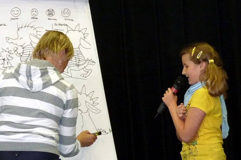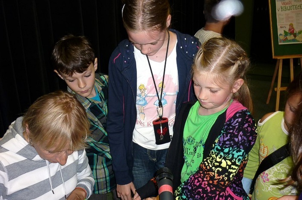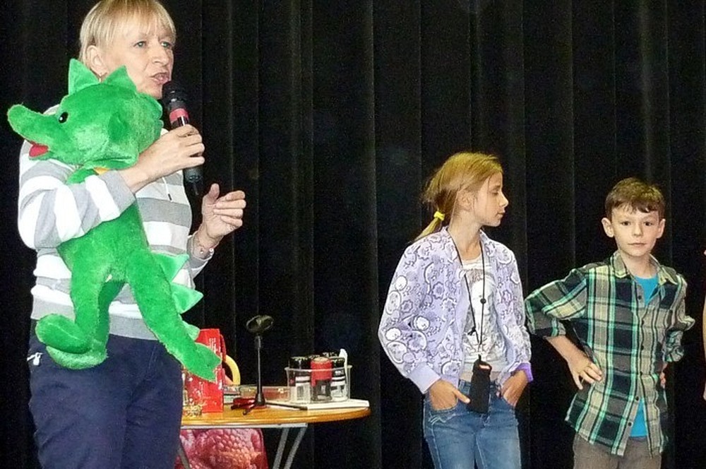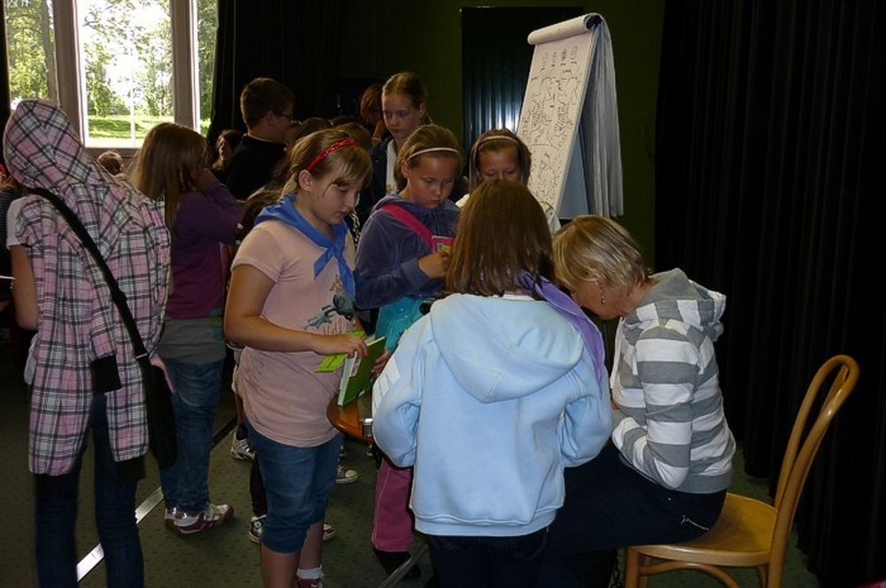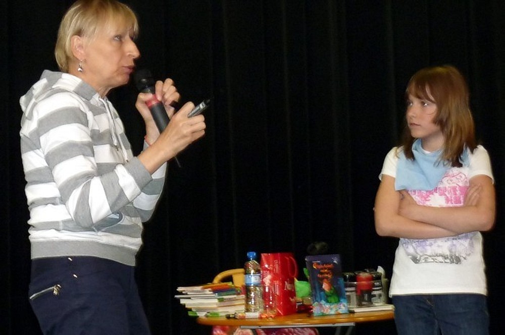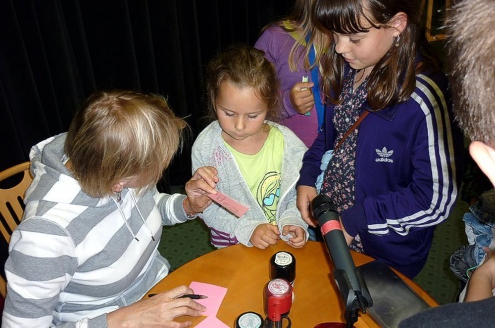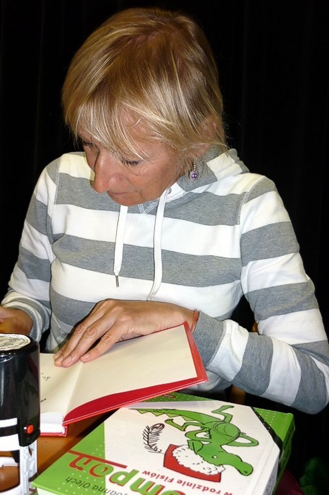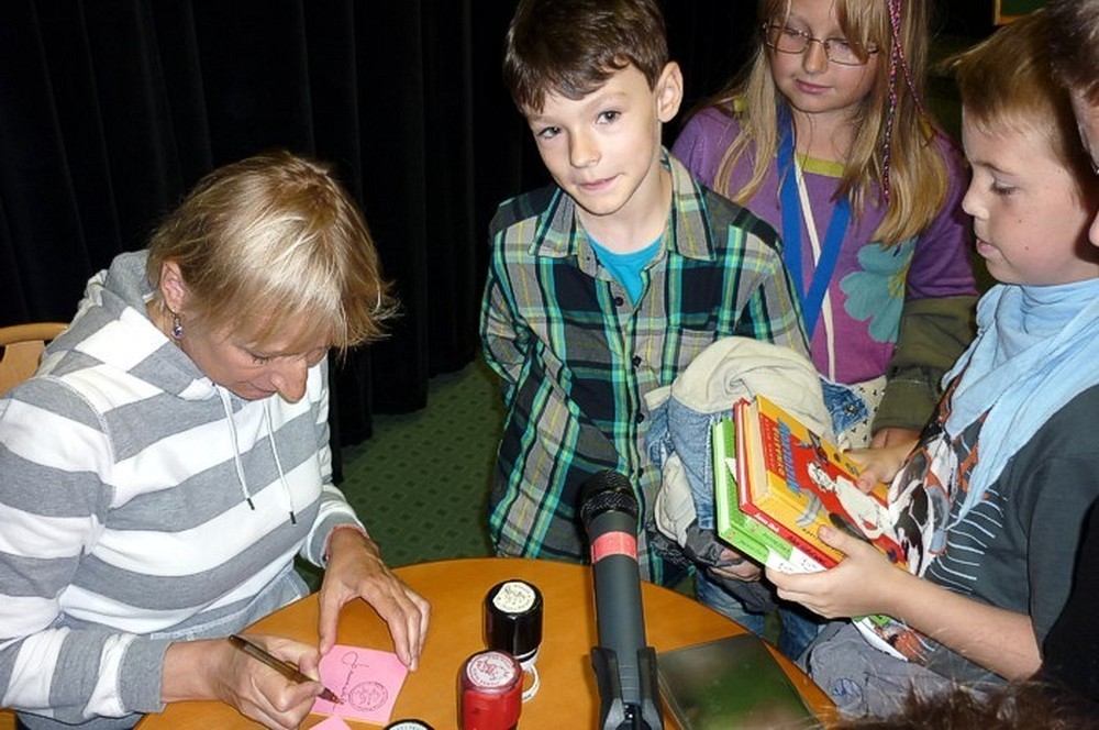 To fantastyczne spotkanie było wielkim konkursem dla dzieci i pisarki. Były pytania "mądre i głupie", na które autorka "Pompona w Krainie Fisiów" odpowiadała szczerze, czasami prosząc o potwierdzenie Papiszona, który siedział wśród widowni. Okolicznościowa pieczątka, autograf, książka pisarki do domowej biblioteczki i... pamiątkowa wspólna fotografia, to było miłe zakończenie niecodziennego spotkania literackiego.