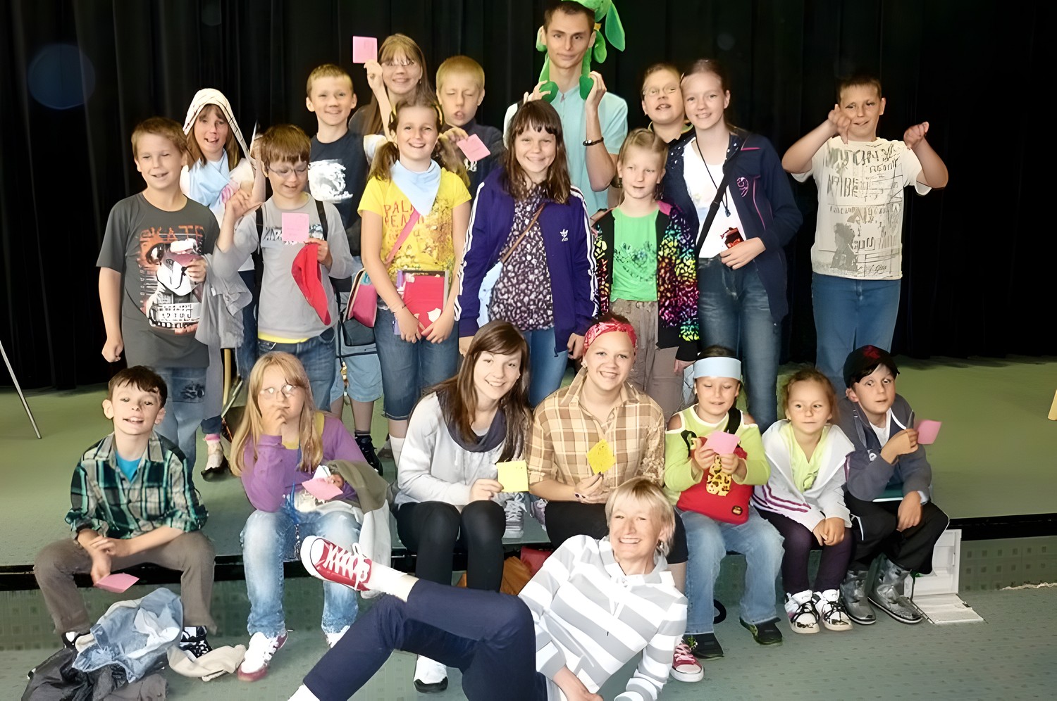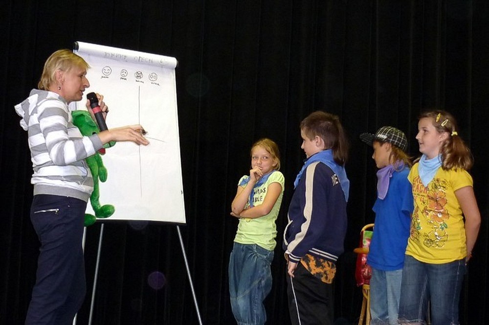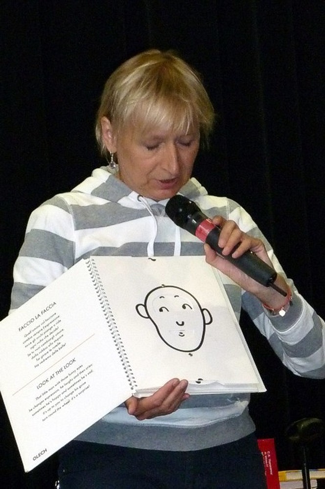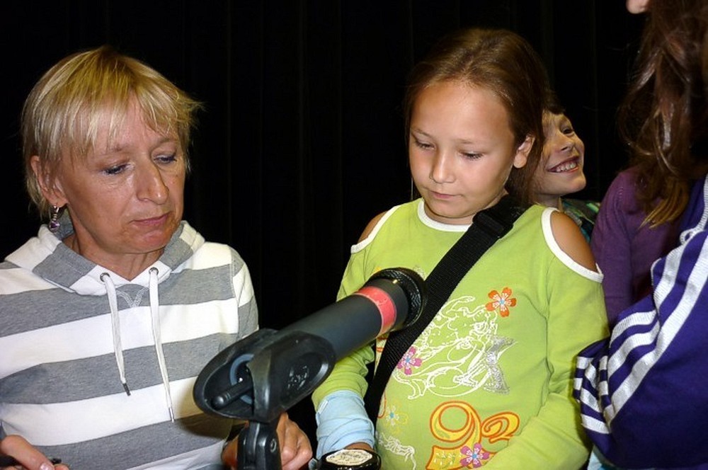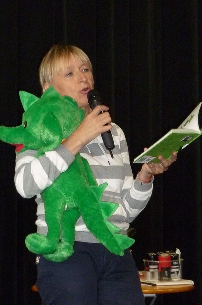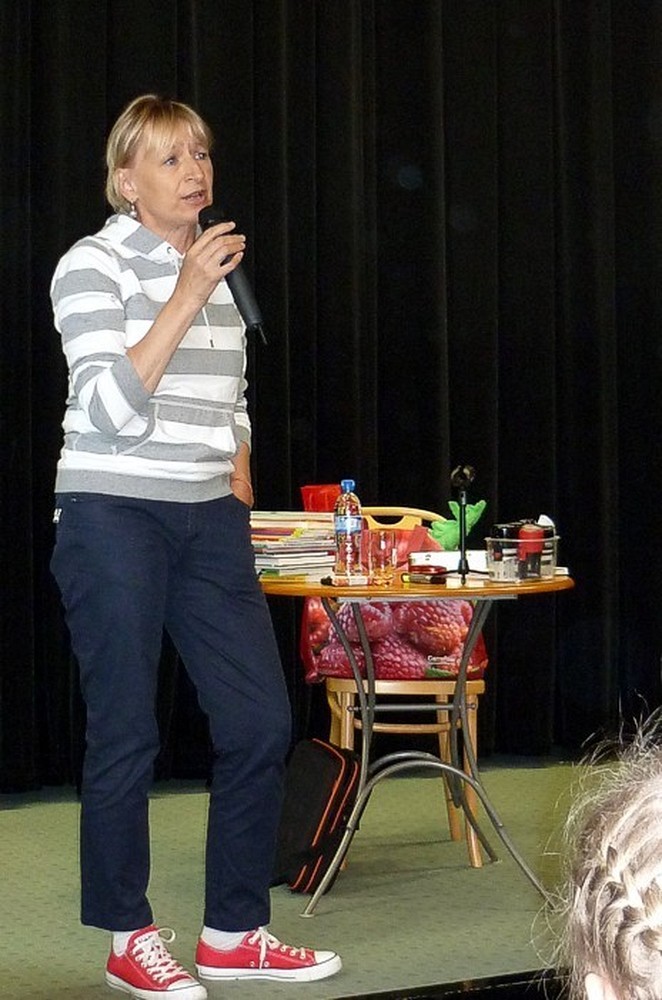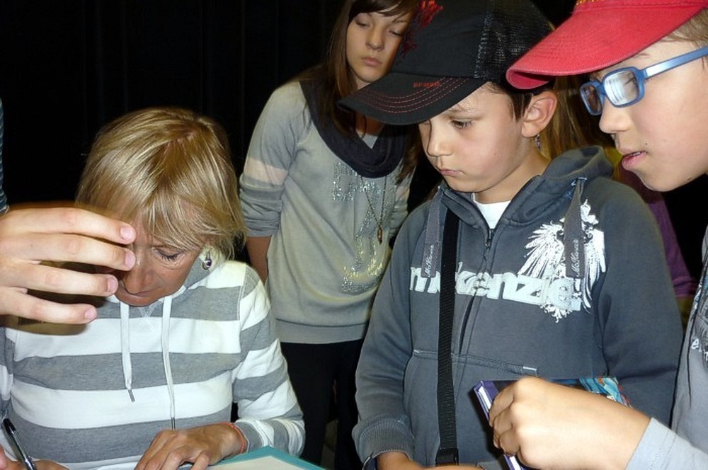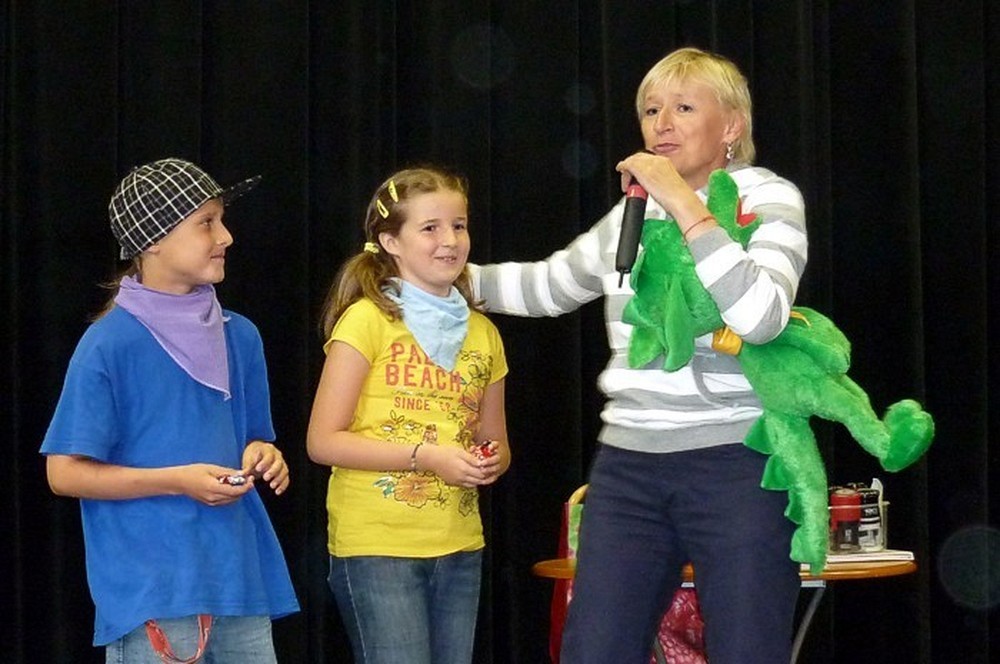 To fantastyczne spotkanie było wielkim konkursem dla dzieci i pisarki. Były pytania "mądre i głupie", na które autorka "Pompona w Krainie Fisiów" odpowiadała szczerze, czasami prosząc o potwierdzenie Papiszona, który siedział wśród widowni. Okolicznościowa pieczątka, autograf, książka pisarki do domowej biblioteczki i... pamiątkowa wspólna fotografia, to było miłe zakończenie niecodziennego spotkania literackiego.