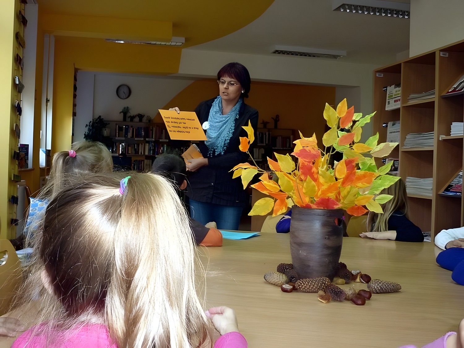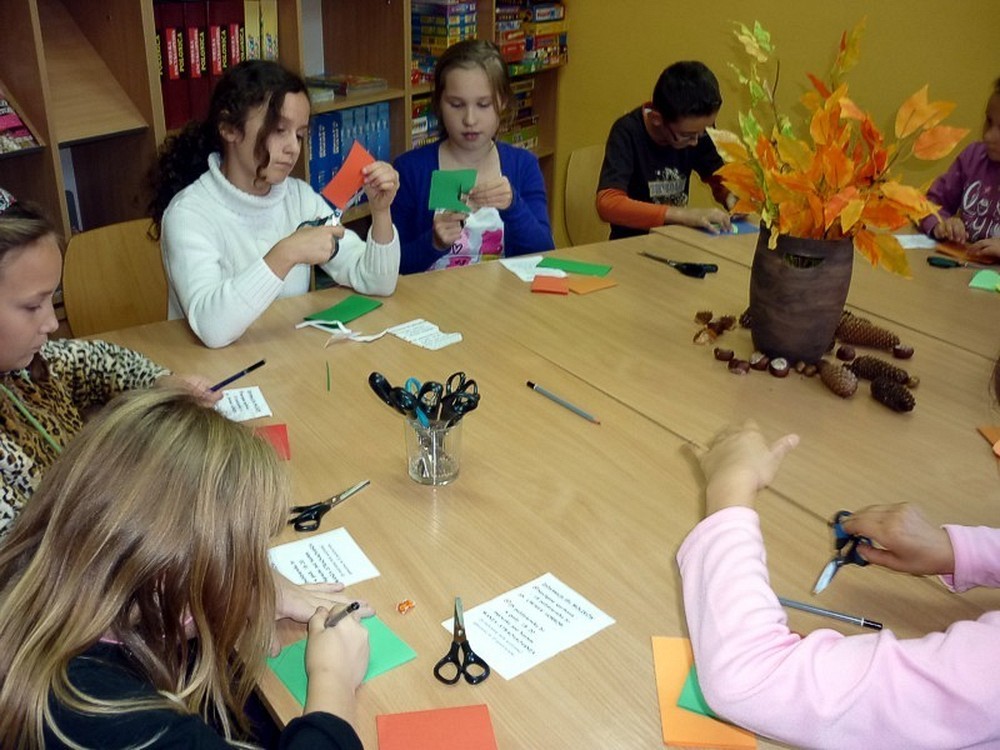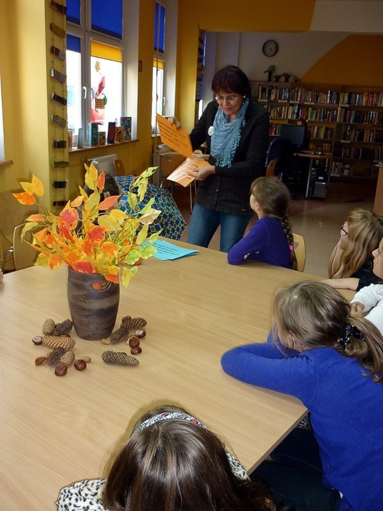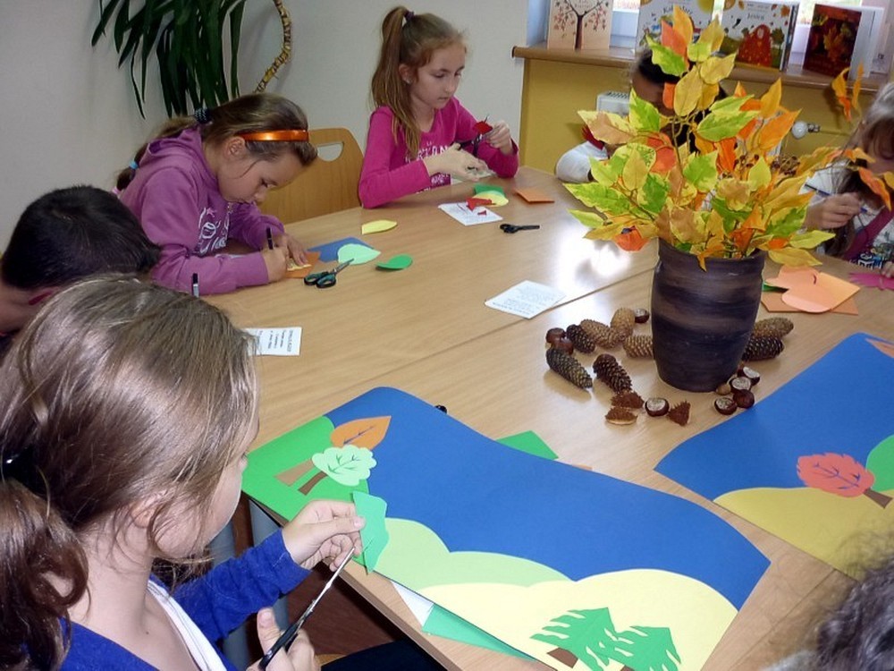 W piątkowe popołudnie - 27 września - w naszej czytelni było jesiennie i... poetycko. Czytanie wierszy, zgadywanki, rymowanki i wesoła zabawa w "Kałużystów", wypełniły część naszego spotkania. A w finale... z wykonanych przez dzieci kolorowych jesiennych liści, powstały fantazyjne pejzaże.