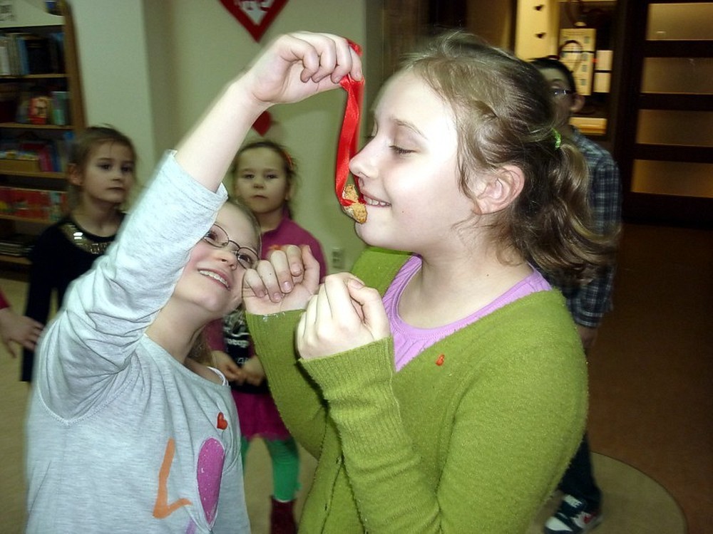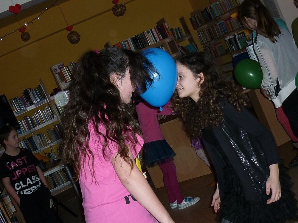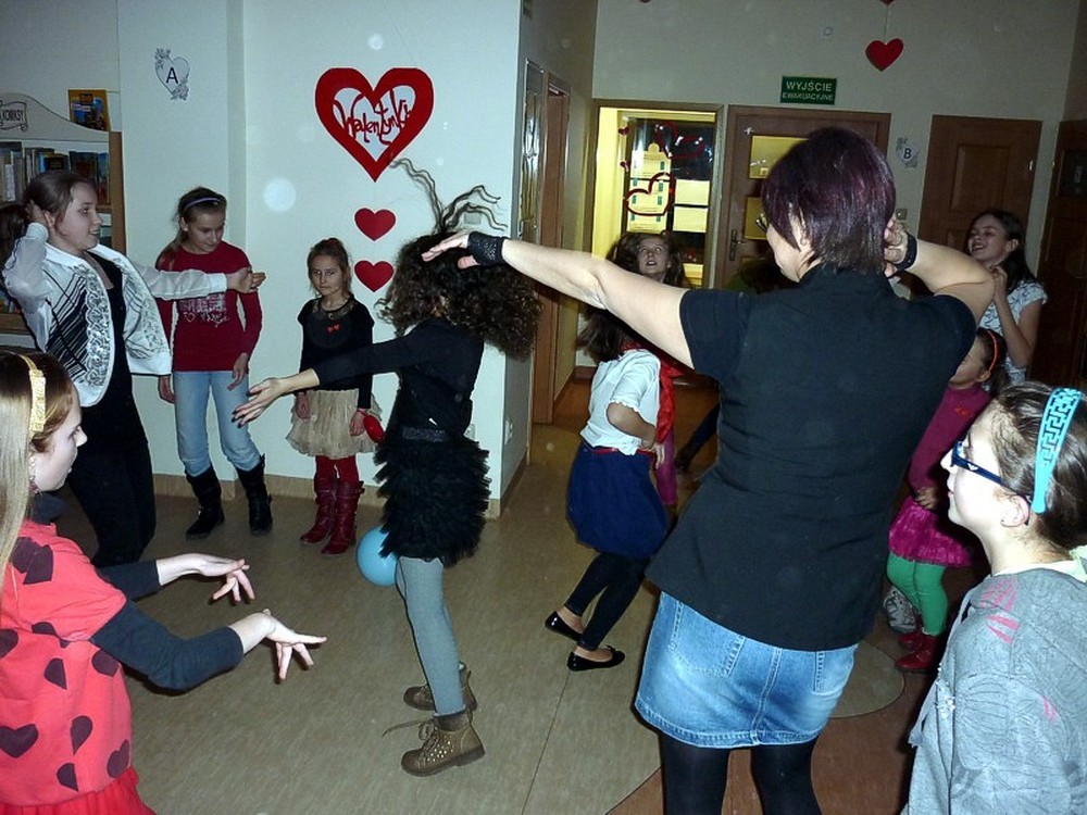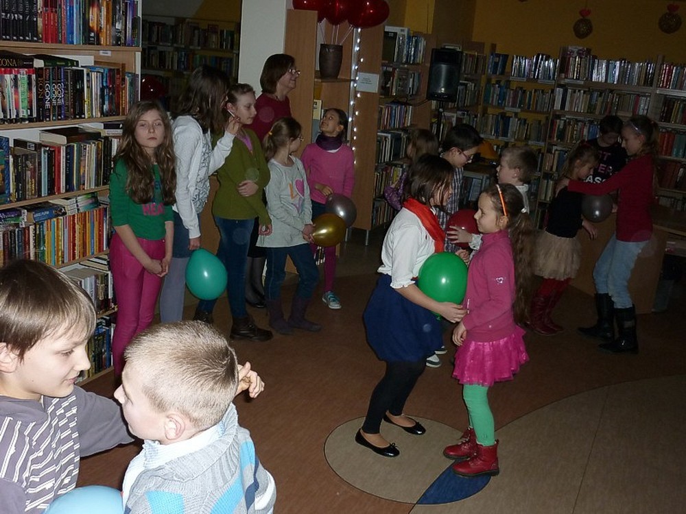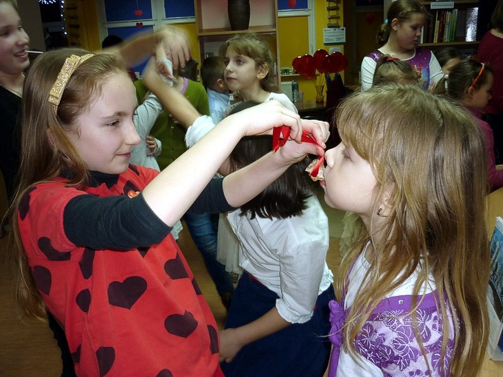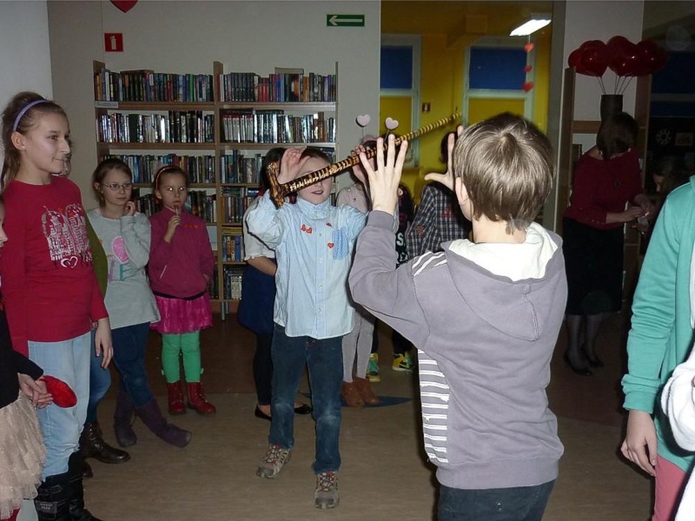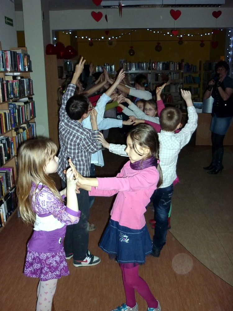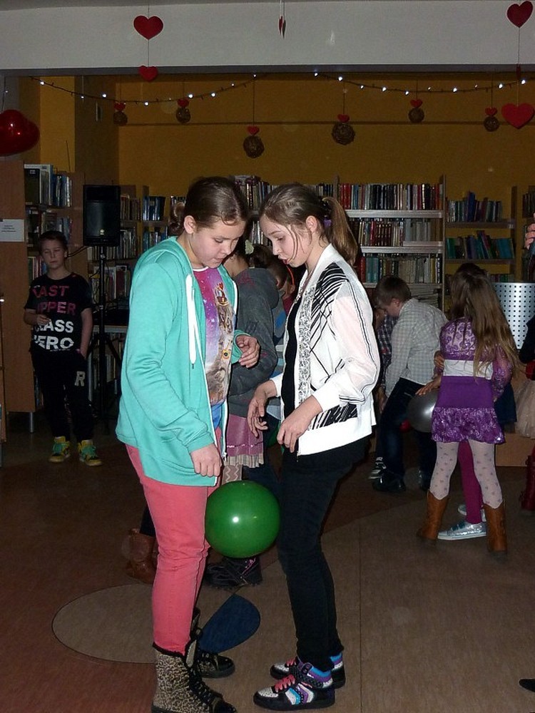 W piątek - 14 lutego - w walentynkowej scenerii, bawili się nasi najmłodsi czytelnicy. Program spotkania wypełniały szalone konkurencje i najlepsza muzyka. Oryginalne zabawy sprawiły wszystkim wielką radość oraz pobudziły sportowego ducha rywalizacji. Miłośnicy tańca góralskiego mogli wykazać się w "zbójnickim", znawcy piosenek w konkursie "Jaka to melodia", a łasuchy skosztować piernika na wstążce i cukierka "po chińsku". Za swoje talenty uczestnicy zdobywali punkty w postaci serduszkowych nalepek. Dzieci z największą liczbą serduszek obdarowałyśmy tytułami Walentynkowej Księżniczki i Księcia Karnawału oraz drobnymi nagrodami.
