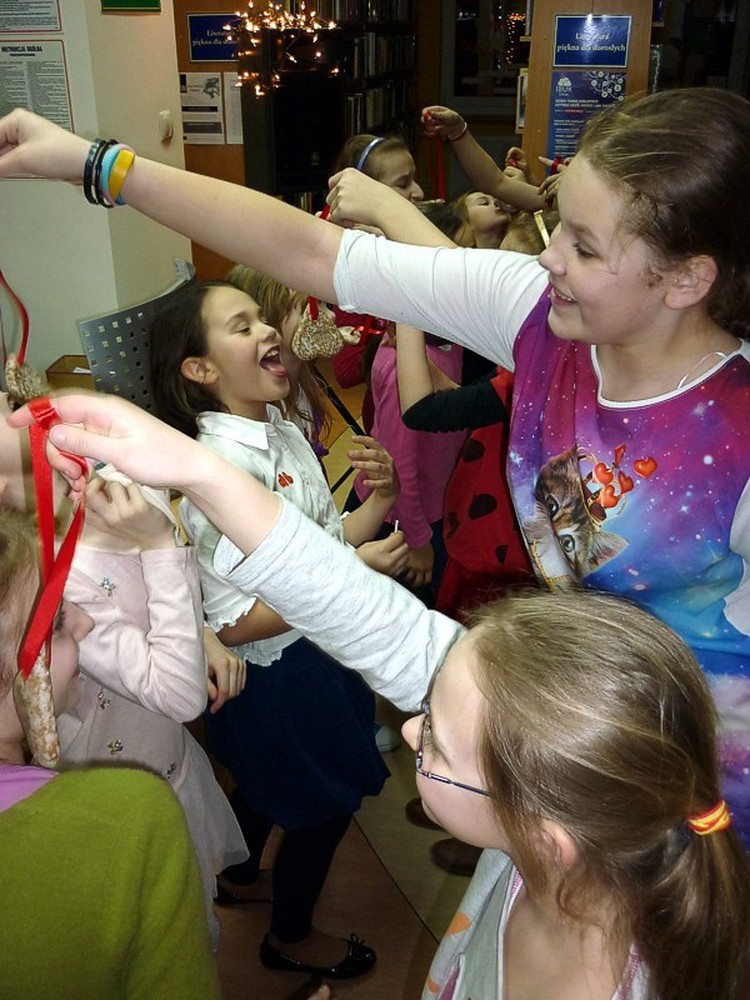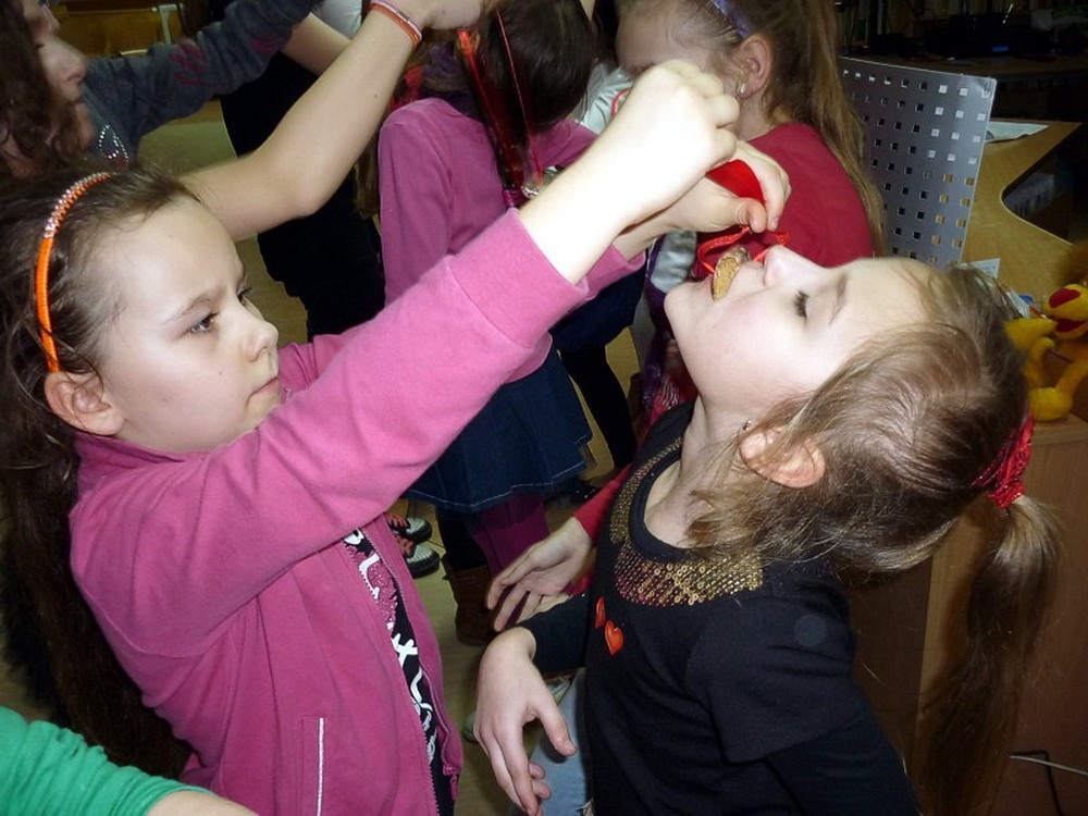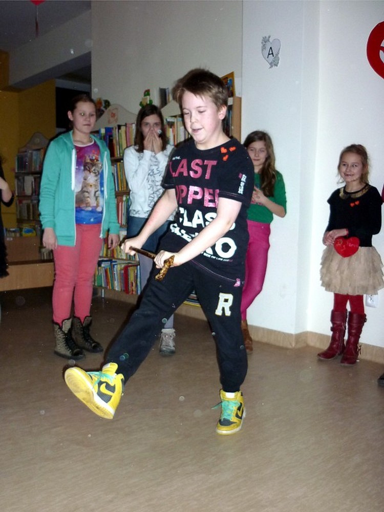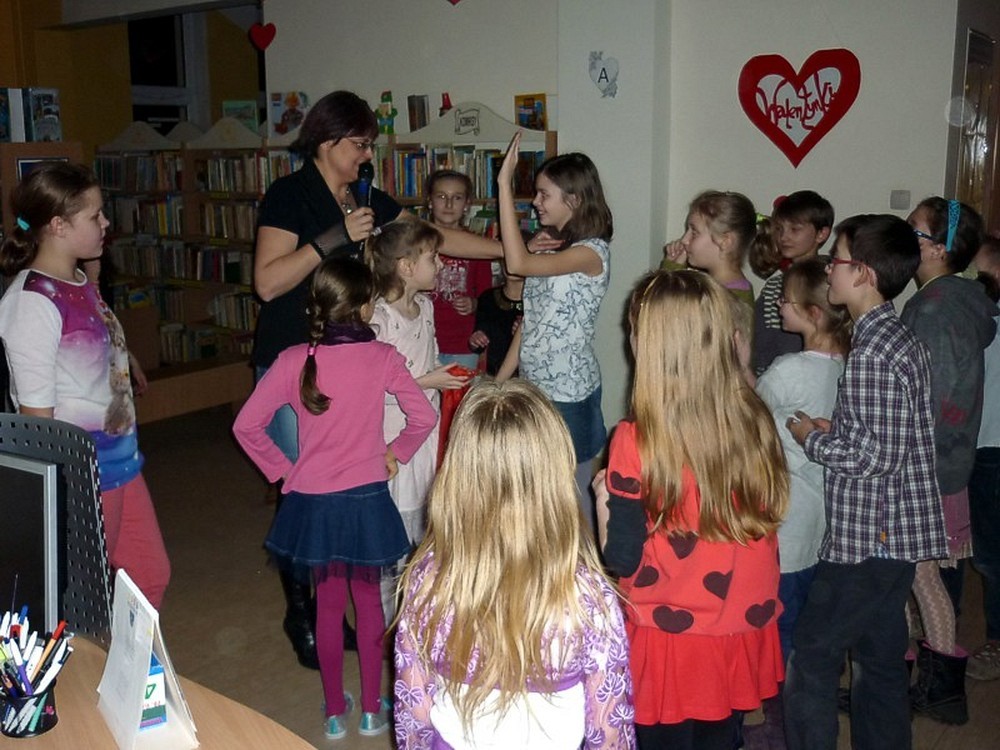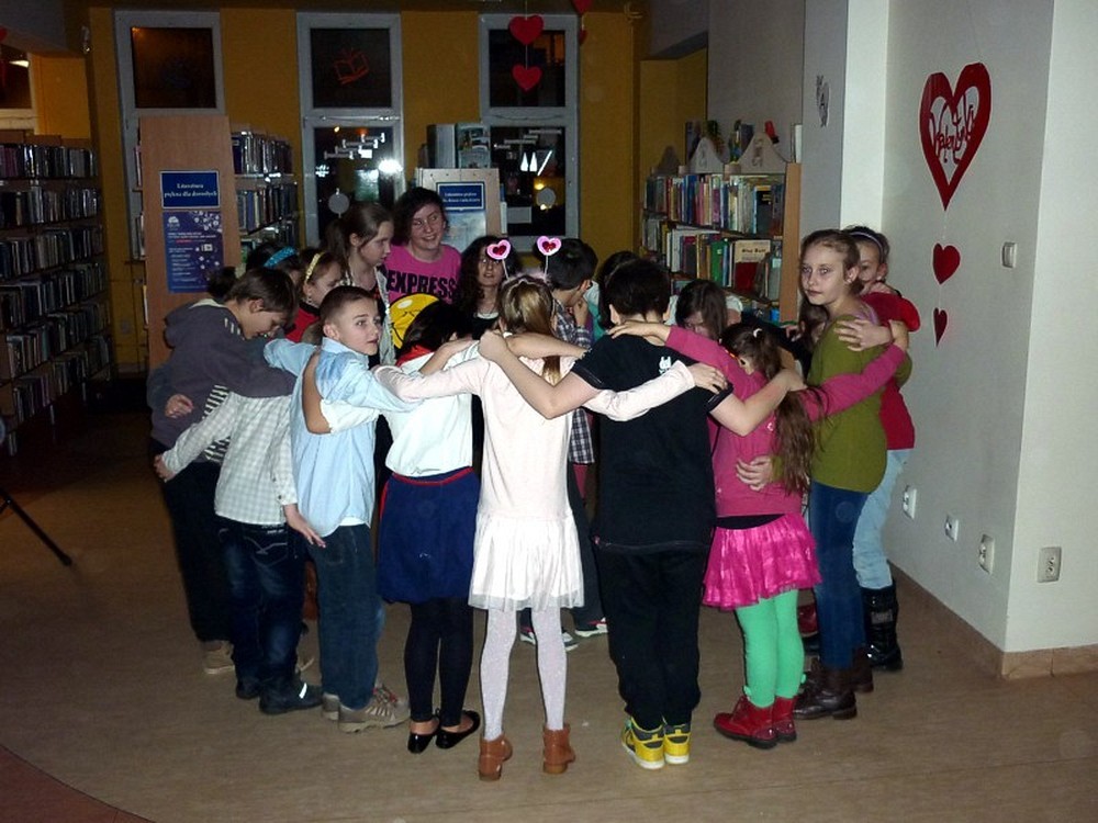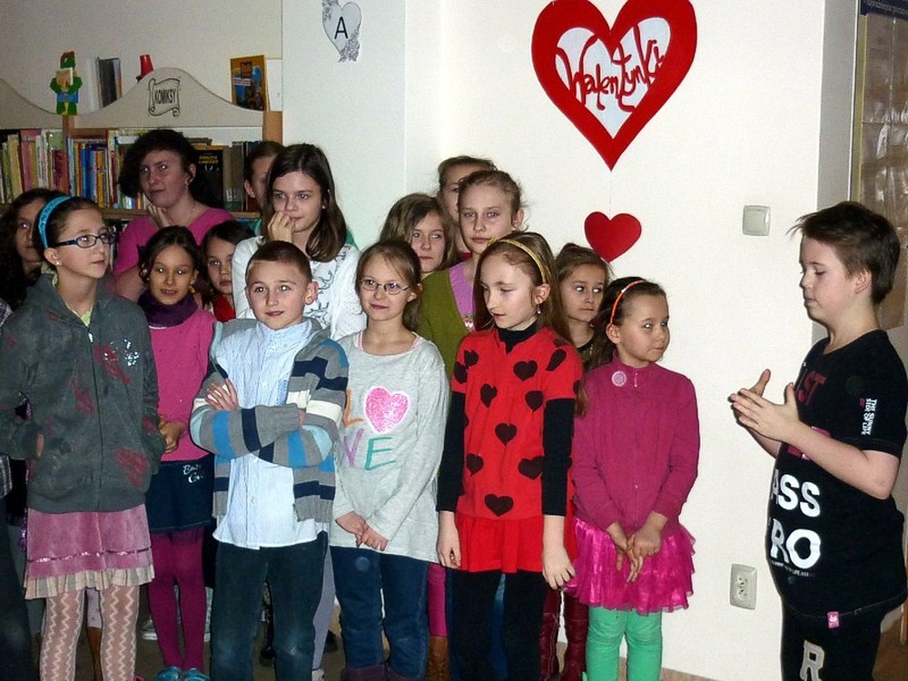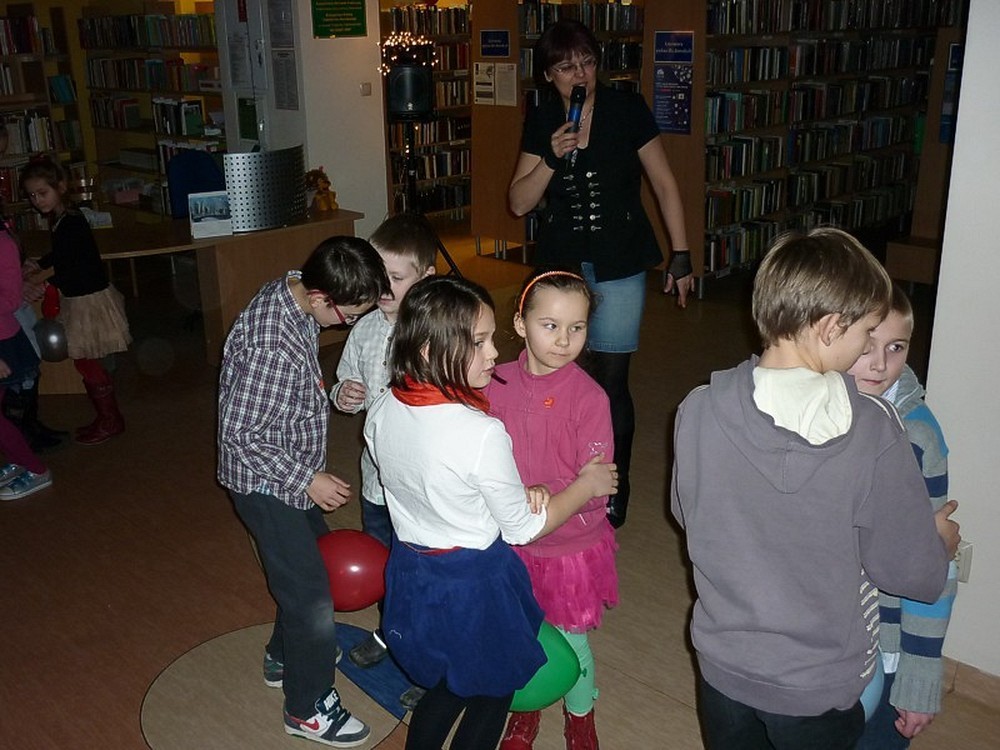 W piątek - 14 lutego - w walentynkowej scenerii, bawili się nasi najmłodsi czytelnicy. Program spotkania wypełniały szalone konkurencje i najlepsza muzyka. Oryginalne zabawy sprawiły wszystkim wielką radość oraz pobudziły sportowego ducha rywalizacji. Miłośnicy tańca góralskiego mogli wykazać się w "zbójnickim", znawcy piosenek w konkursie "Jaka to melodia", a łasuchy skosztować piernika na wstążce i cukierka "po chińsku". Za swoje talenty uczestnicy zdobywali punkty w postaci serduszkowych nalepek. Dzieci z największą liczbą serduszek obdarowałyśmy tytułami Walentynkowej Księżniczki i Księcia Karnawału oraz drobnymi nagrodami.