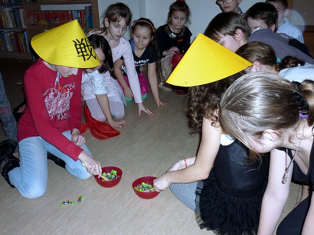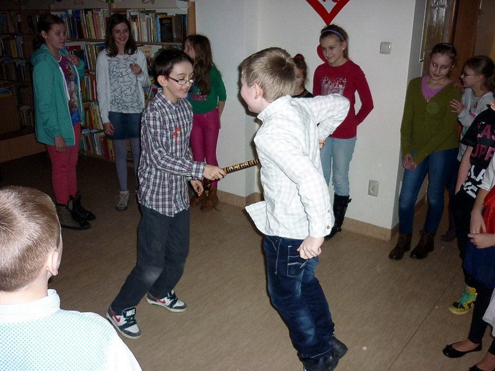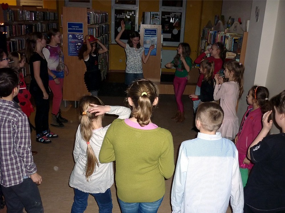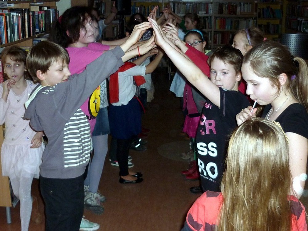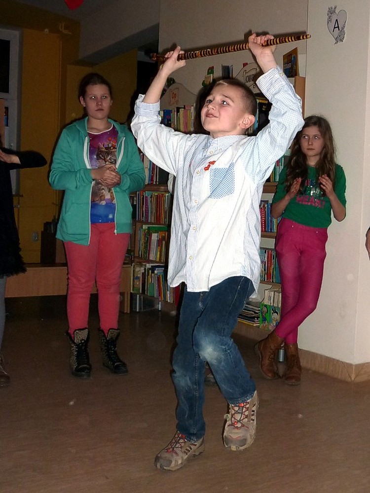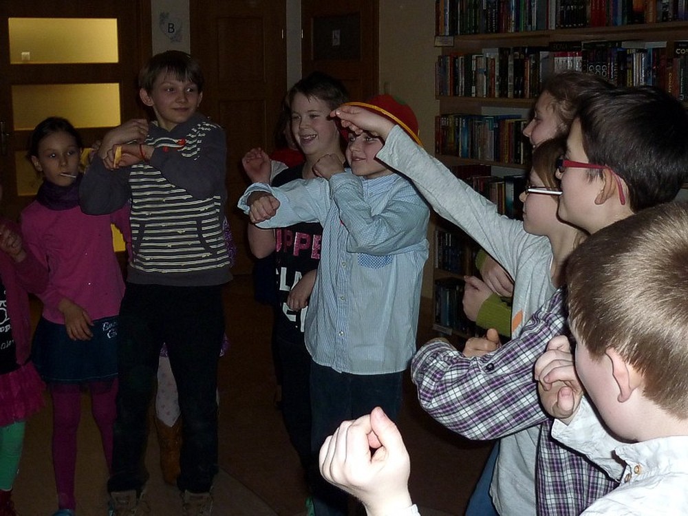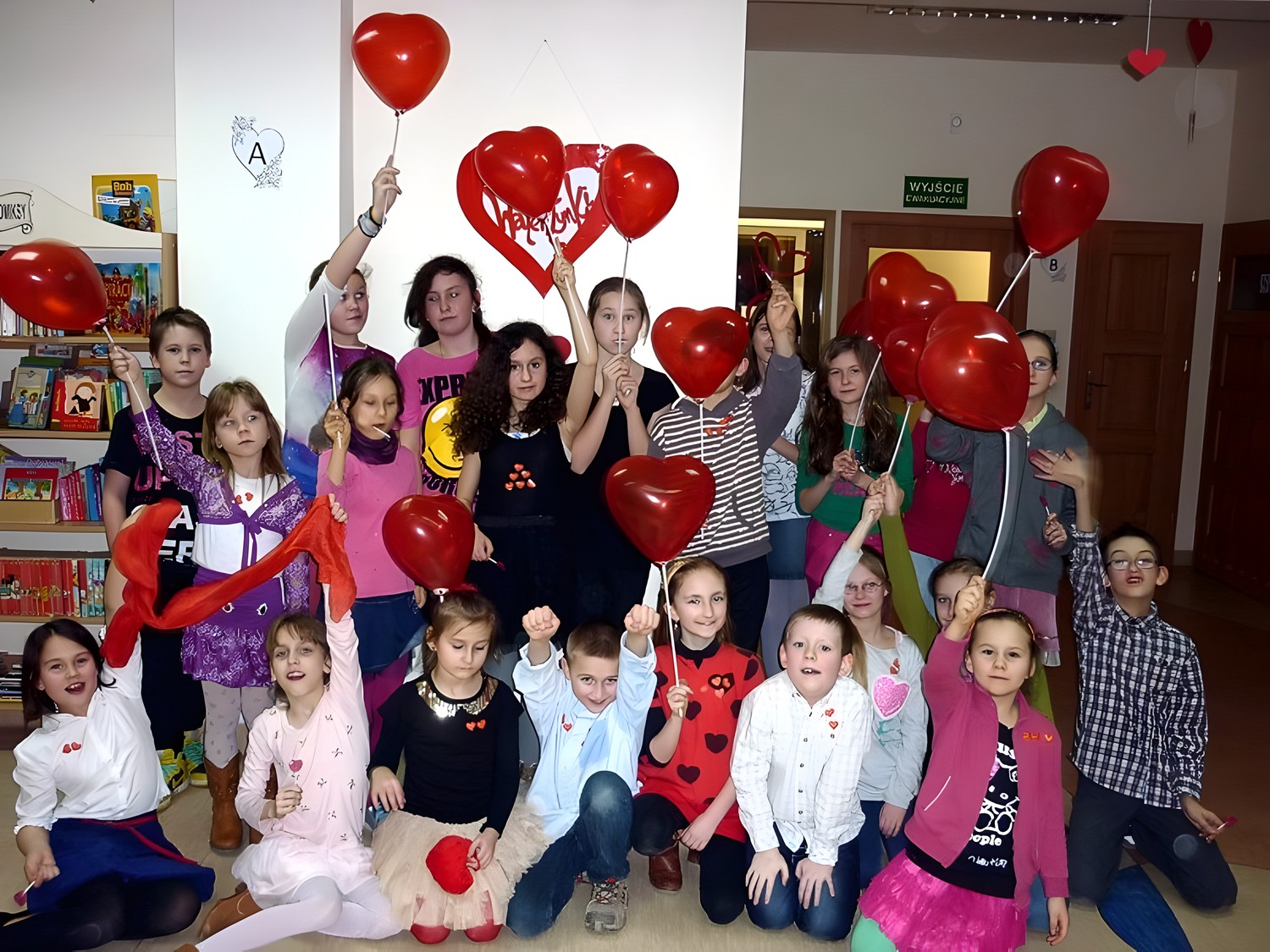 W piątek - 14 lutego - w walentynkowej scenerii, bawili się nasi najmłodsi czytelnicy. Program spotkania wypełniały szalone konkurencje i najlepsza muzyka. Oryginalne zabawy sprawiły wszystkim wielką radość oraz pobudziły sportowego ducha rywalizacji. Miłośnicy tańca góralskiego mogli wykazać się w "zbójnickim", znawcy piosenek w konkursie "Jaka to melodia", a łasuchy skosztować piernika na wstążce i cukierka "po chińsku". Za swoje talenty uczestnicy zdobywali punkty w postaci serduszkowych nalepek. Dzieci z największą liczbą serduszek obdarowałyśmy tytułami Walentynkowej Księżniczki i Księcia Karnawału oraz drobnymi nagrodami.