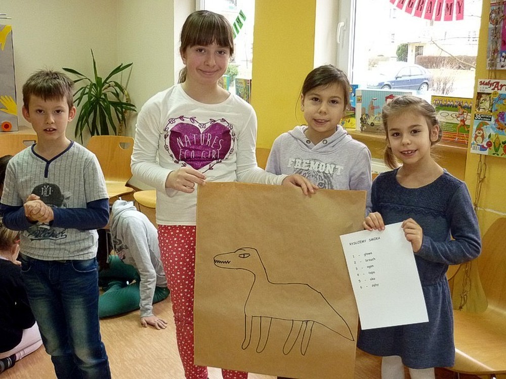Ściganie smoczego ogona, sprawdzanie wiedzy w SMOCZYM QUIZIE i ćwiczenie wyobraźni podczas rysowania smoczego wizerunku wypełniły nam czas.