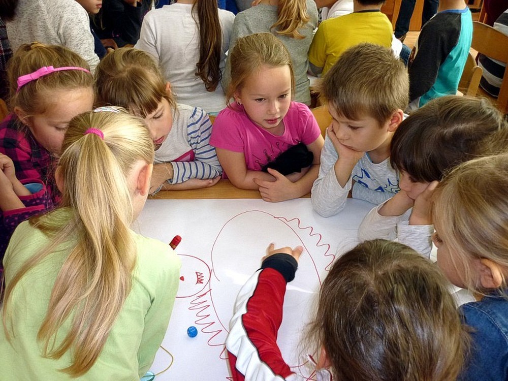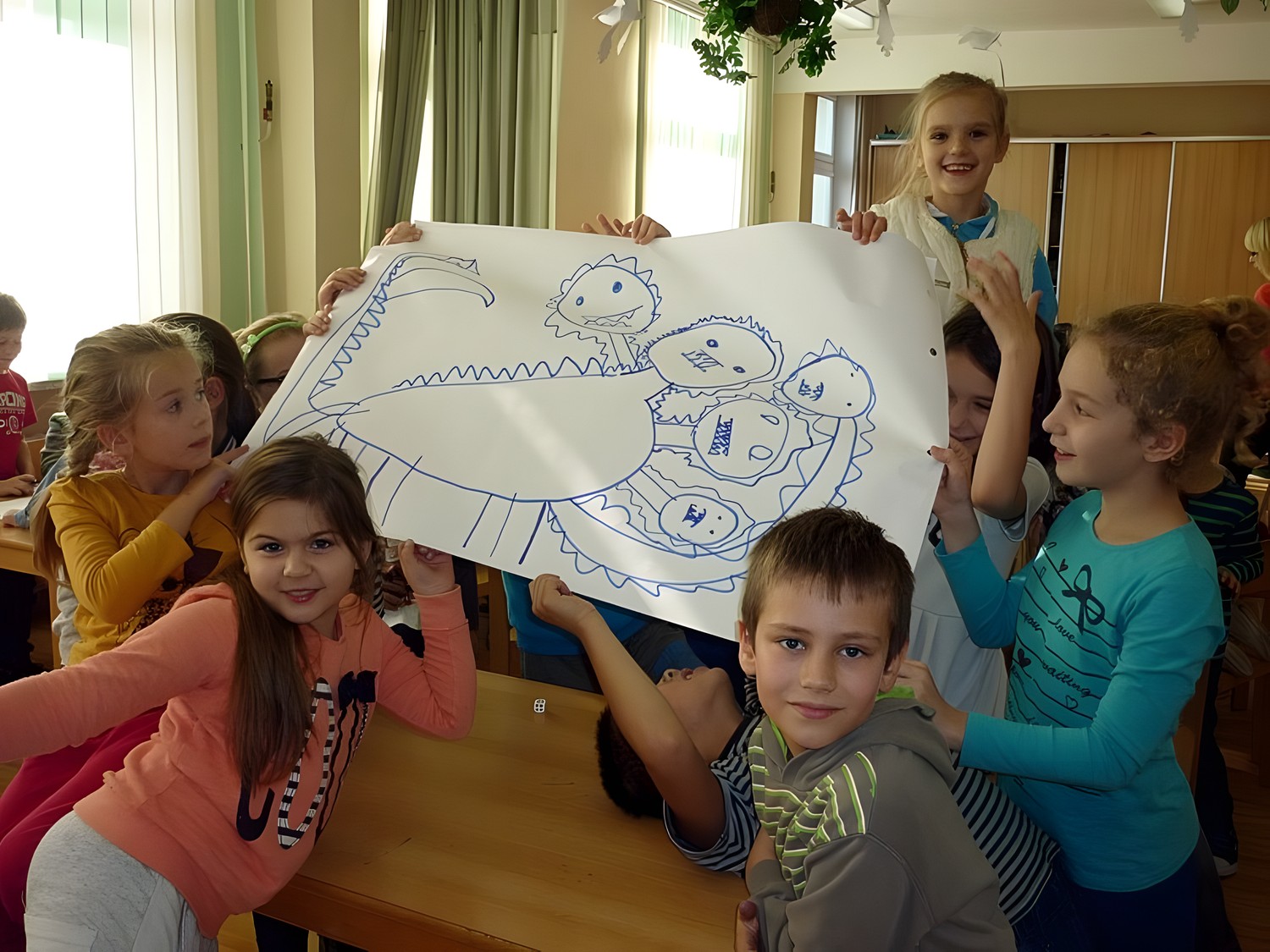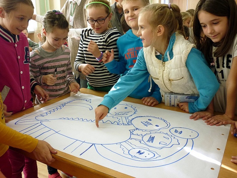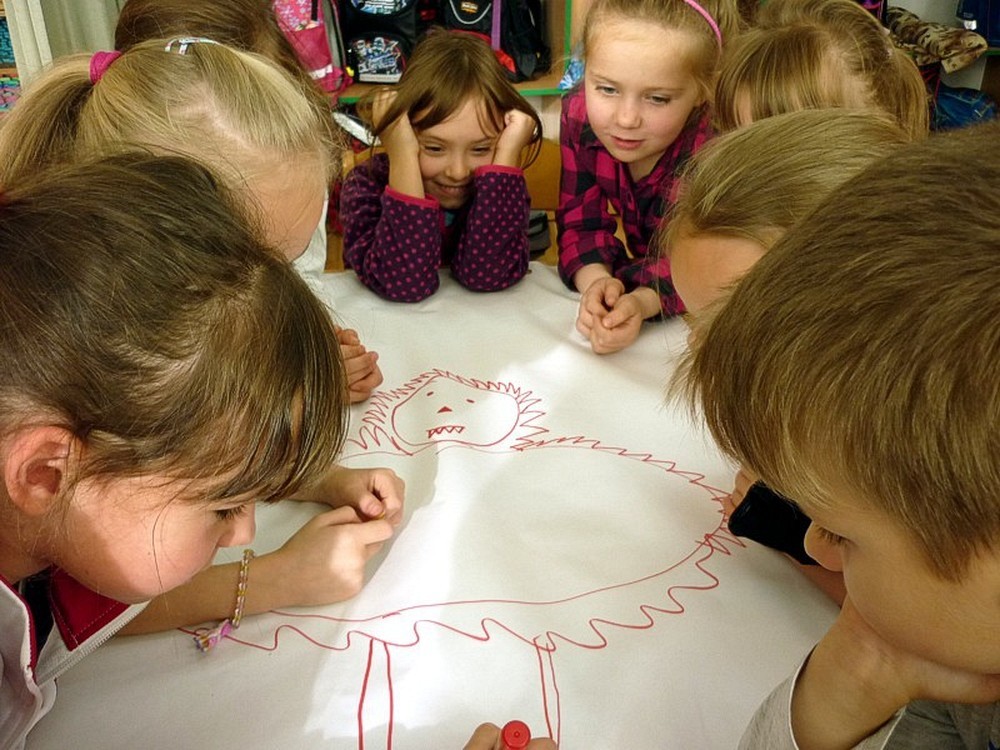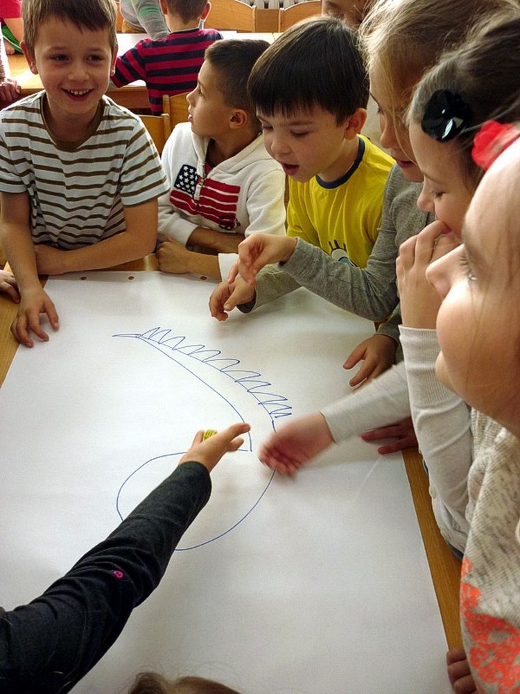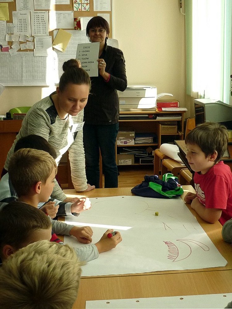 Natomiast Pani Wiola - zaproponowała grupowe rysowanie smoka, z użyciem kostki do gry. Każda cyfra na kostce oznaczała konkretną część ciała tego stwora.
