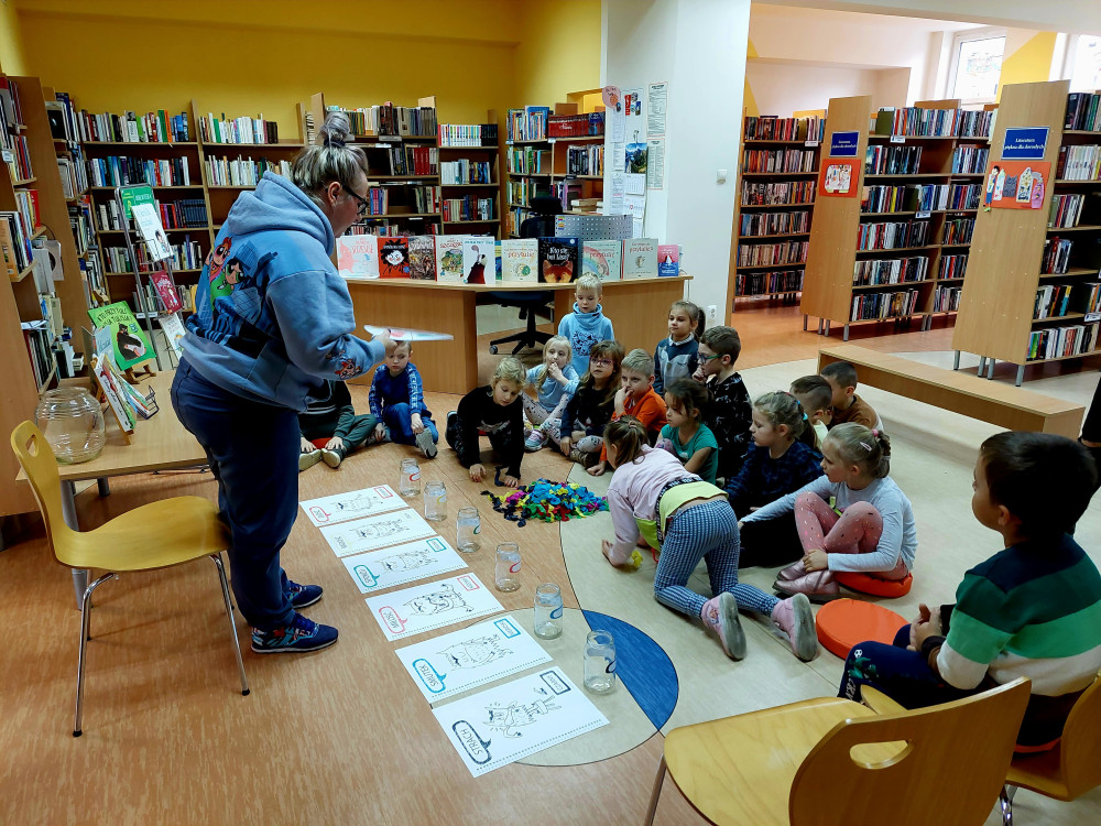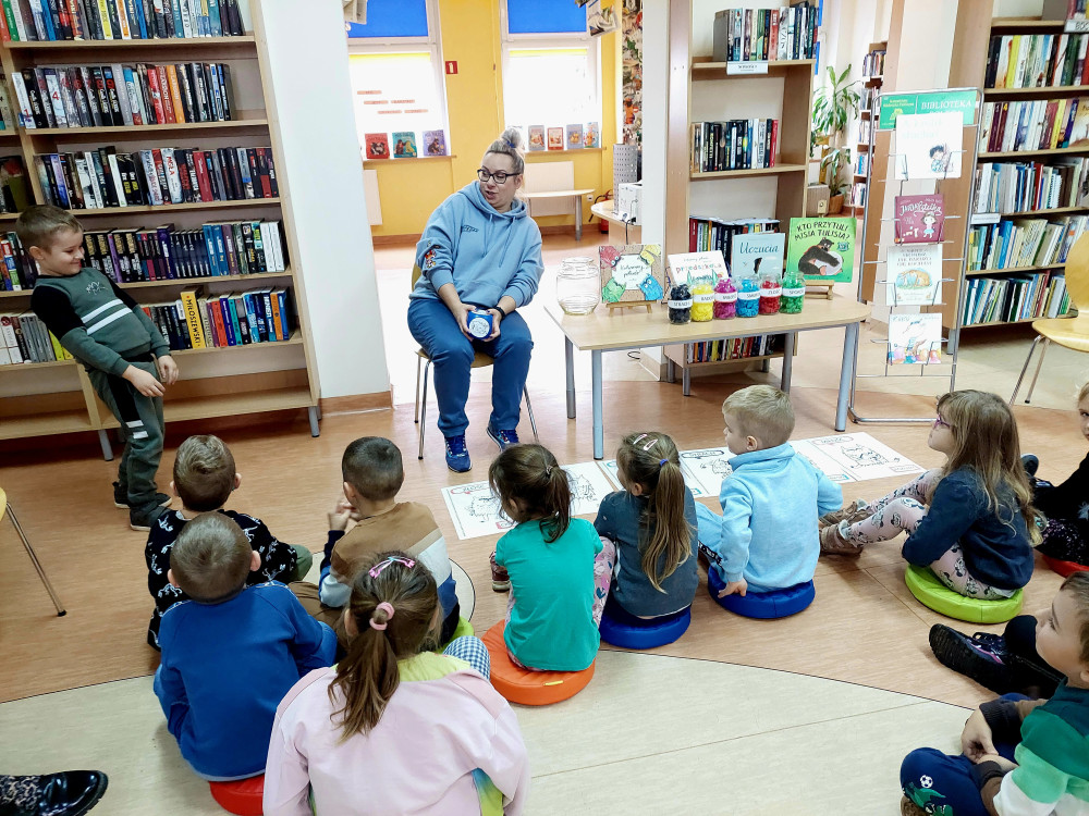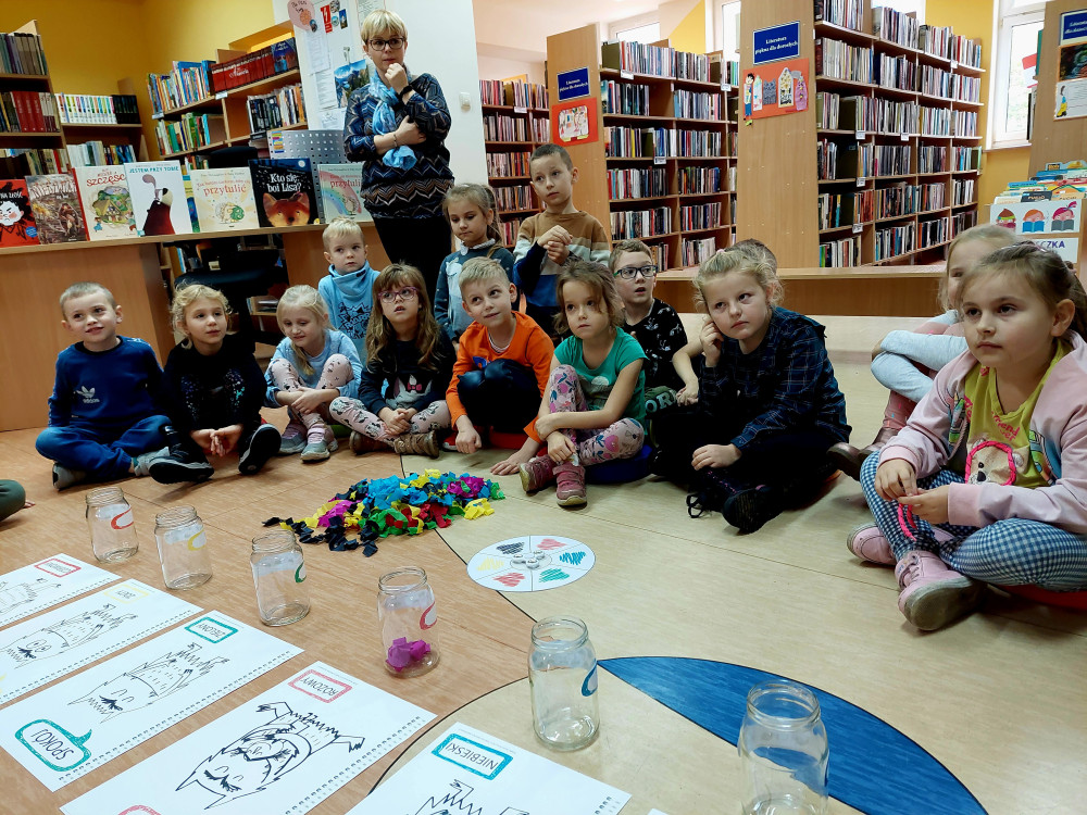 10 listopada dzieci z grupy "Sówki" wybrały się do biblioteki. Głównym celem naszej wycieczki było propagowanie czytelnictwa wśród najmłodszych dzieci i udział w zajęciach pt. " Kolorowy potwór- czyli wszystko o emocjach". Dzieci wysłuchały bajki o kolorowym potworze a następnie wzięły udział w różnych zabawach podczas których poznawały emocje: STRACH, ZŁOŚĆ, SMUTEK, SPOKÓJ, RADOŚĆ, MIŁOŚĆ. Każda z nich miała określony kolor i swój słoik. Dzieci chętnie odgrywały różne scenki, podczas których pokazywały wylosowane emocje oraz wypowiadały się o różnych sytuacjach, w których tak się czują. Na zakończenie tego sympatycznego spotkania nasza czytelniczka Zosia , która posiada już własną kartę biblioteczną wypożyczyła sobie książki do domu.