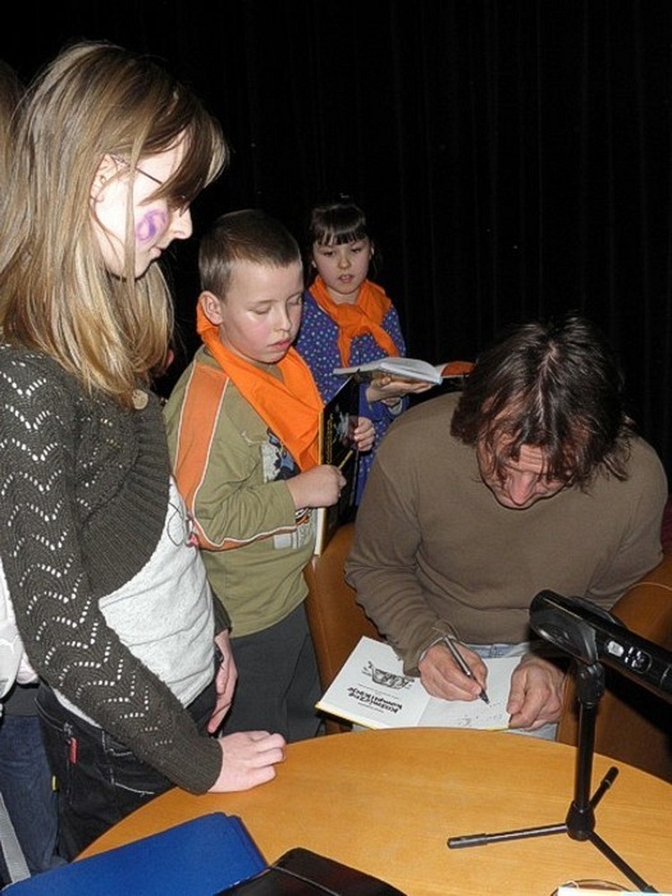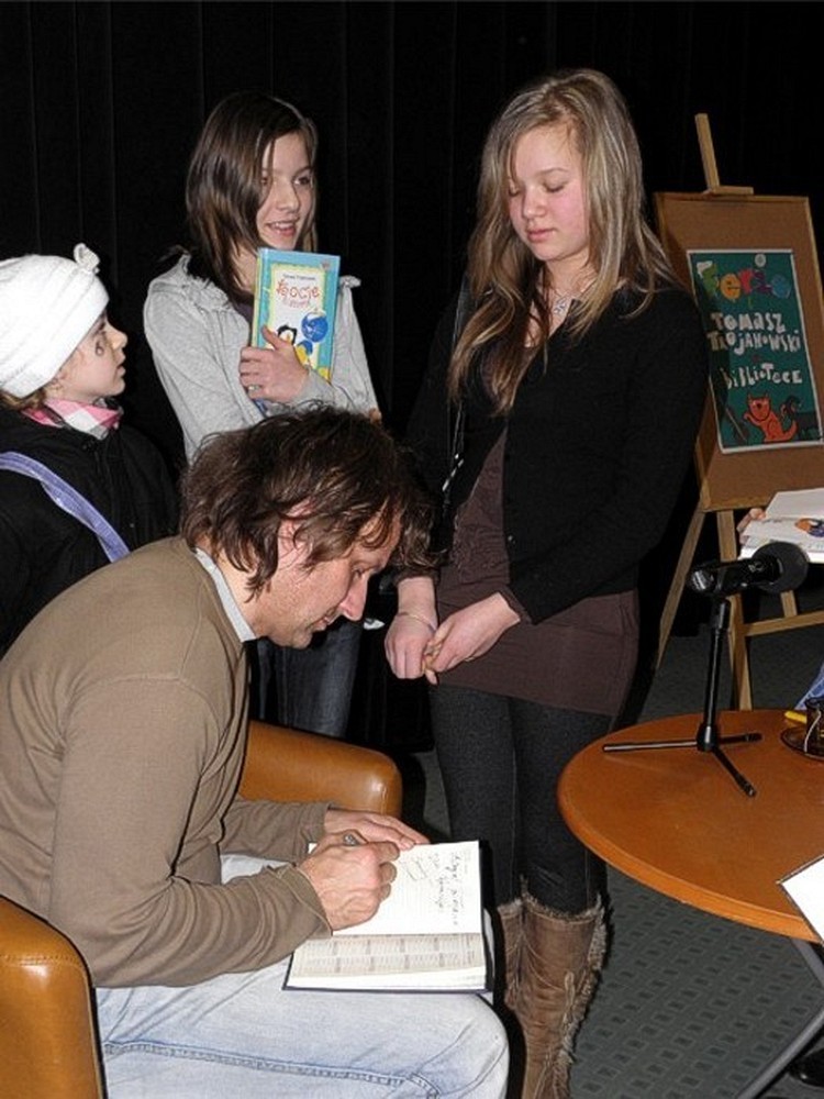 W środę 16 lutego, w sali kinowej Koszalińskiej Biblioteki Publicznej, uczestniczyliśmy w spotkaniu z pisarzem Tomaszem TROJANOWSKIM. Choć autor twierdził, ze nie lubi dzieci ani kotów, to jednak przybył na spotkanie do Koszalina.
