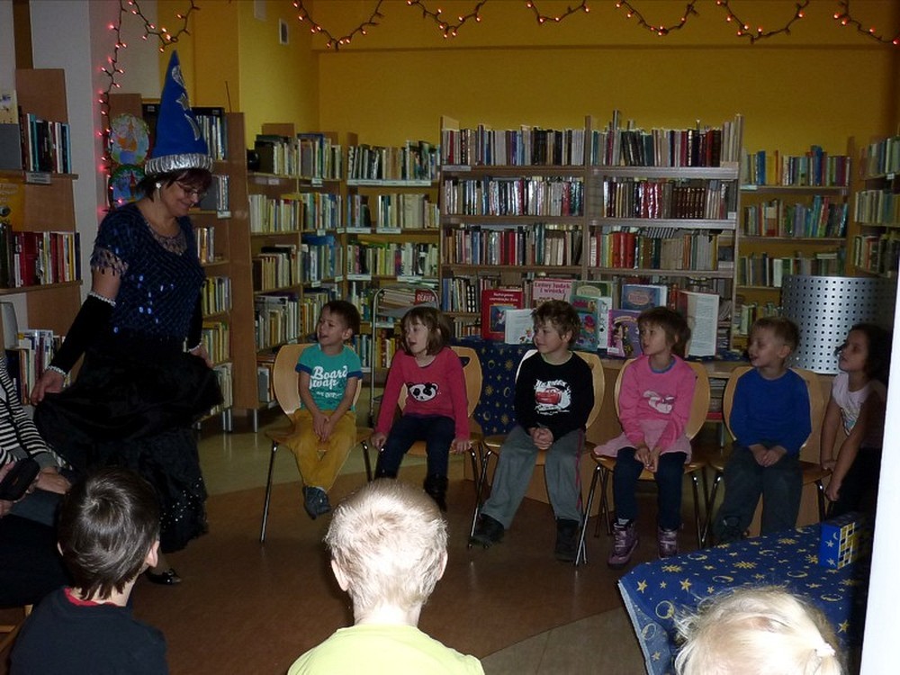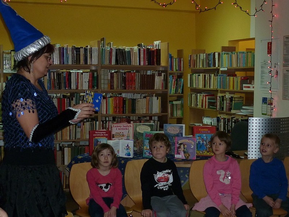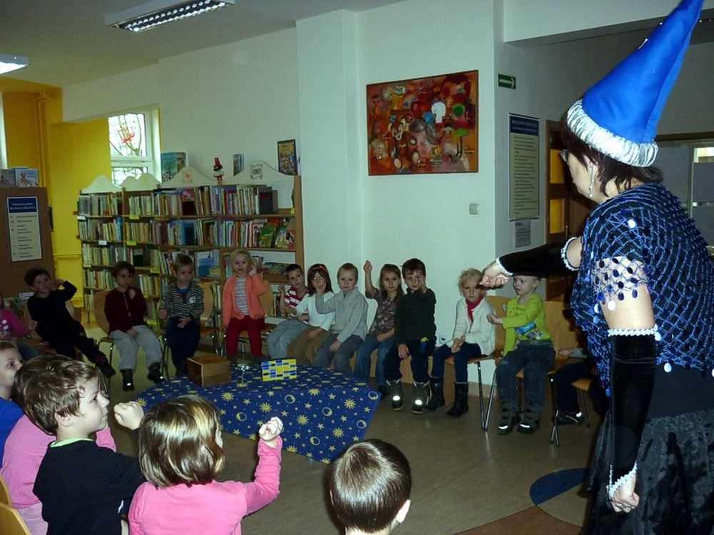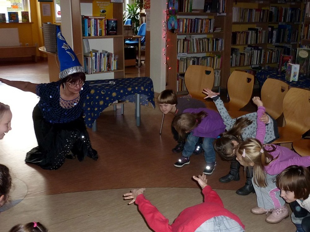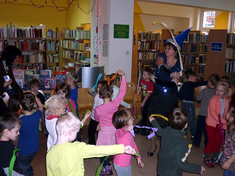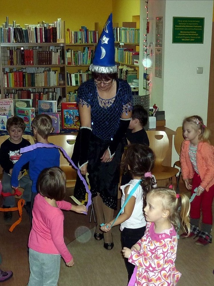 28 listopada przybyły do biblioteki "kociaki" czyli grupa pięciolatków. Były czarodziejskie bajki i andrzejkowe wróżby. Jednak najbardziej pasjonującą częścią spotkania okazał się pokaz czarowania i zamiana uczestników w różne postaci. Kiedy już wszyscy "uczniowie" Wróżki stali się znowu sobą, nastąpiło taneczne szaleństwo z magiczną wstęgą.