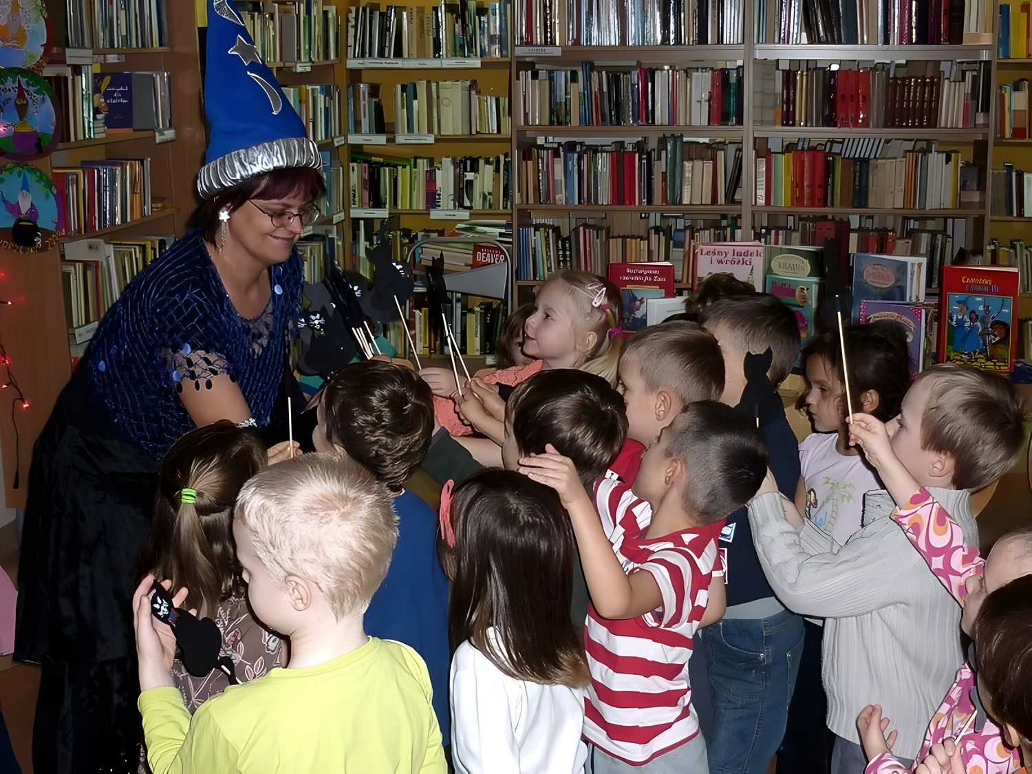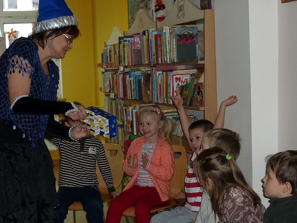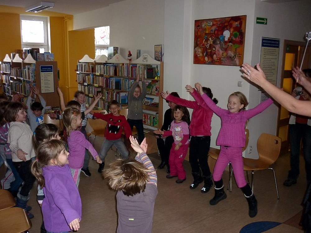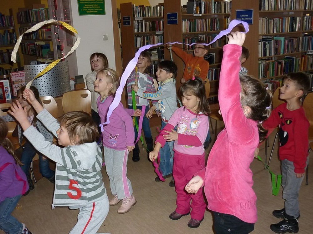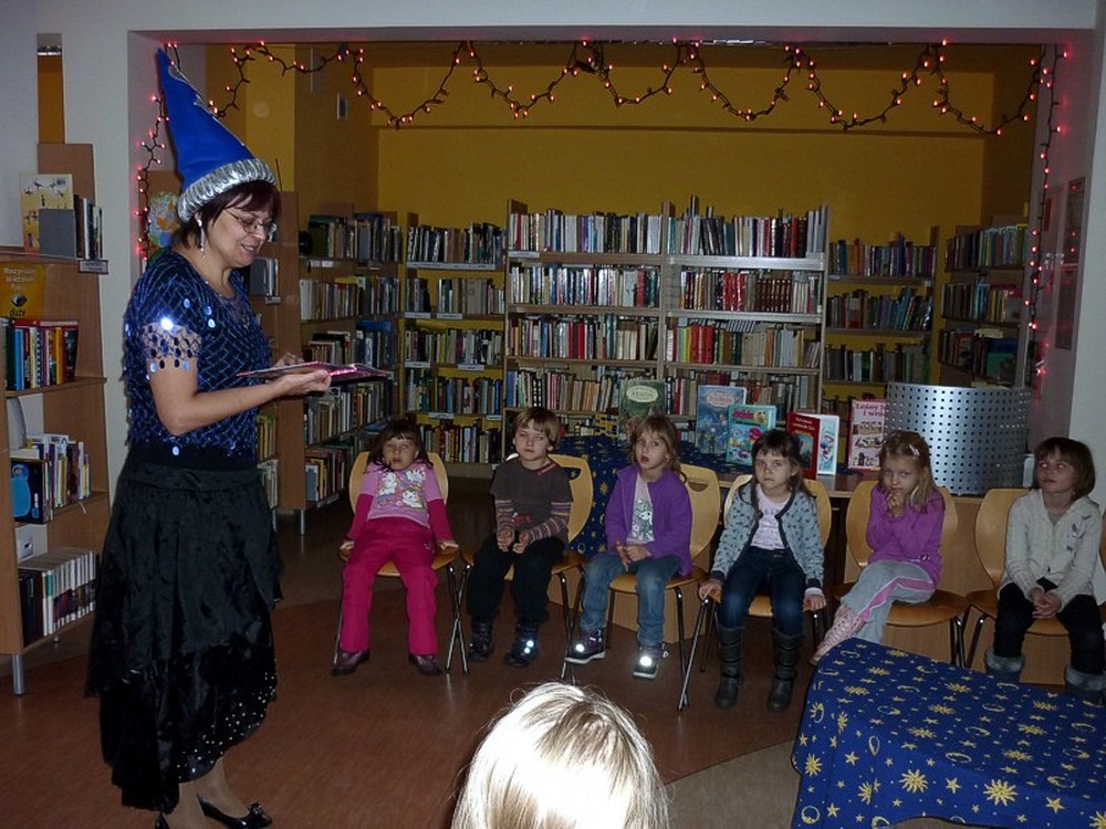 28 listopada przybyły do biblioteki "kociaki" czyli grupa pięciolatków. Były czarodziejskie bajki i andrzejkowe wróżby. Jednak najbardziej pasjonującą częścią spotkania okazał się pokaz czarowania i zamiana uczestników w różne postaci. Kiedy już wszyscy "uczniowie" Wróżki stali się znowu sobą, nastąpiło taneczne szaleństwo z magiczną wstęgą.